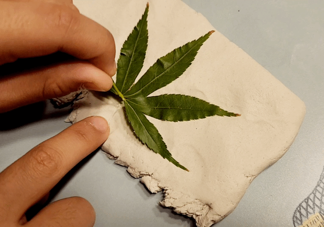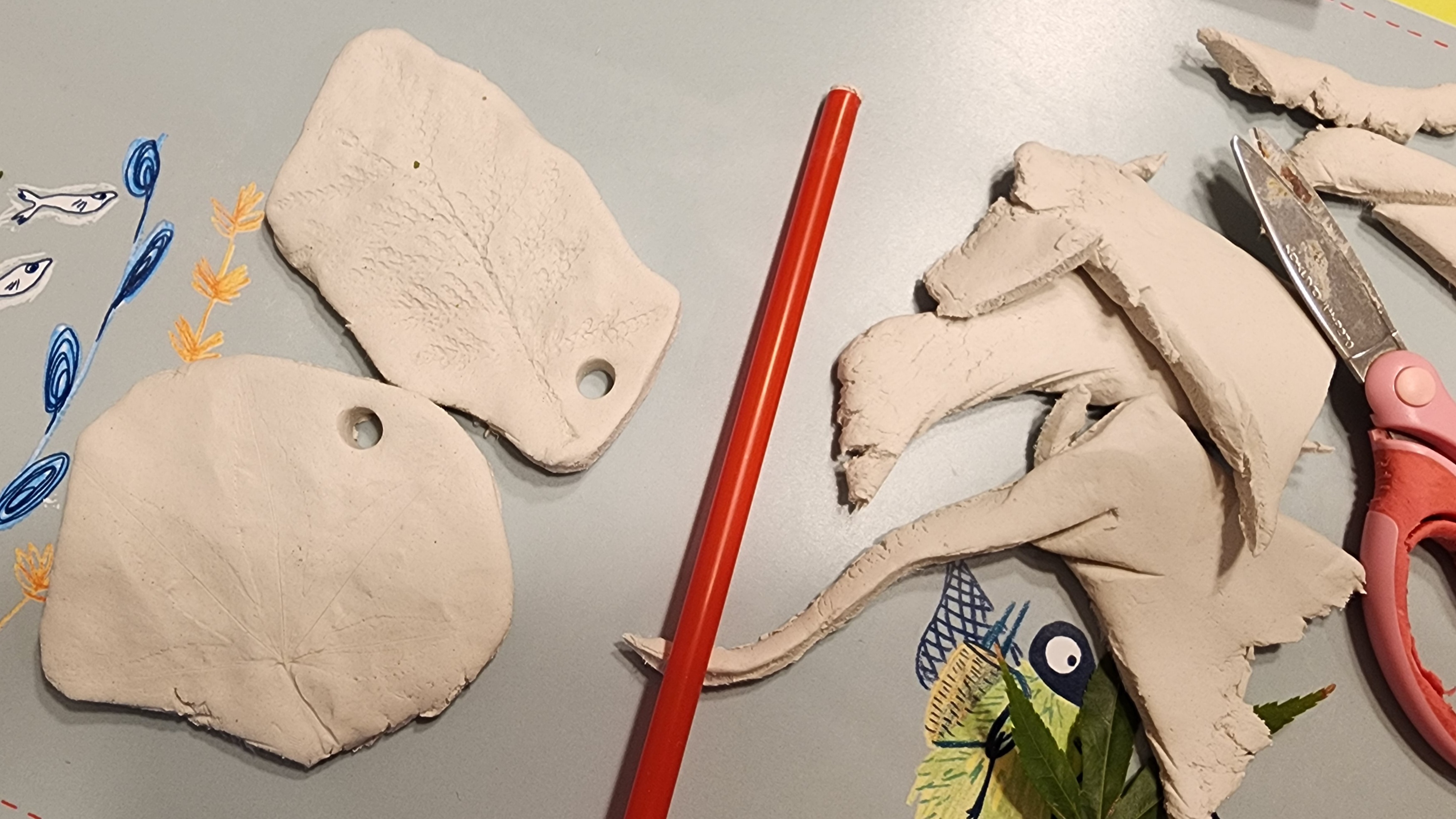 자연물을 점토에 올려 자국이 남도록 눌러준 다음 땡 하지 않고 자연물 모양대로 점토를 가위로 다음어주고 빨대로 구멍을 뚫어주었어요.