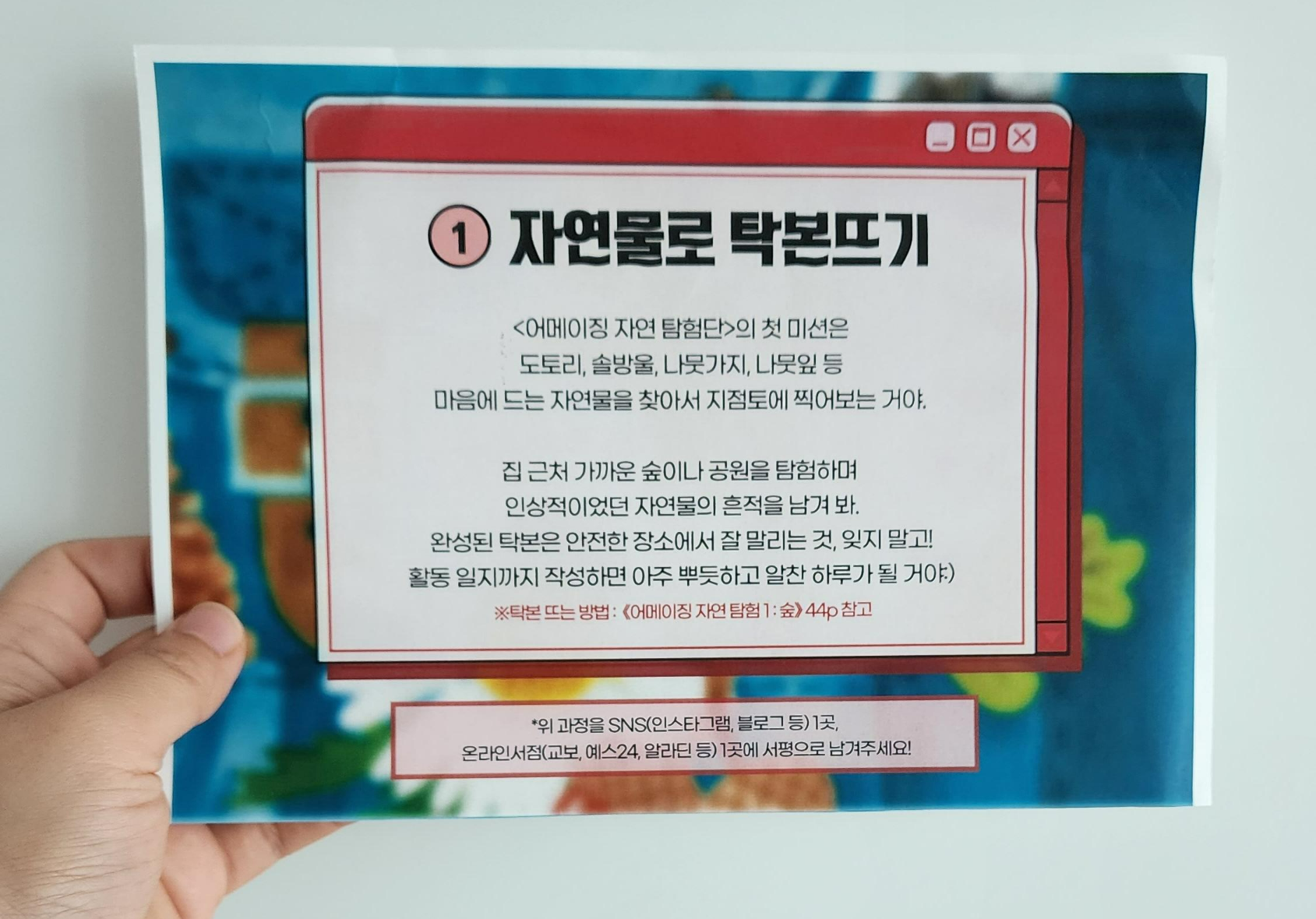 총 3번의 미션을 수행하며 진행되는데요, 이번 미션이 자연물로 탁본뜨기였어서 재미나게 해봤네요.
