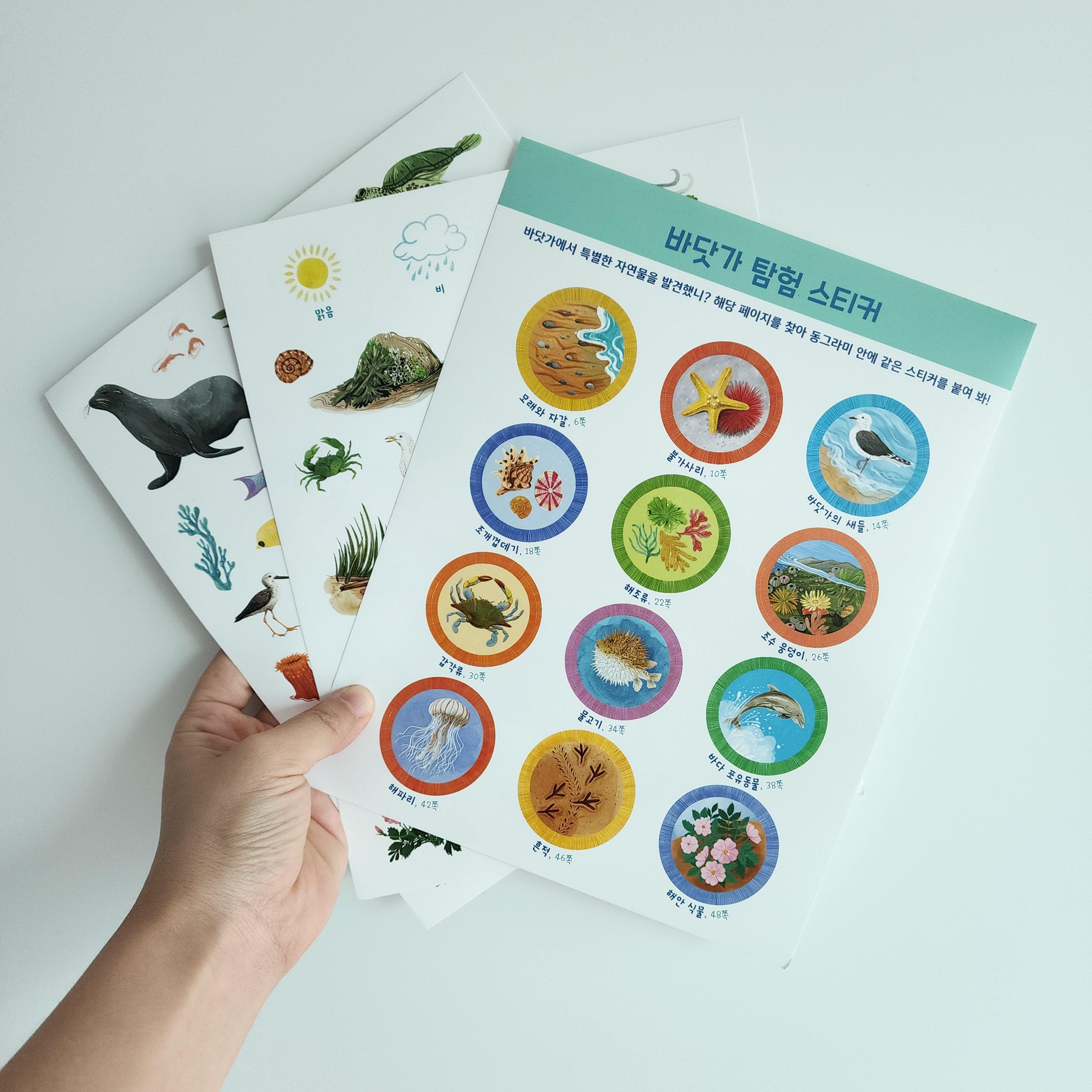 100여종의 동식물 생태정보가 들어있어서 바다에서 발견한 것들을 도장깨기 하듯이 스티커 붙여보는 재미가 쏠쏠해요.