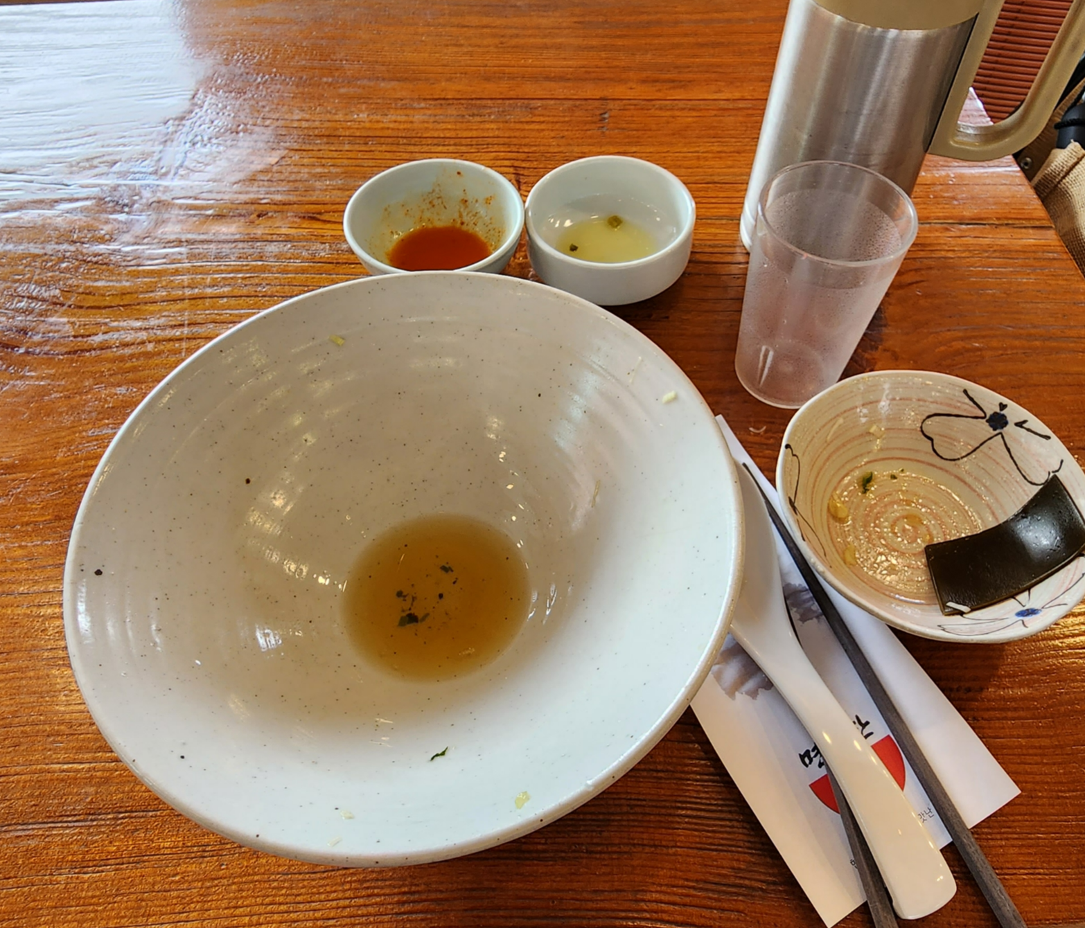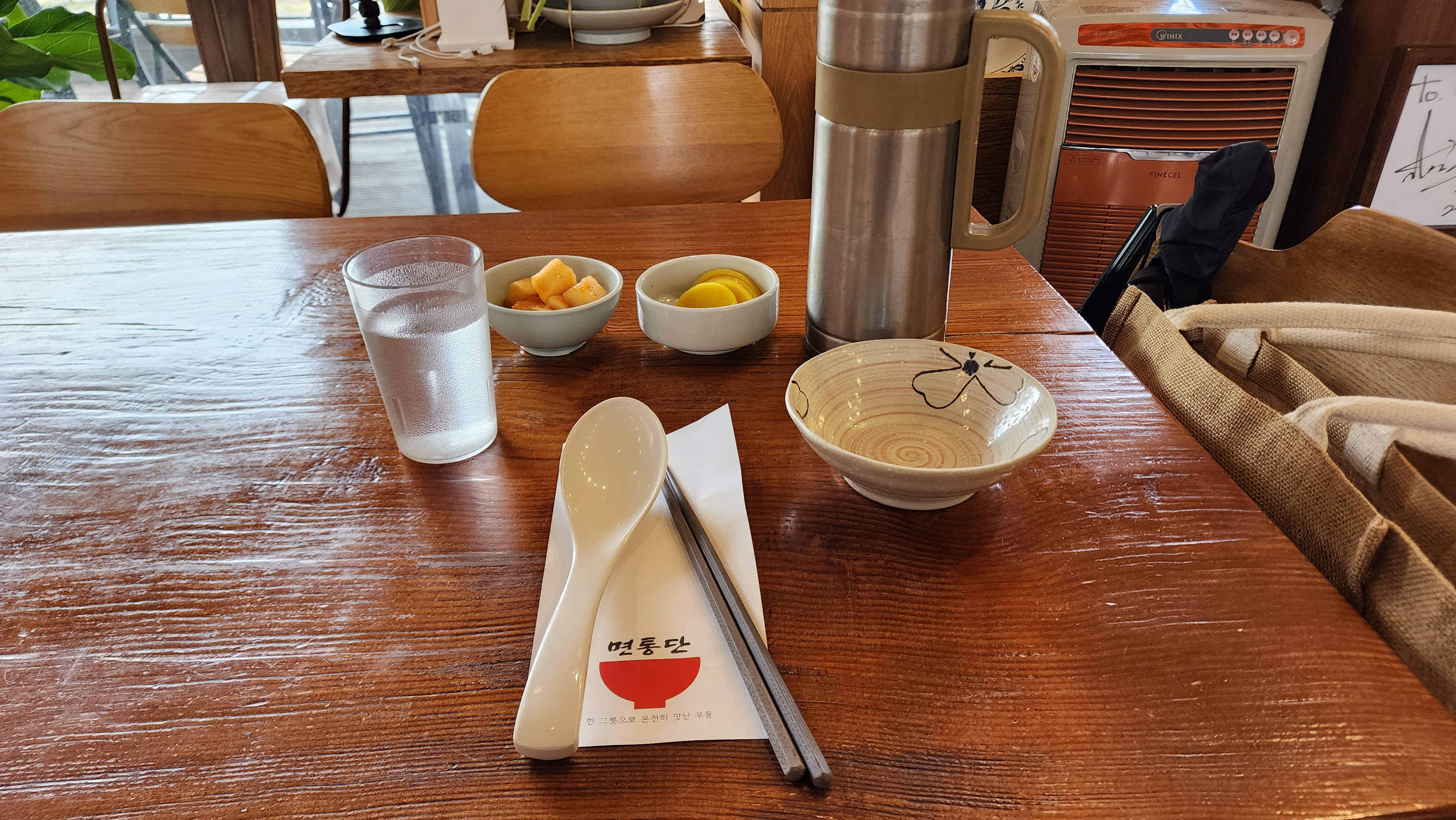 물, 깍두기, 고추피클, 단무지, 수저, 젓가락, 앞접시를 가져다 주시더군요.