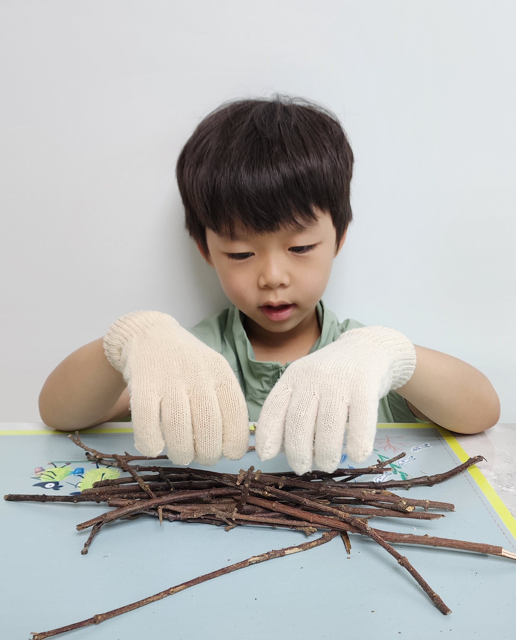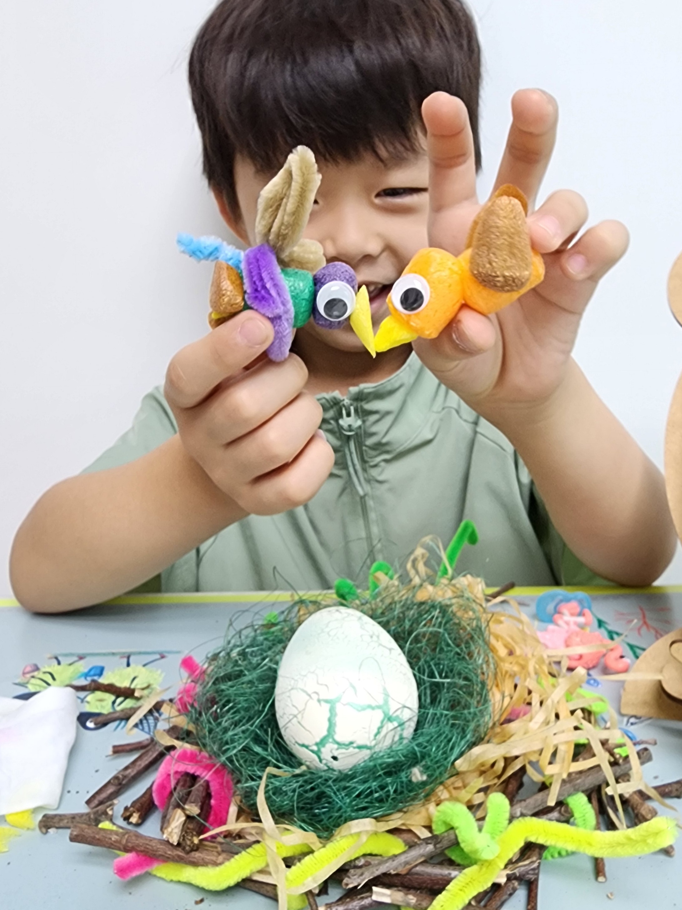 모루로 나뭇가지들을 엮어 둥지를 만들었는데 뭔가 허전해서 집에 있던 알 모형도 가져와보고 포장재도 지푸라기처럼 표현해봤어요.