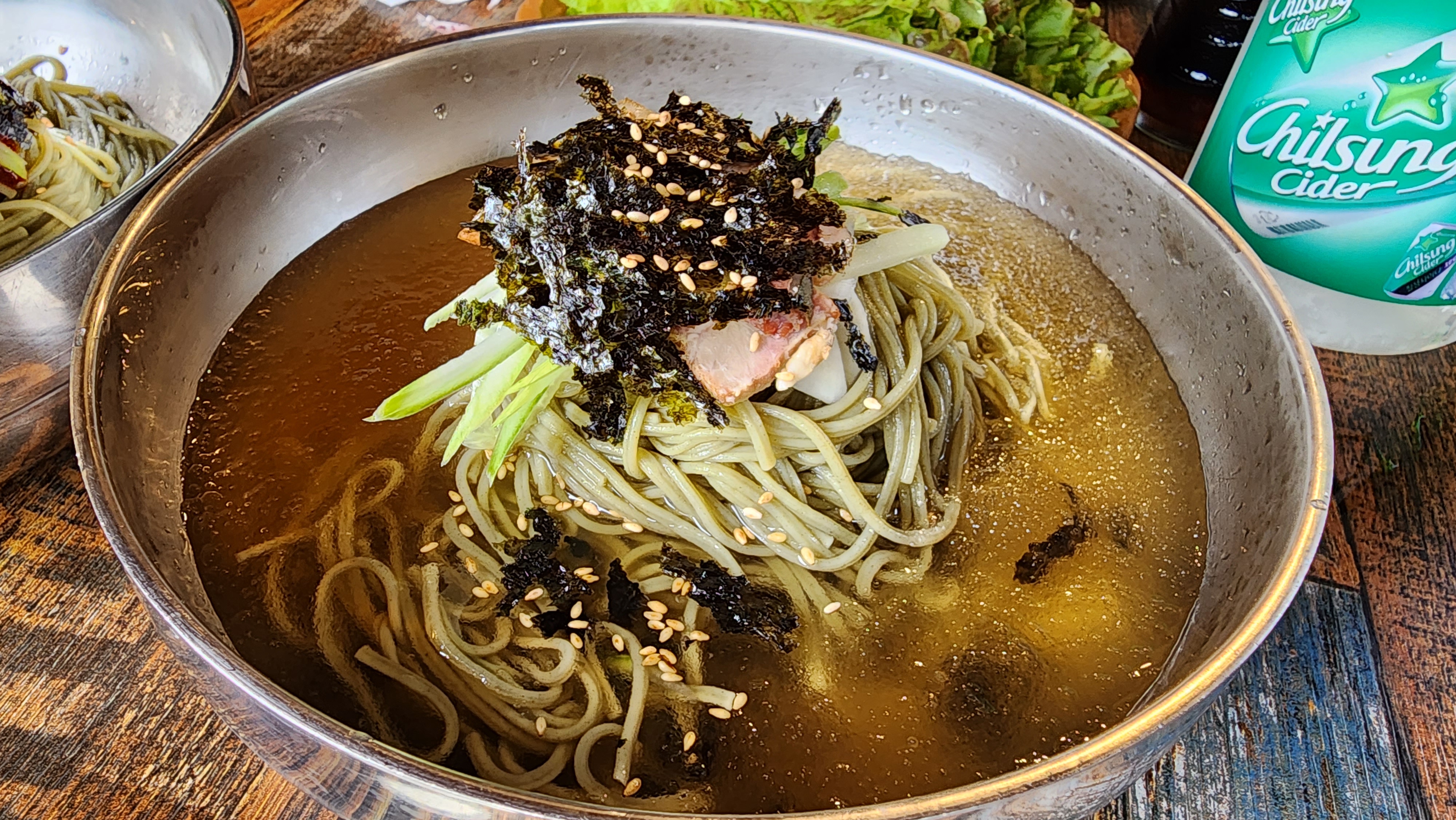 막국수는 면 색깔이 초록빛이었는데 계란 고명 대신 고기 고명이 올려져 있었어요.
