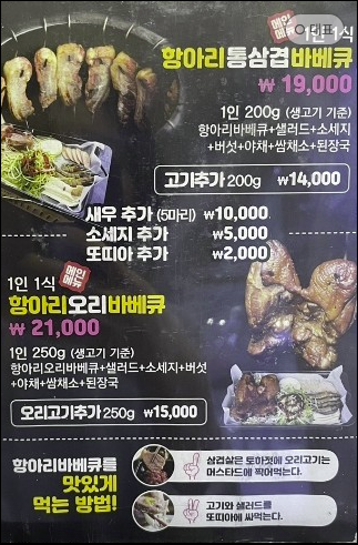항아리통삼겹바베큐, 항아리오리바베큐는 1인1식이고 추가메뉴로 막국수 등이 있더군요.