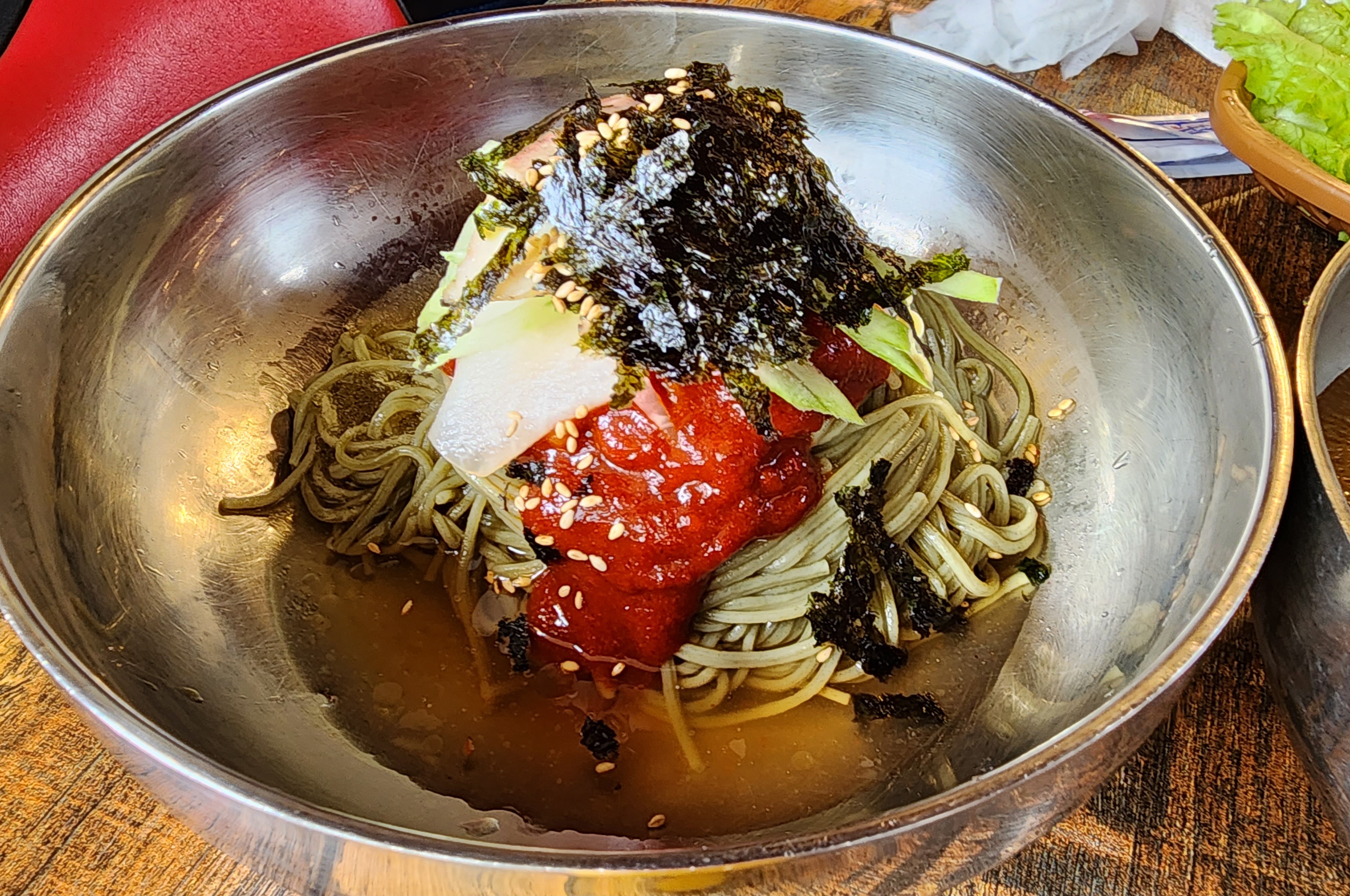 물막국수는 육수가 살얼음이어서 좋았고, 비빔은 양념이 자극적이지 않아서 고기랑 곁들여먹기 좋았어요.