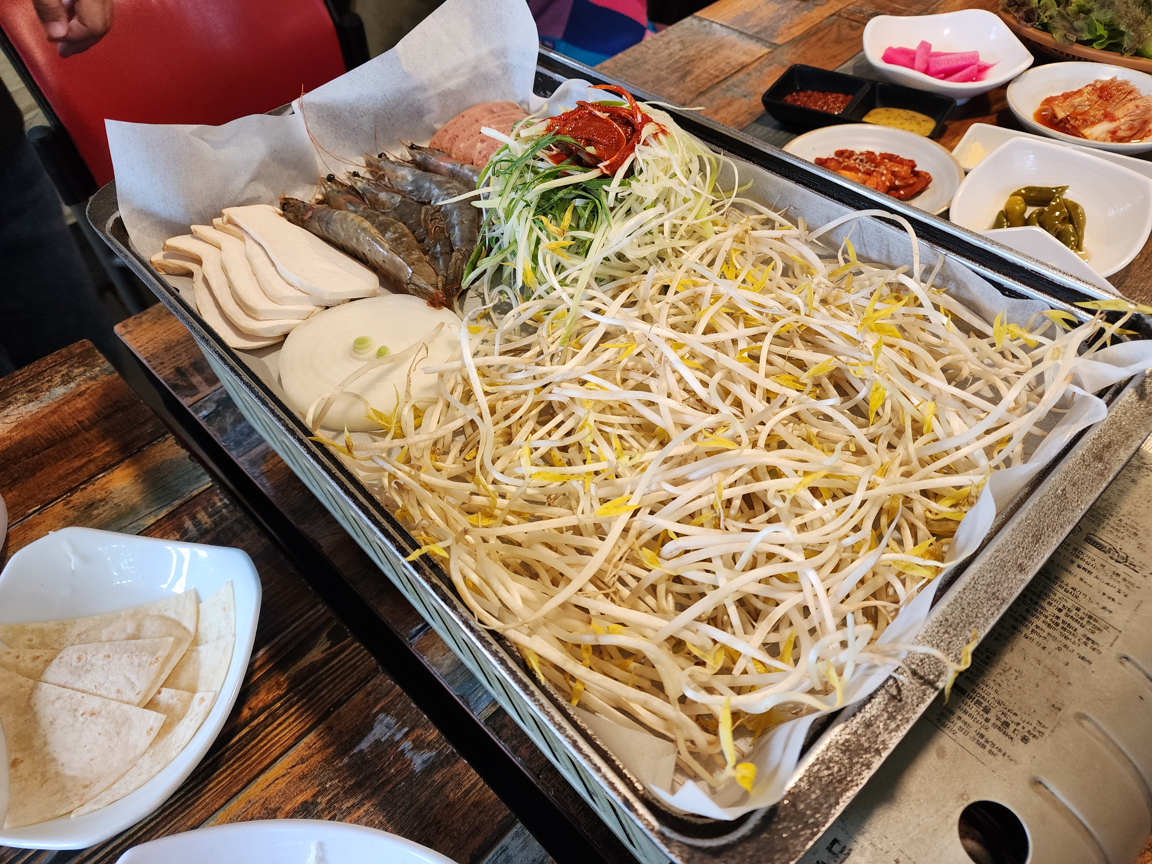 숙주, 양파, 새송이버섯, 새우, 소세지, 파무침이 올려져 있었어요.