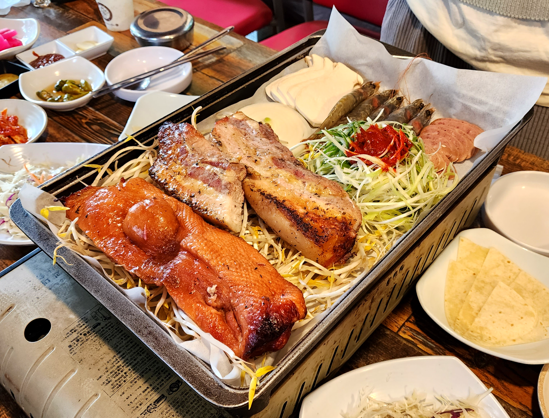 통삼겹 바베큐와 오리바베큐 모두 이 불판 위에 구워 먹었는데요