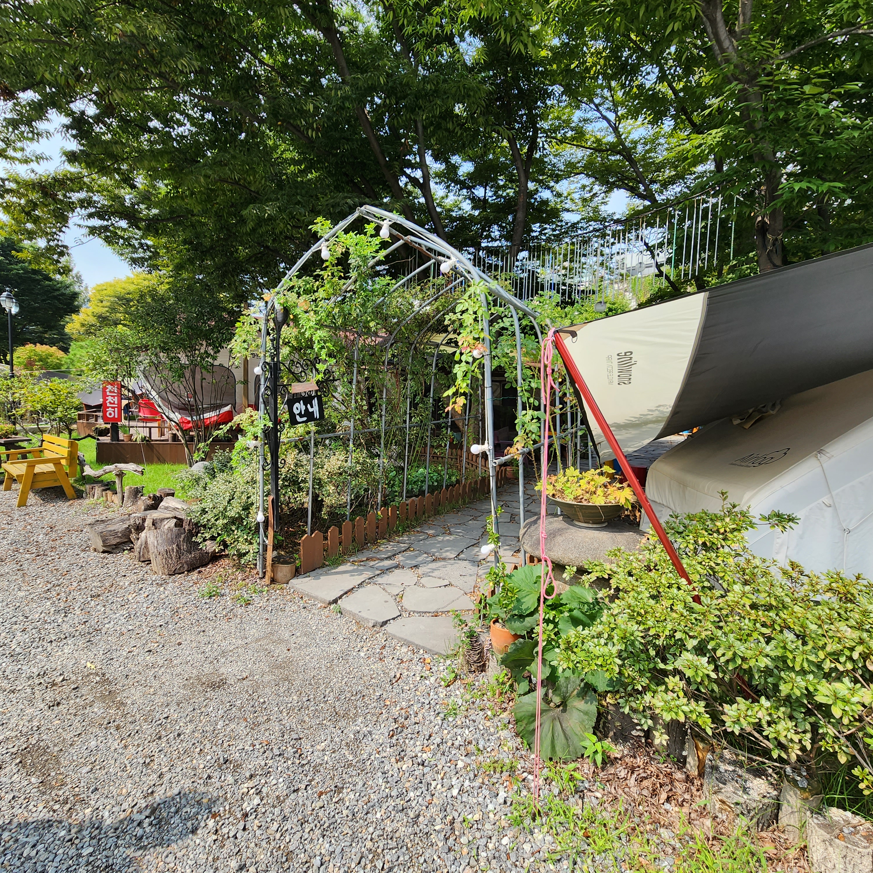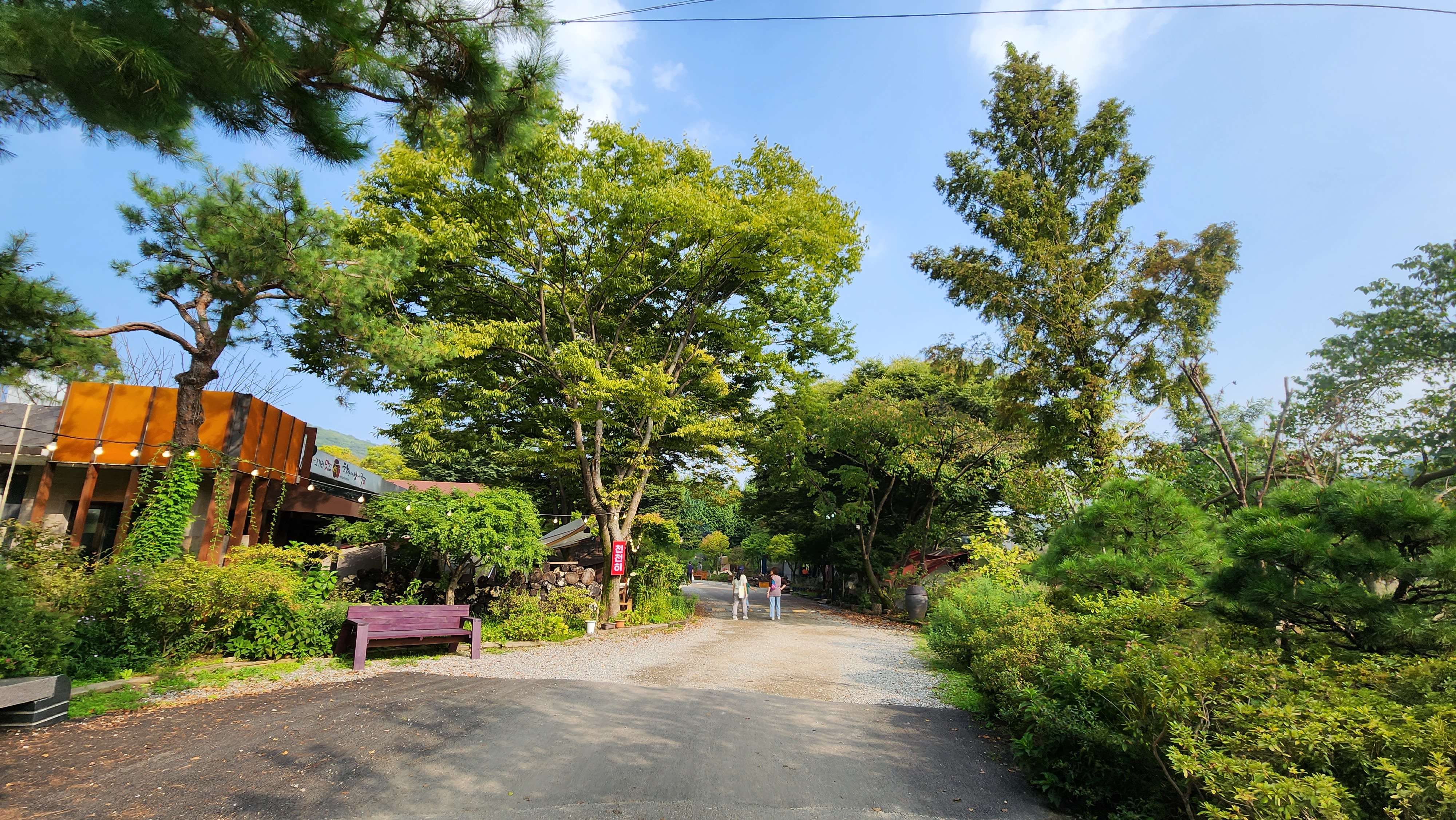 나무가 우거진 산골 항아리바베큐 입구예요.