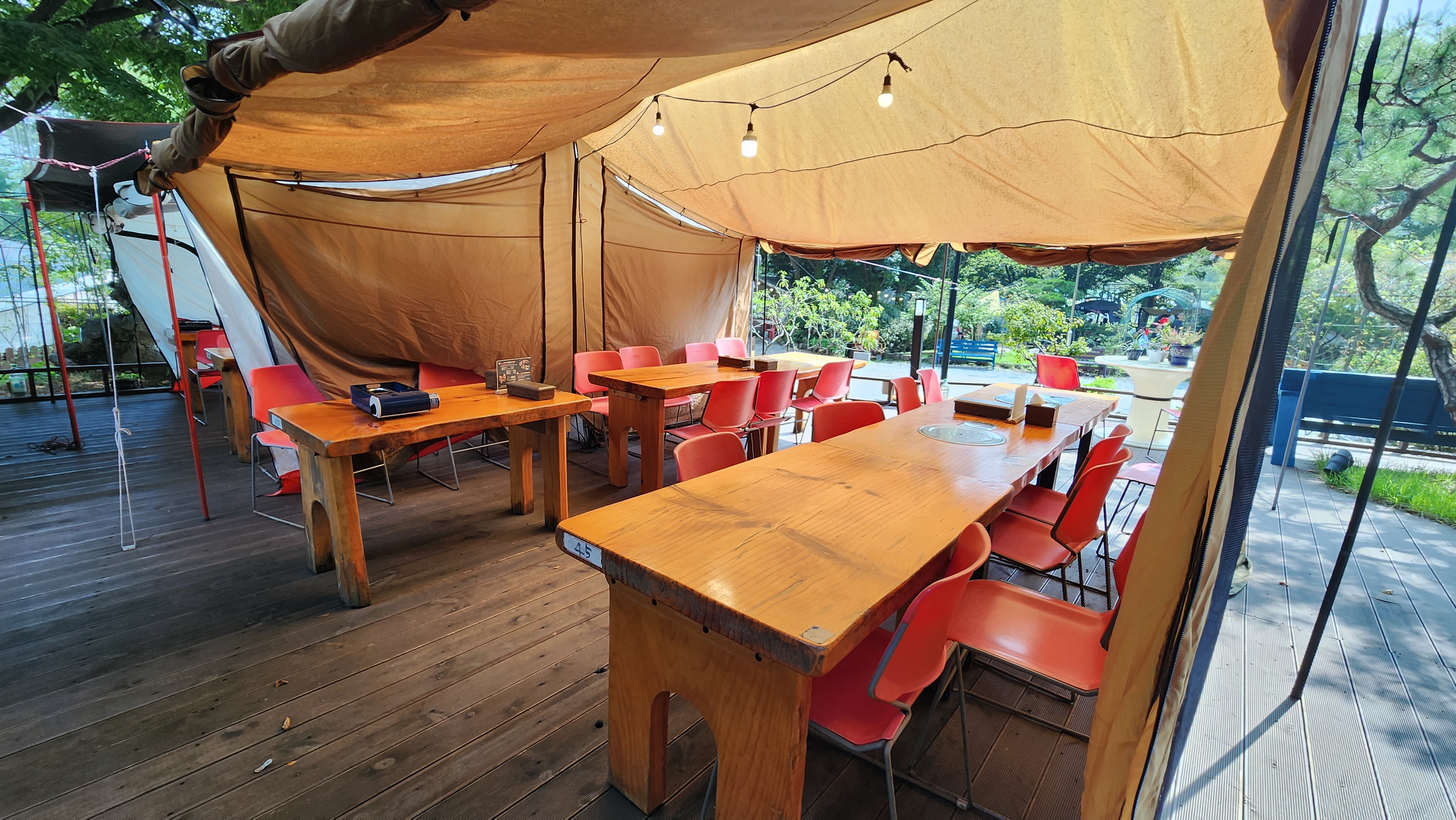 산골 항아리 바베큐는 건물 내에서도 식사가 가능하고 외부에 텐트석도 마련되어 있어서 야외에서 식사도 가능해요.