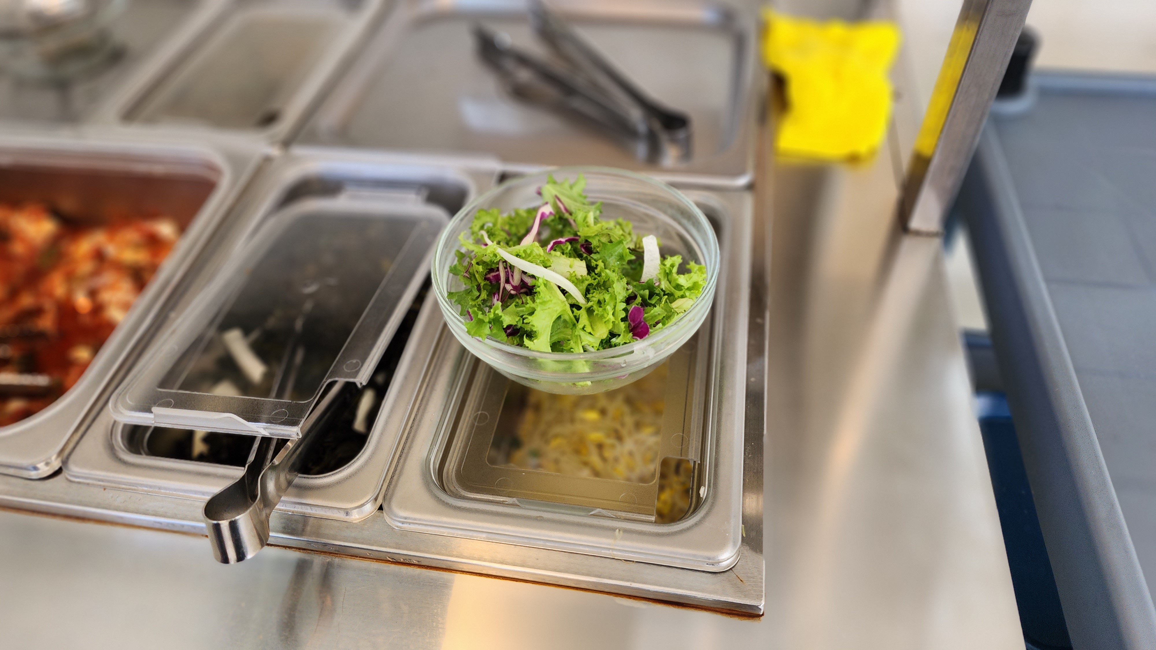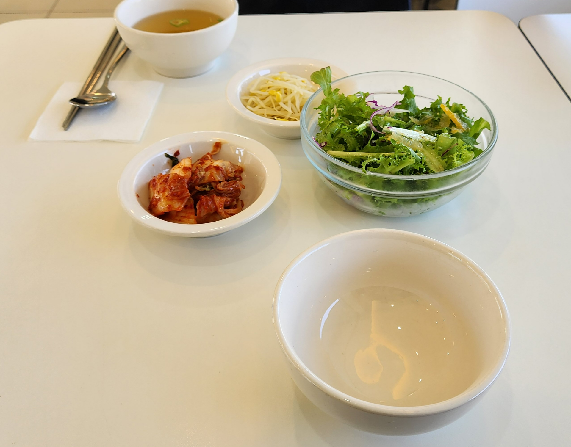 덮밥에는 장국이 나왔고 밑반찬으로 샐러드와 김치, 콩나물이 나왔어요.
