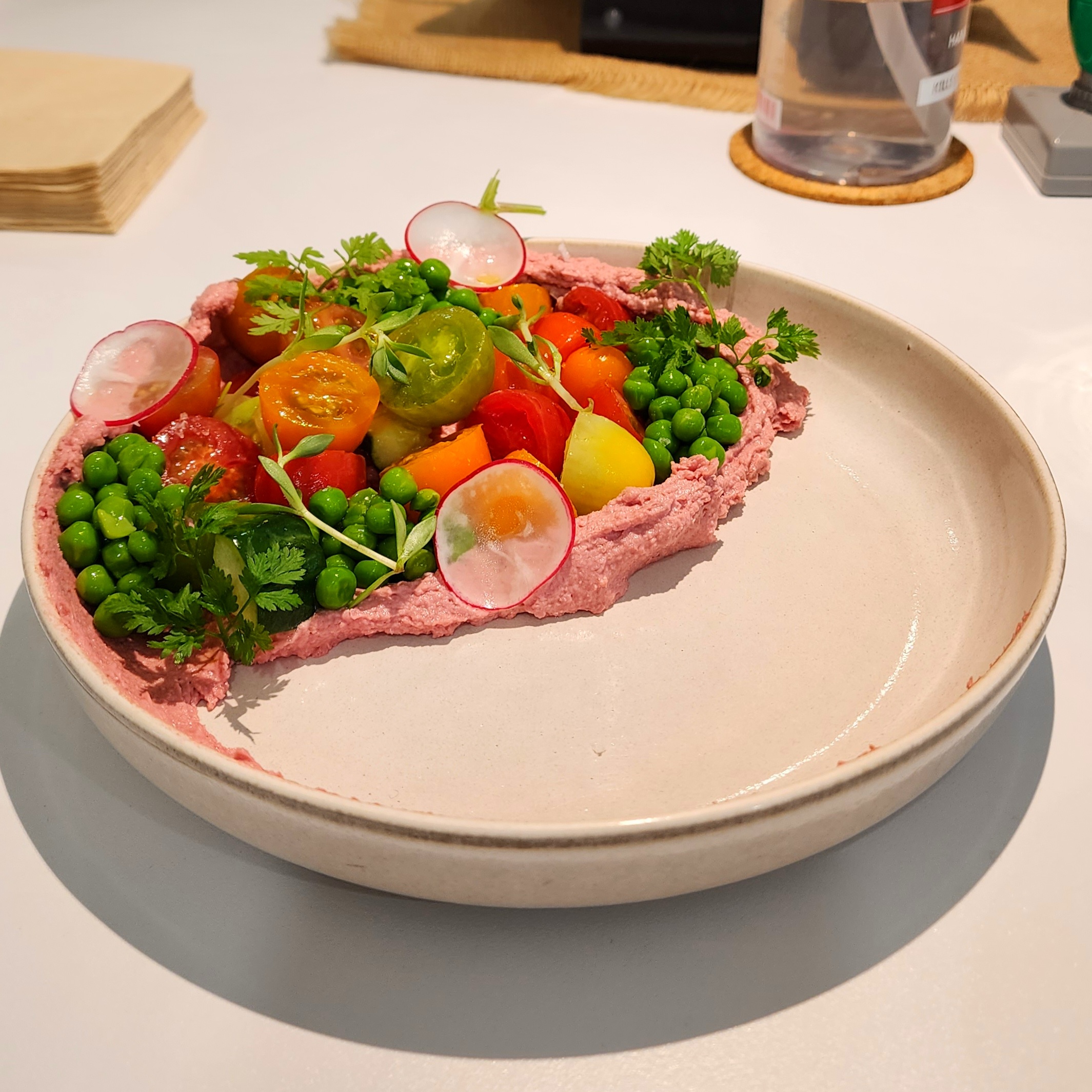 신선한 채소를 곁들인 비트 후무스 샐러드였는데요 완두콩마저 맛있을 수가 있구나 싶게 만든 샐러드였어요.