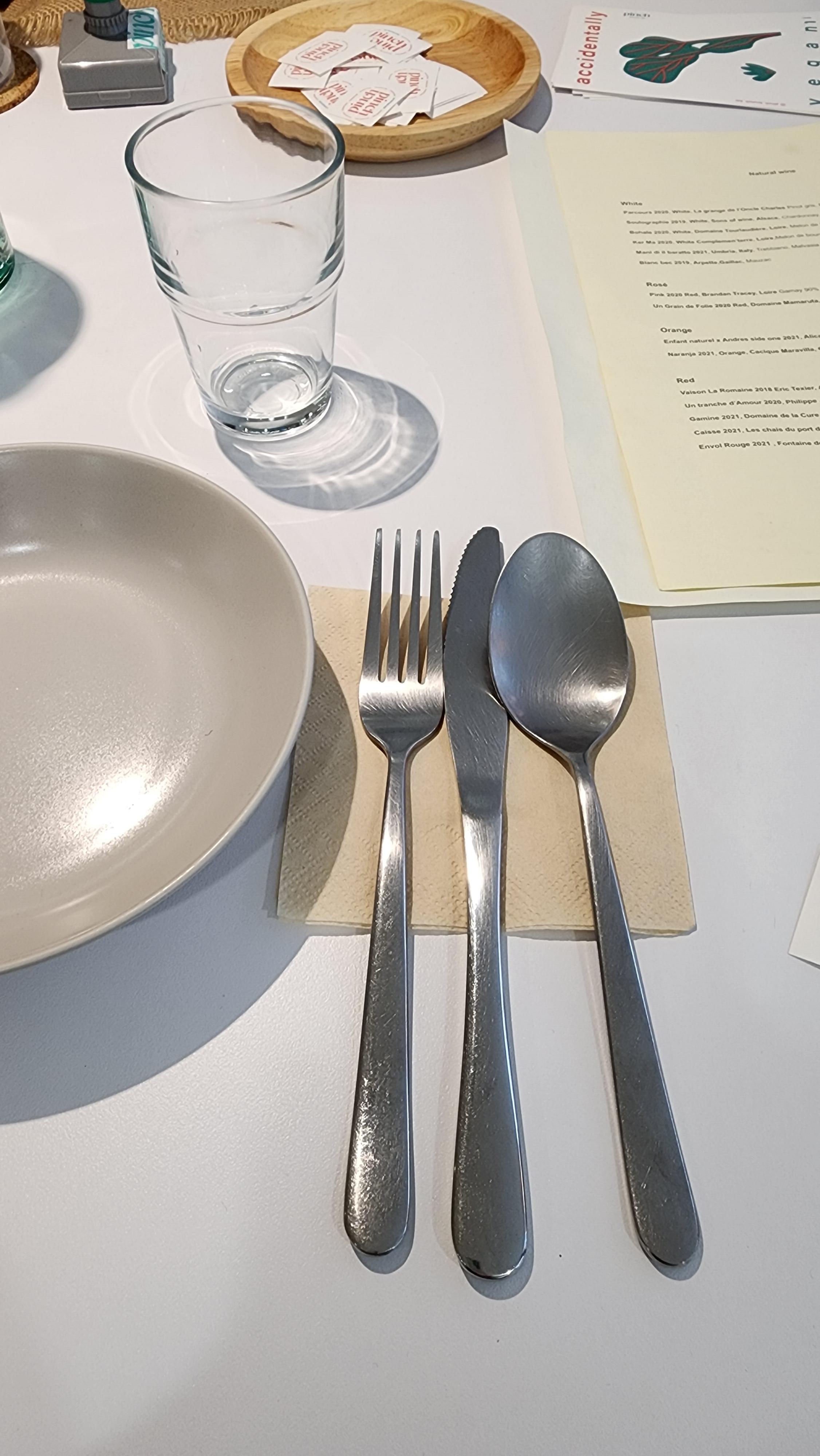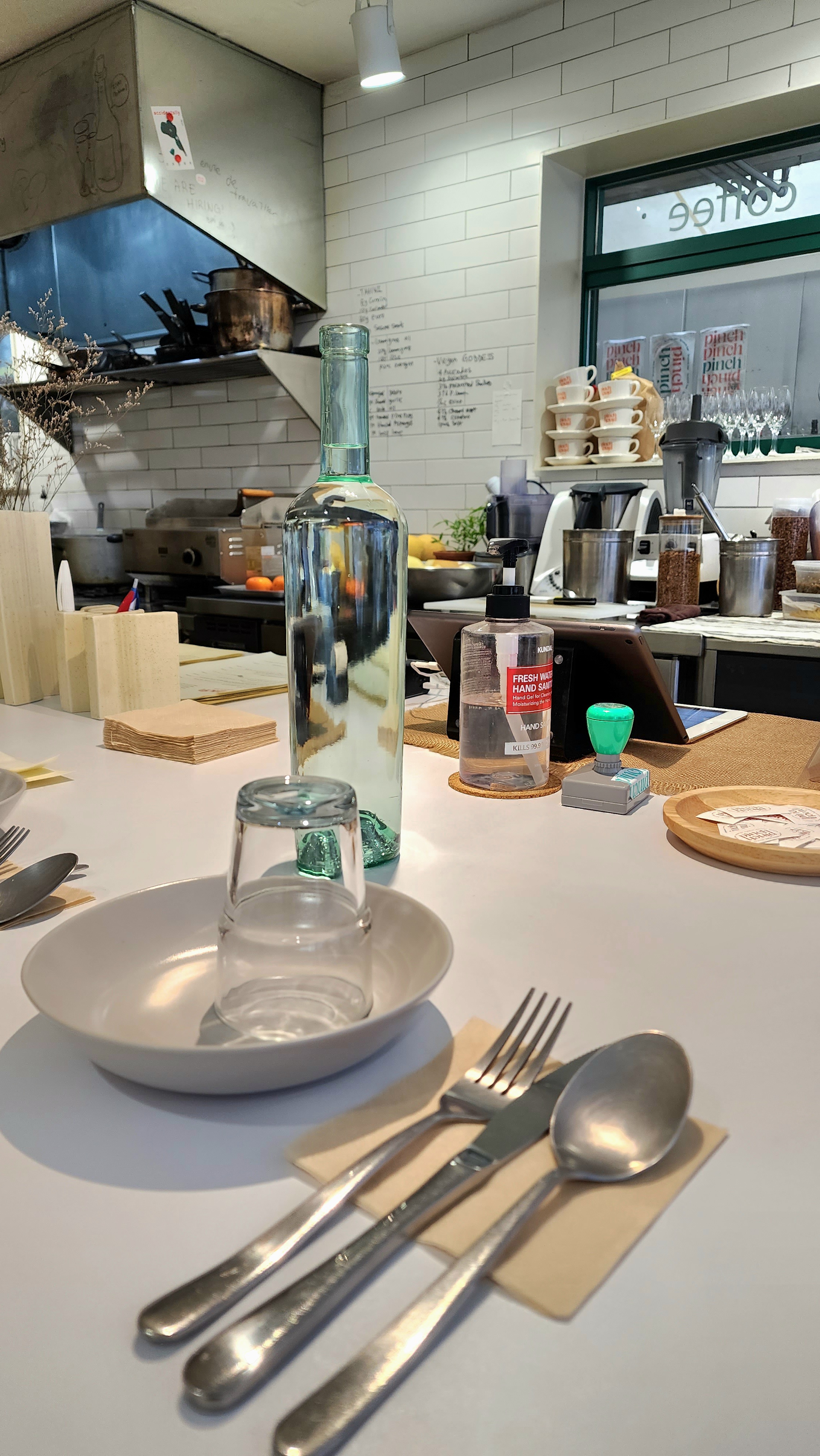 앞접시, 컵, 커틀러리, 물을 가져다 주셨는데 깔끔하면서도 예쁜 느낌 가득이더군요.