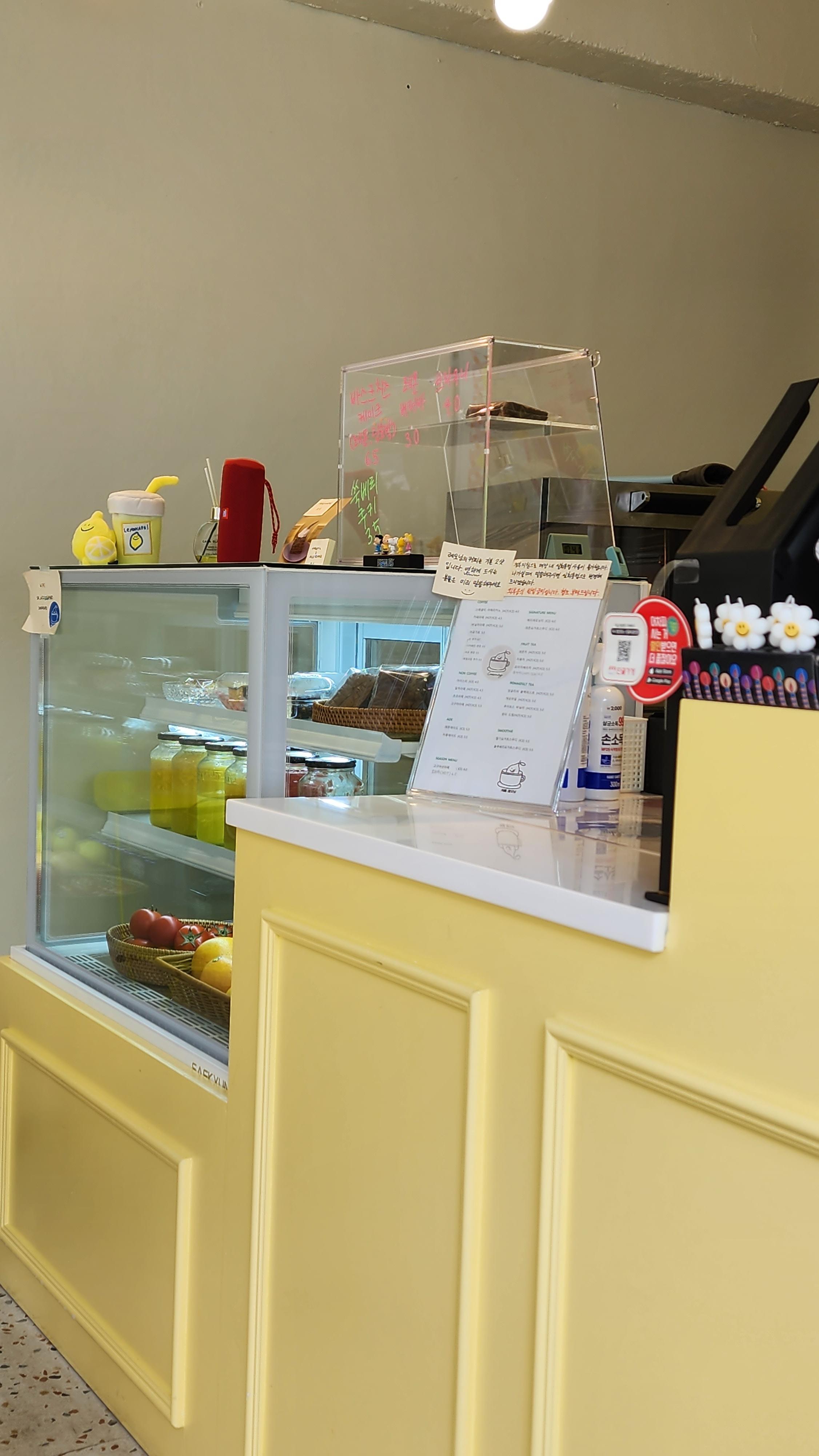 음료 메뉴도 다양하고 쇼케이스에 수제청, 브라우니 등이 있었어요.