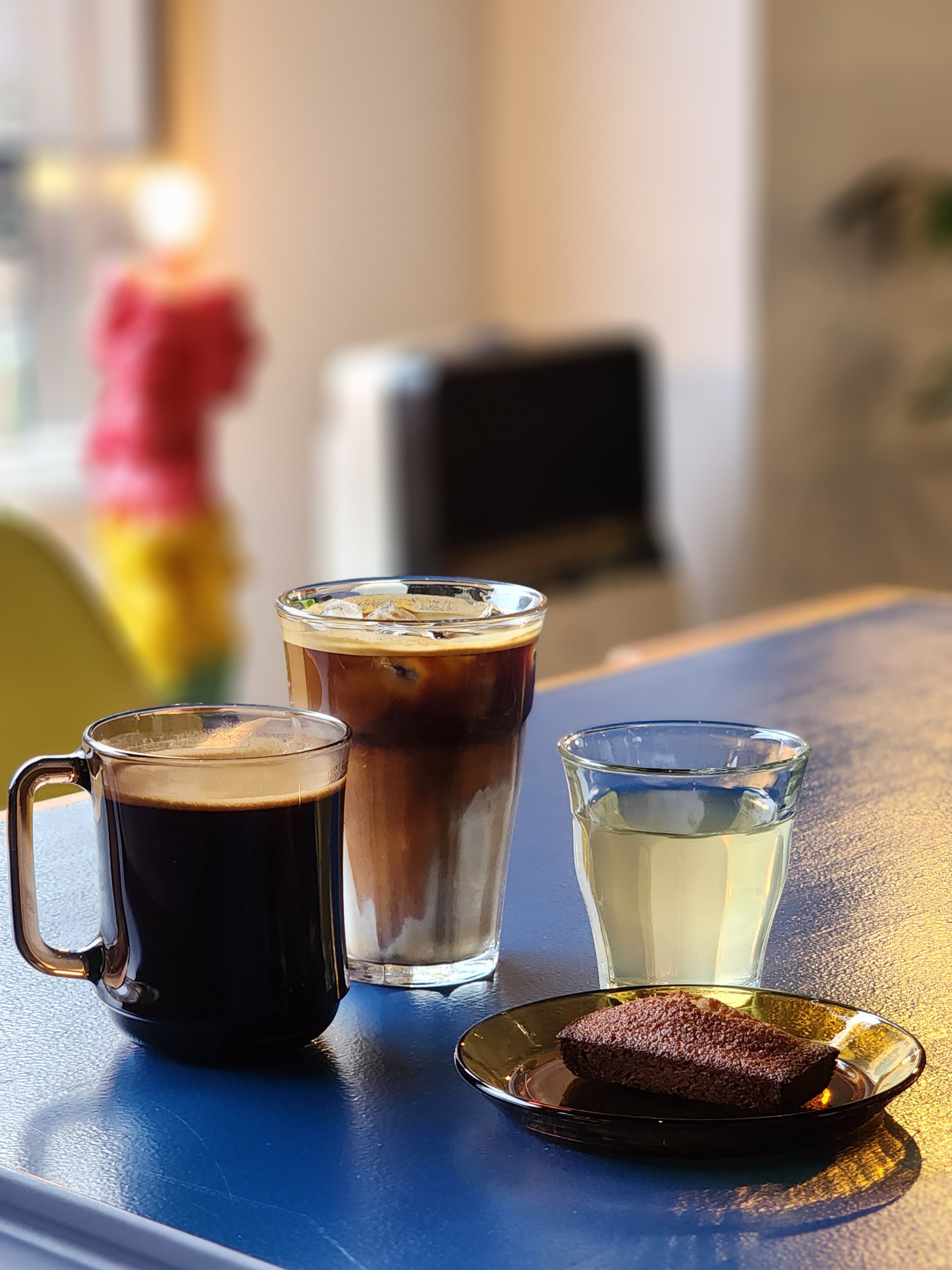 따뜻한 아메리카노와 아이스라떼, 휘낭시에를 주문했어요.