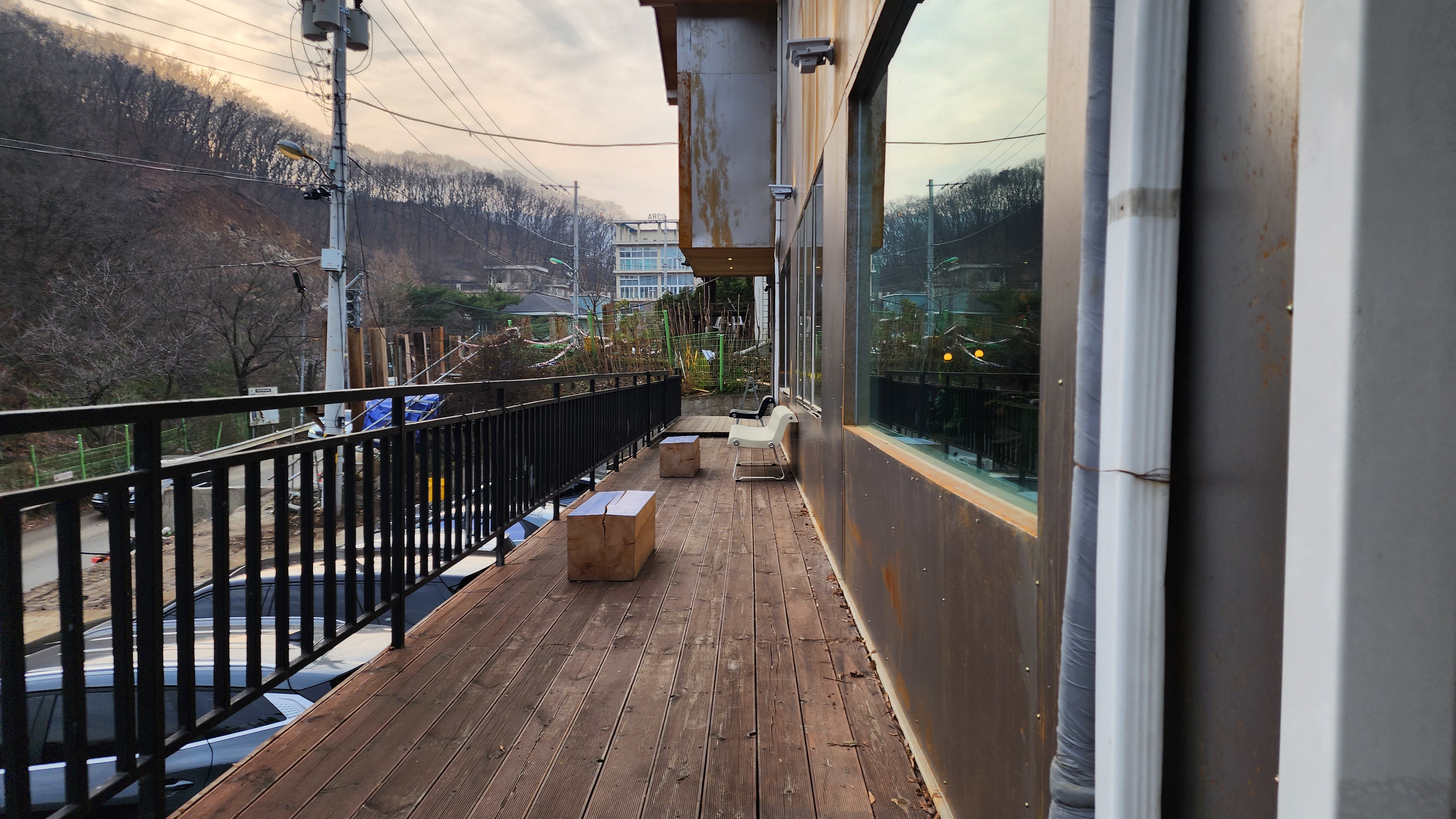 테라스 석도 마련 되어있었는데 야외 공간은 카페 안을 통해 나가면 건물 뒷편에도 있어요.