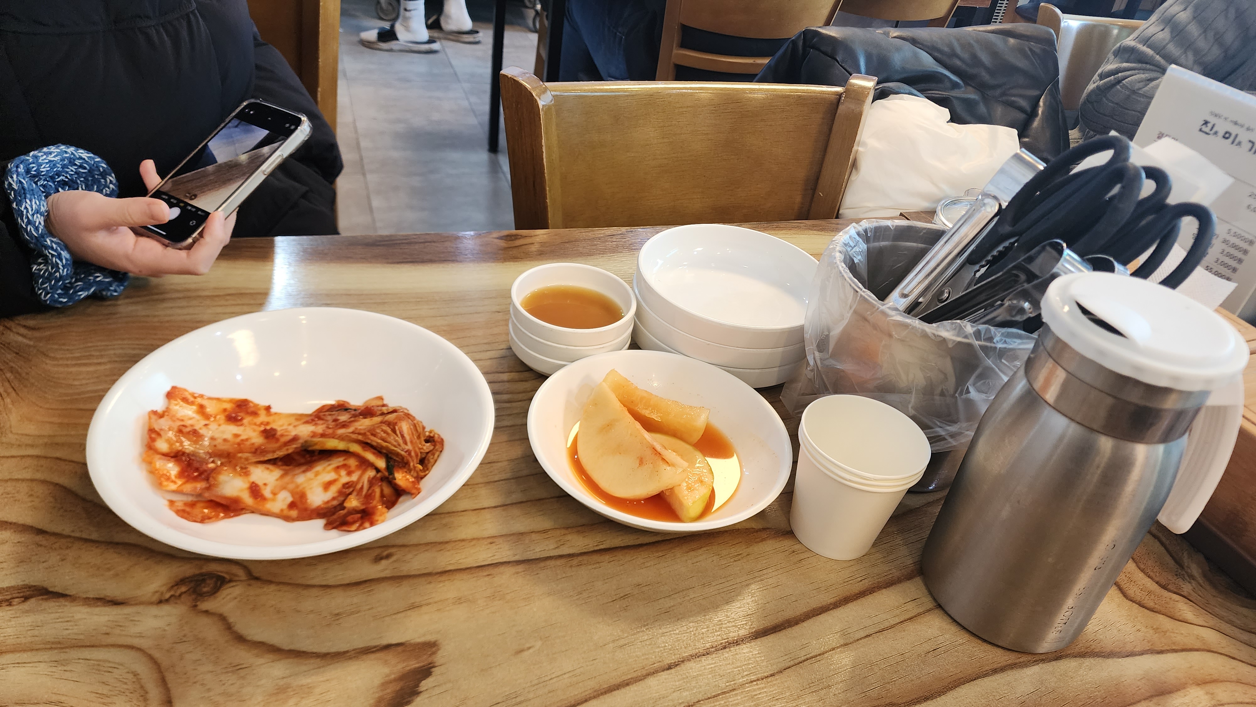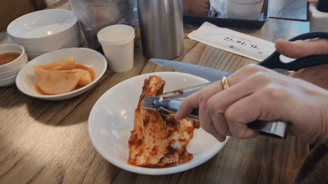 앞접시, 집게, 가위 등을 가져다 주셨고 배추김치와 깍두기가 나왔어요.