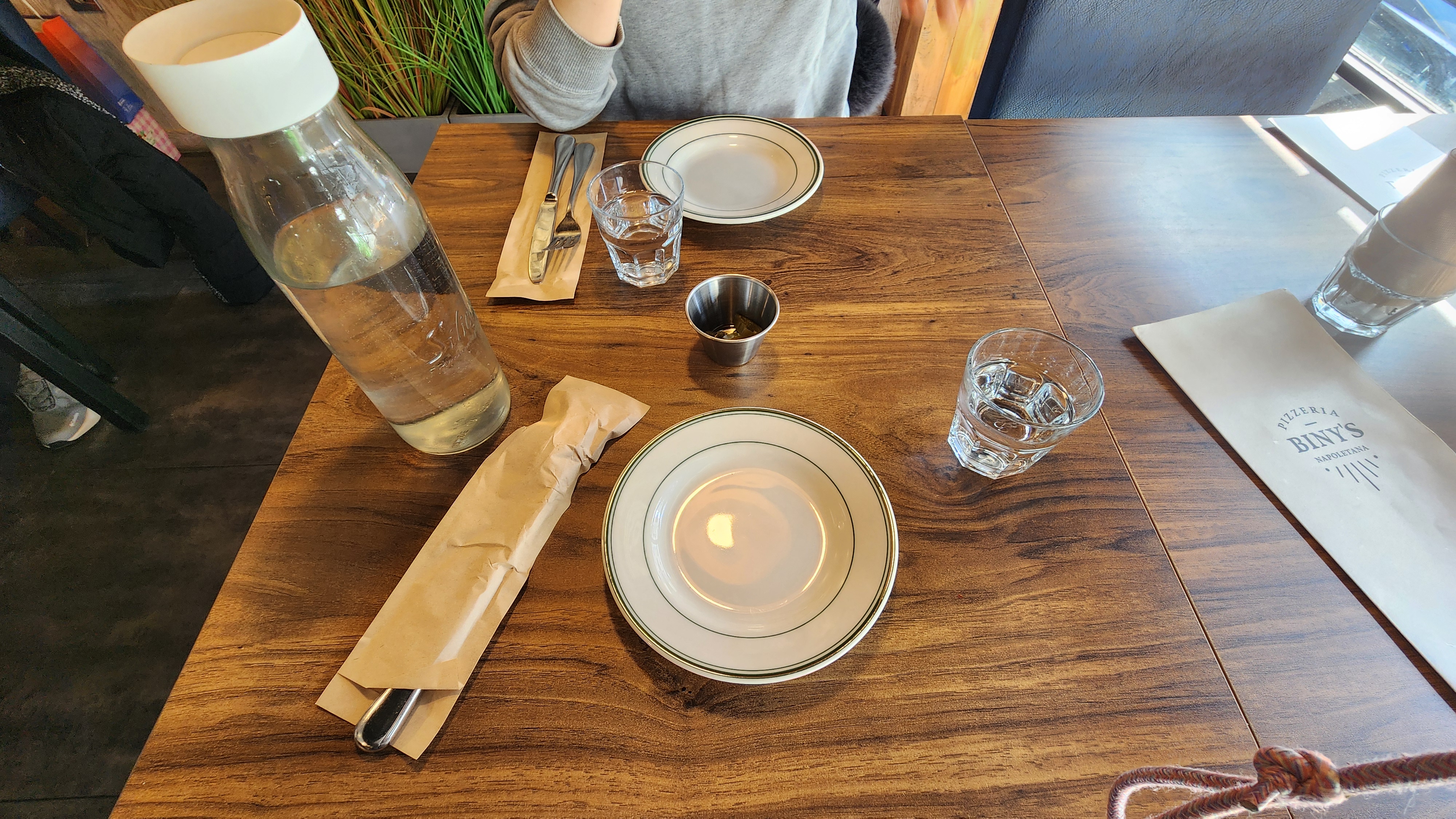 물, 앞접시, 컵, 할라피뇨, 포크, 나이프를 가져다 주셨어요.