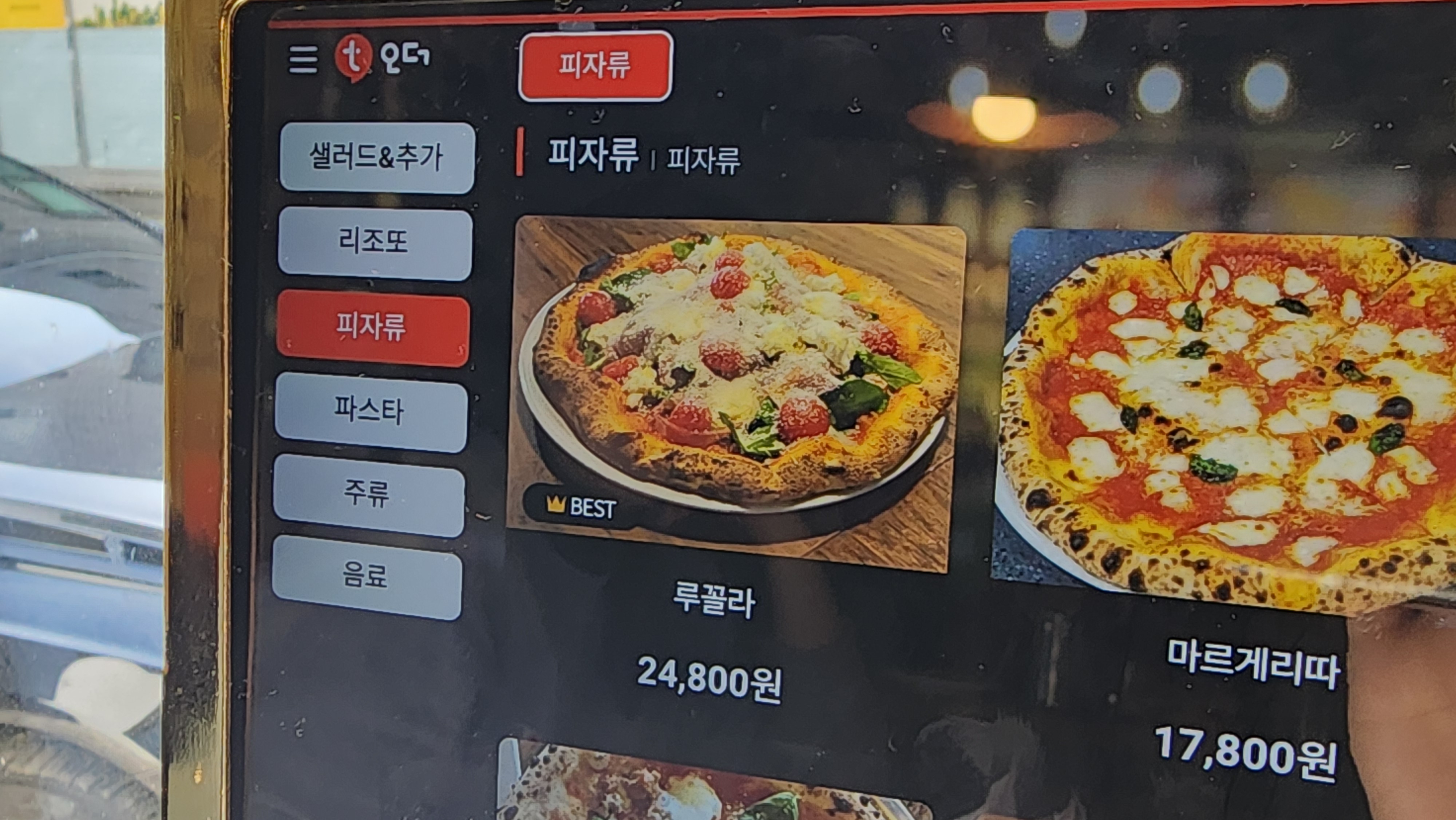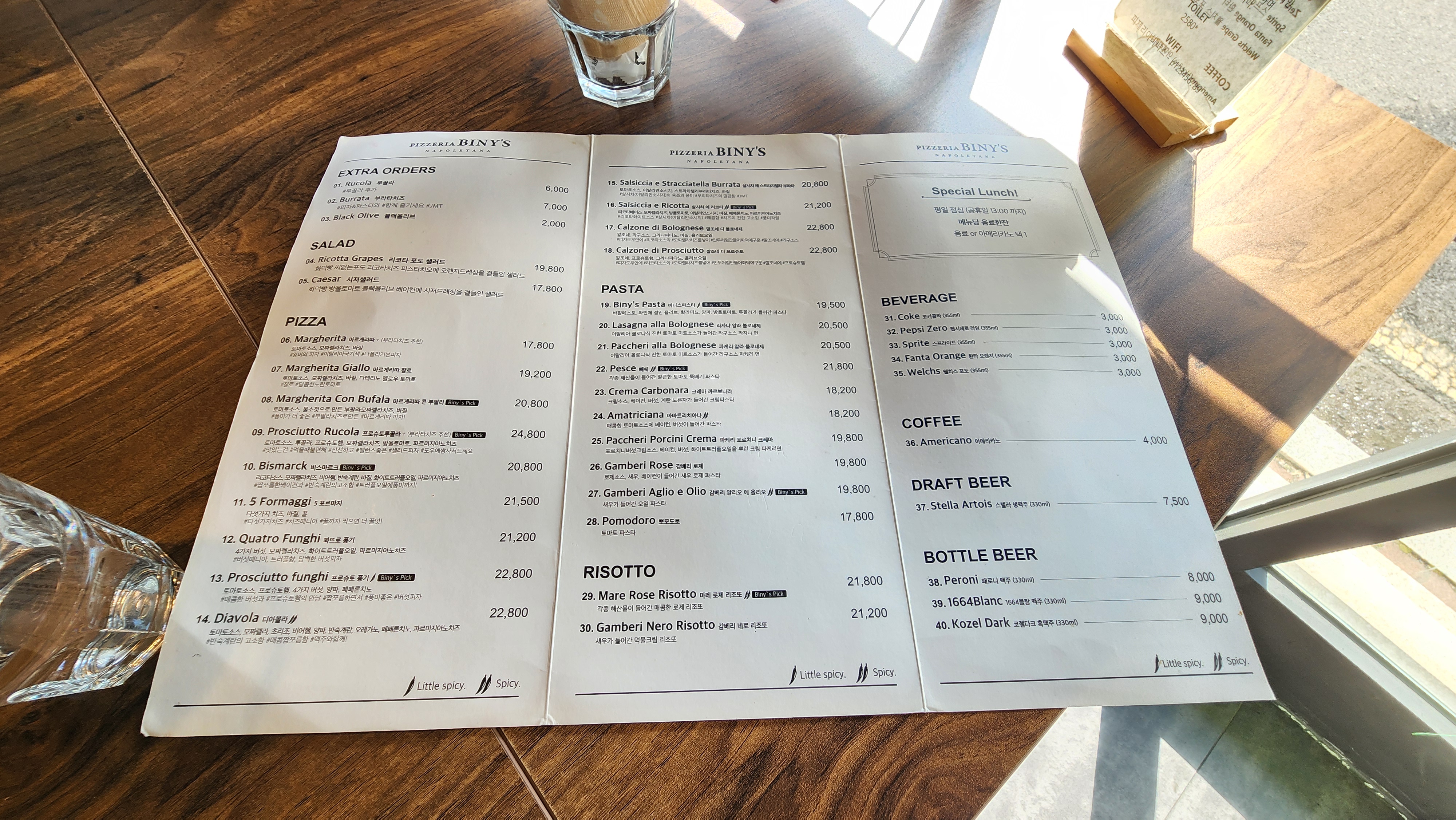 샐러드, 피자, 파스타, 리조또 메뉴가 다양하게 마련 되어있고 맵기도 표시되어 있어서 기호에 맞게 고르시면 될 것 같아요.