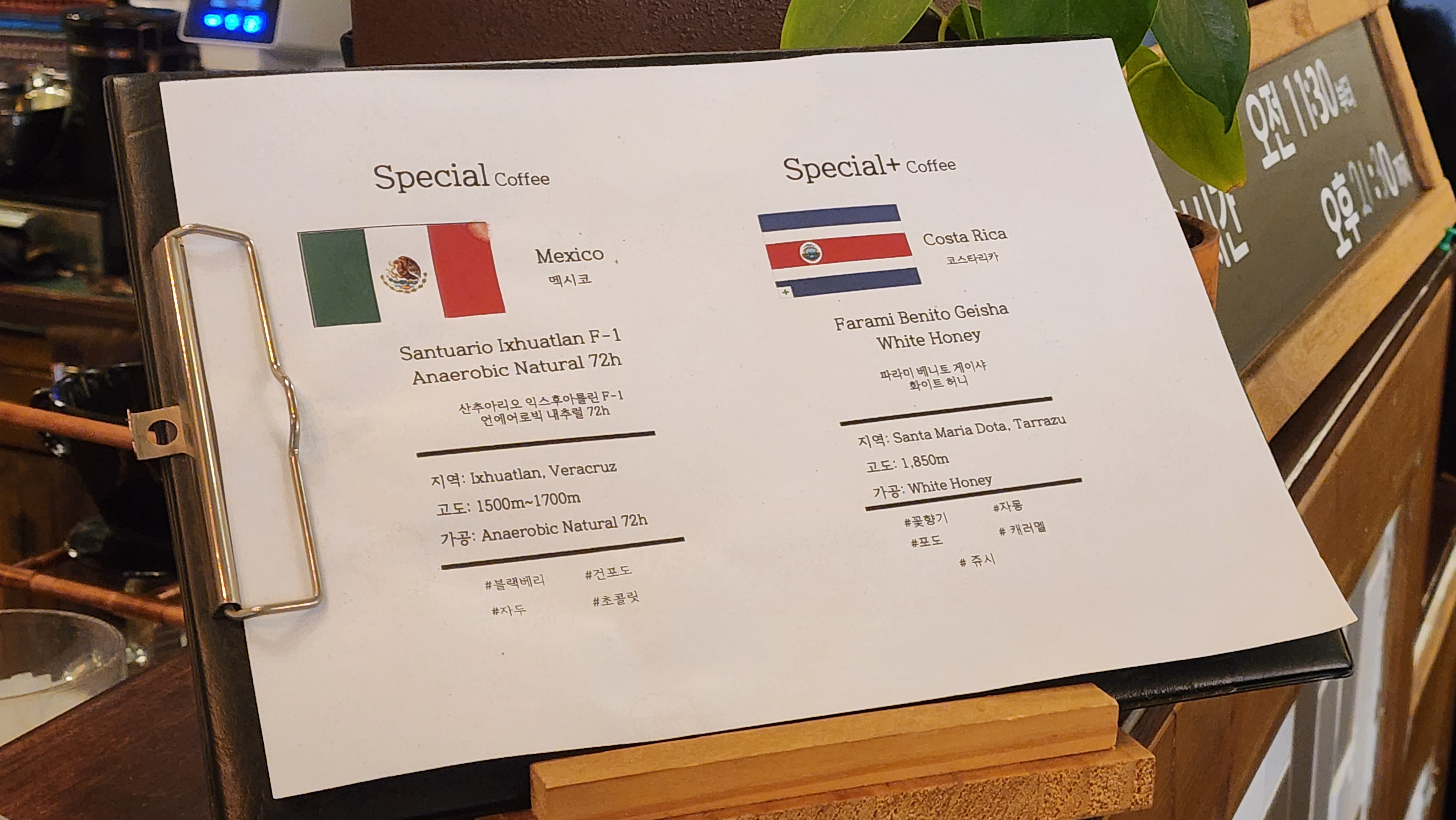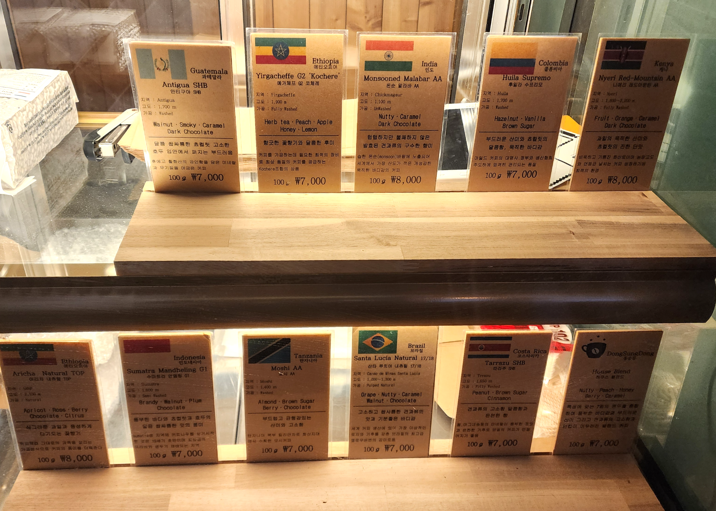 쇼케이스에 다양한 원두 설명이 되어있더군요.