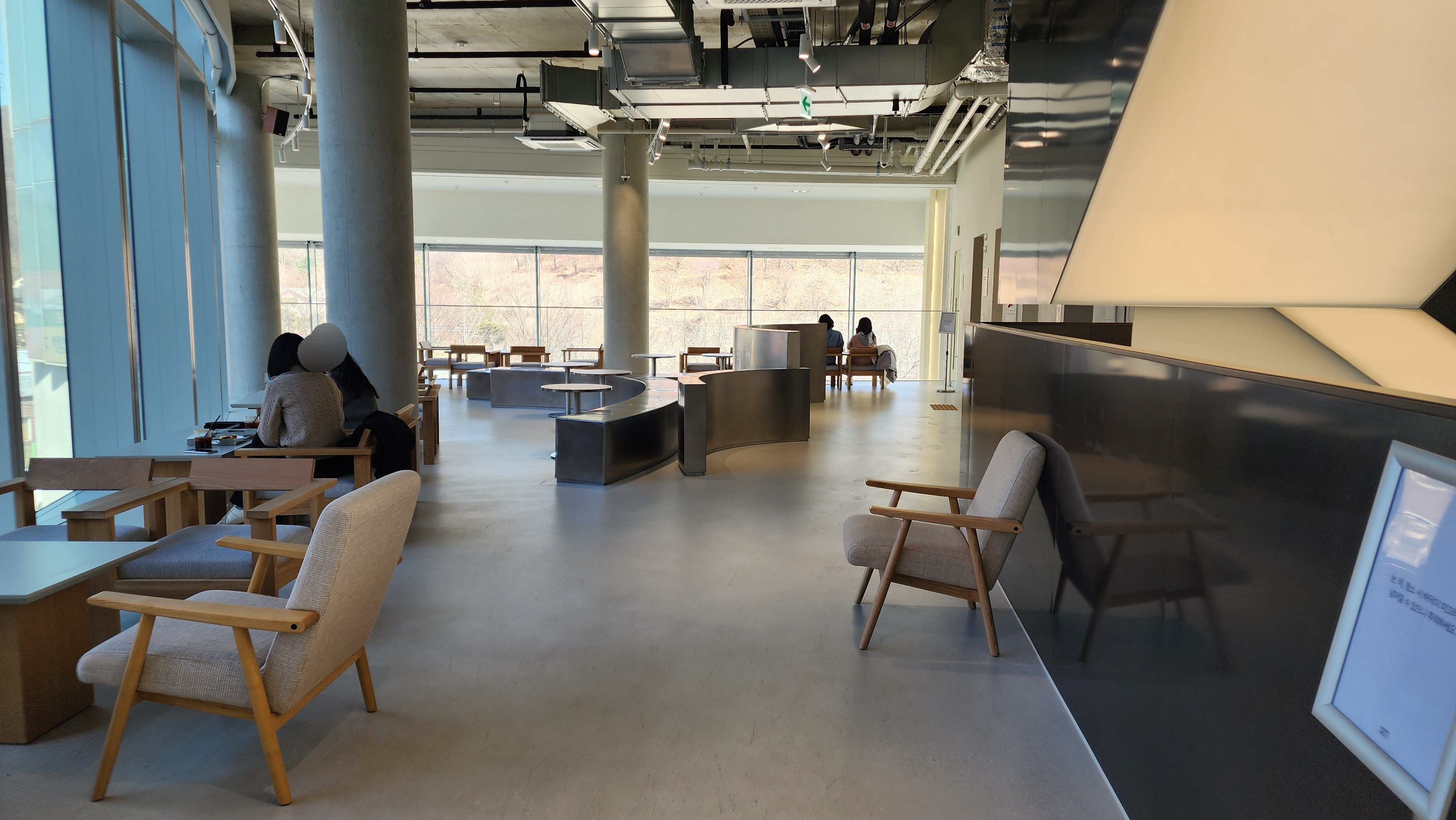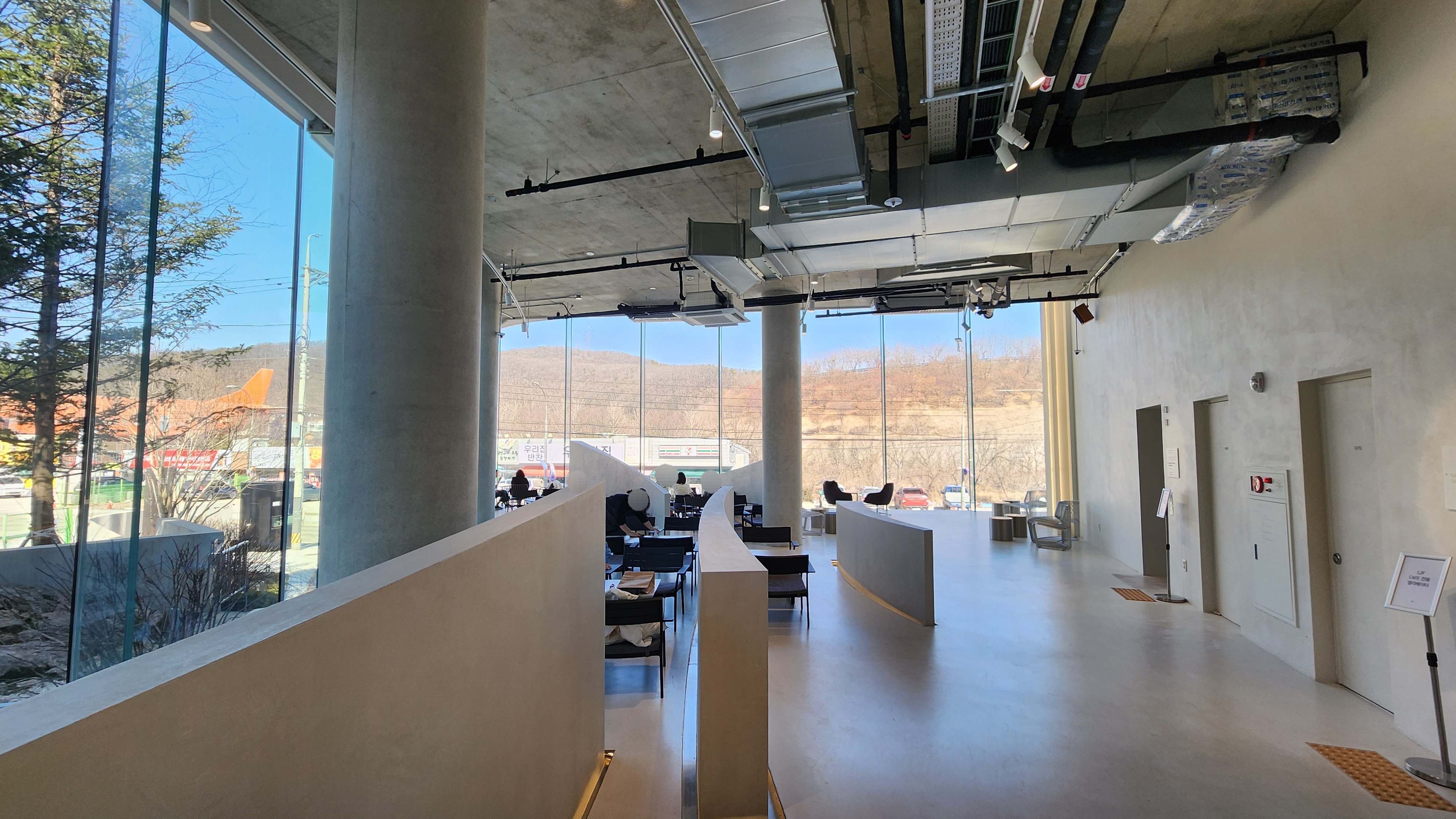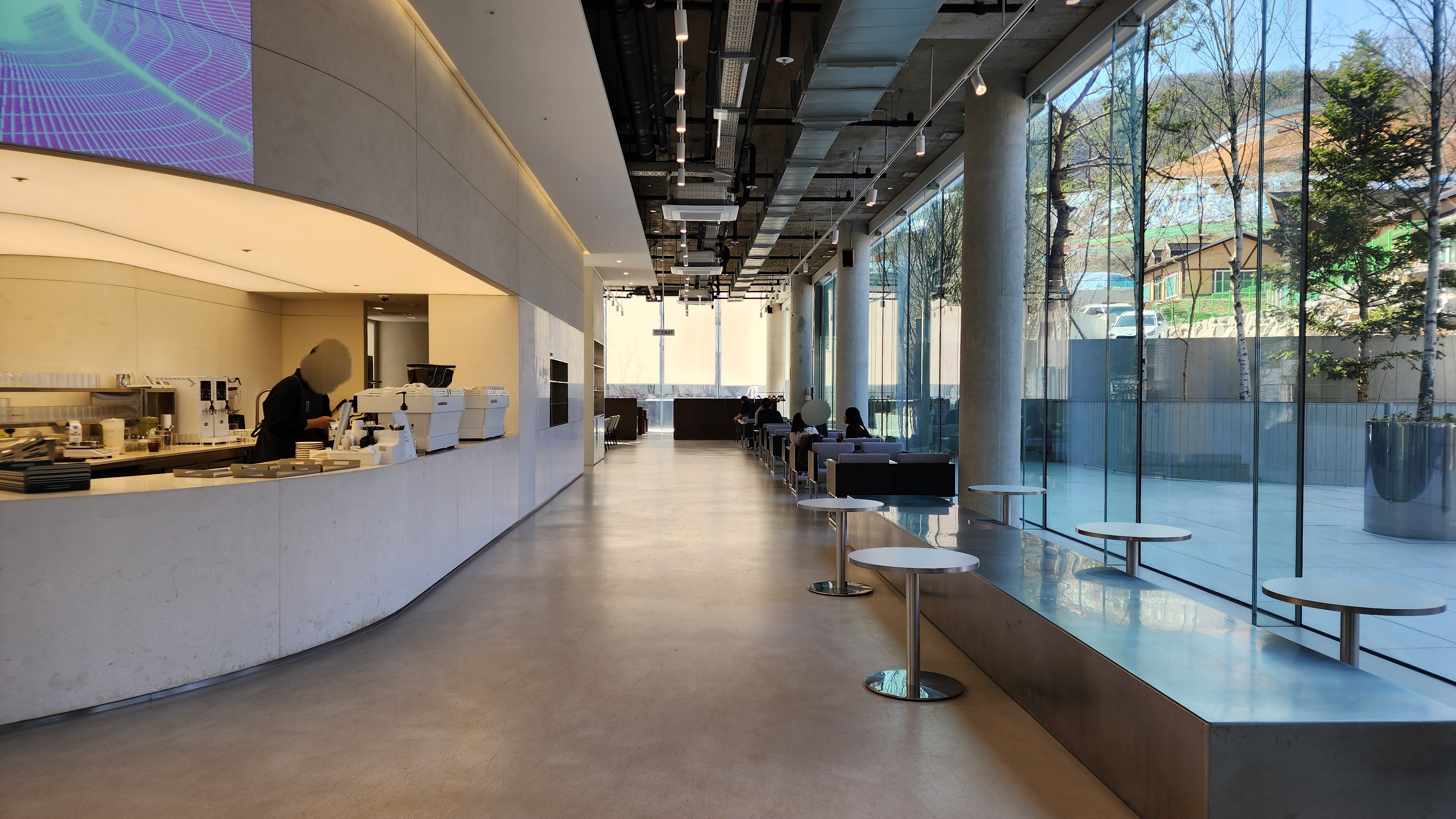 높은 층고에 탁트인 공간, 모던한 인테리어가 돋보이는 대형 카페였어요.