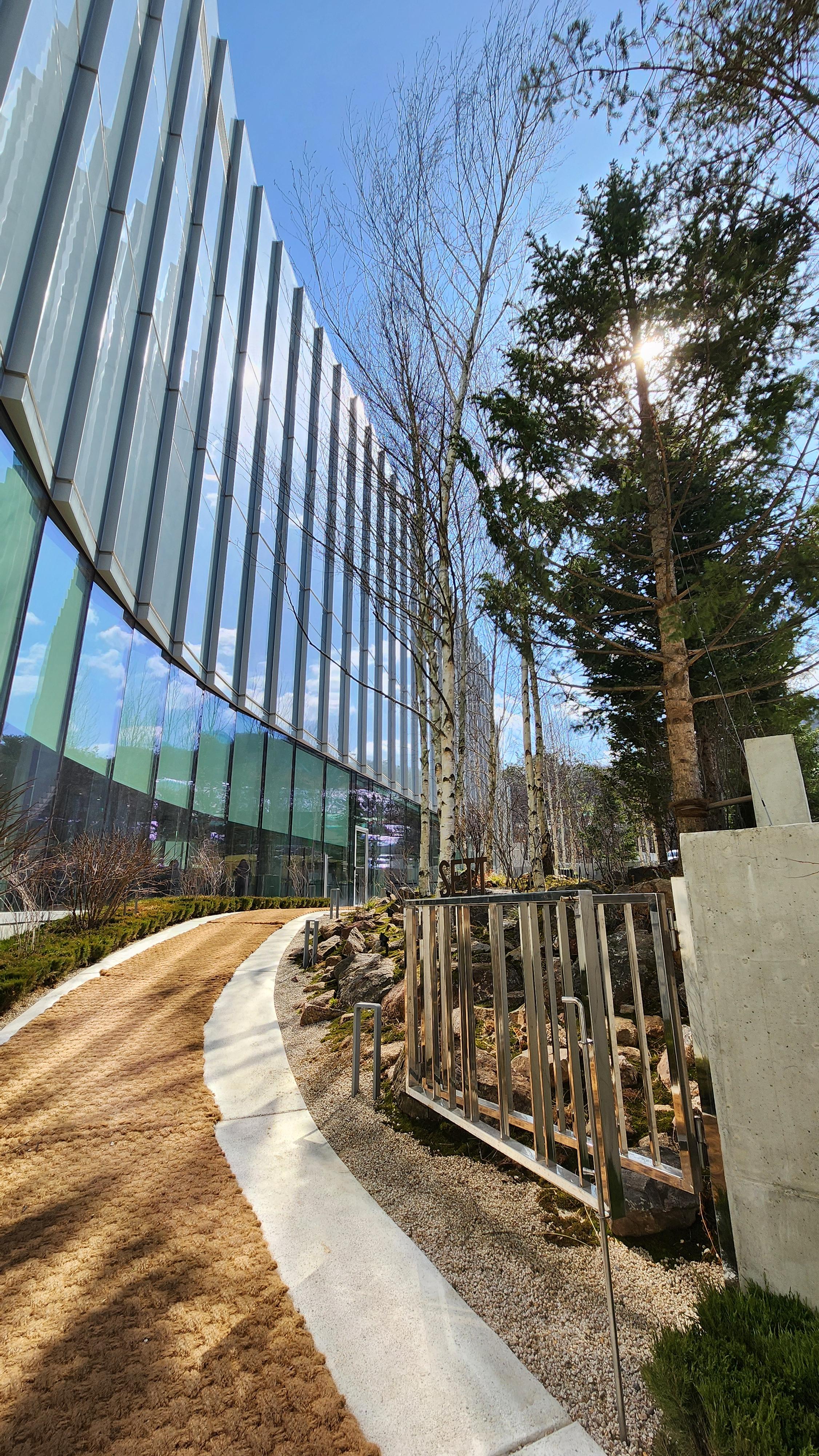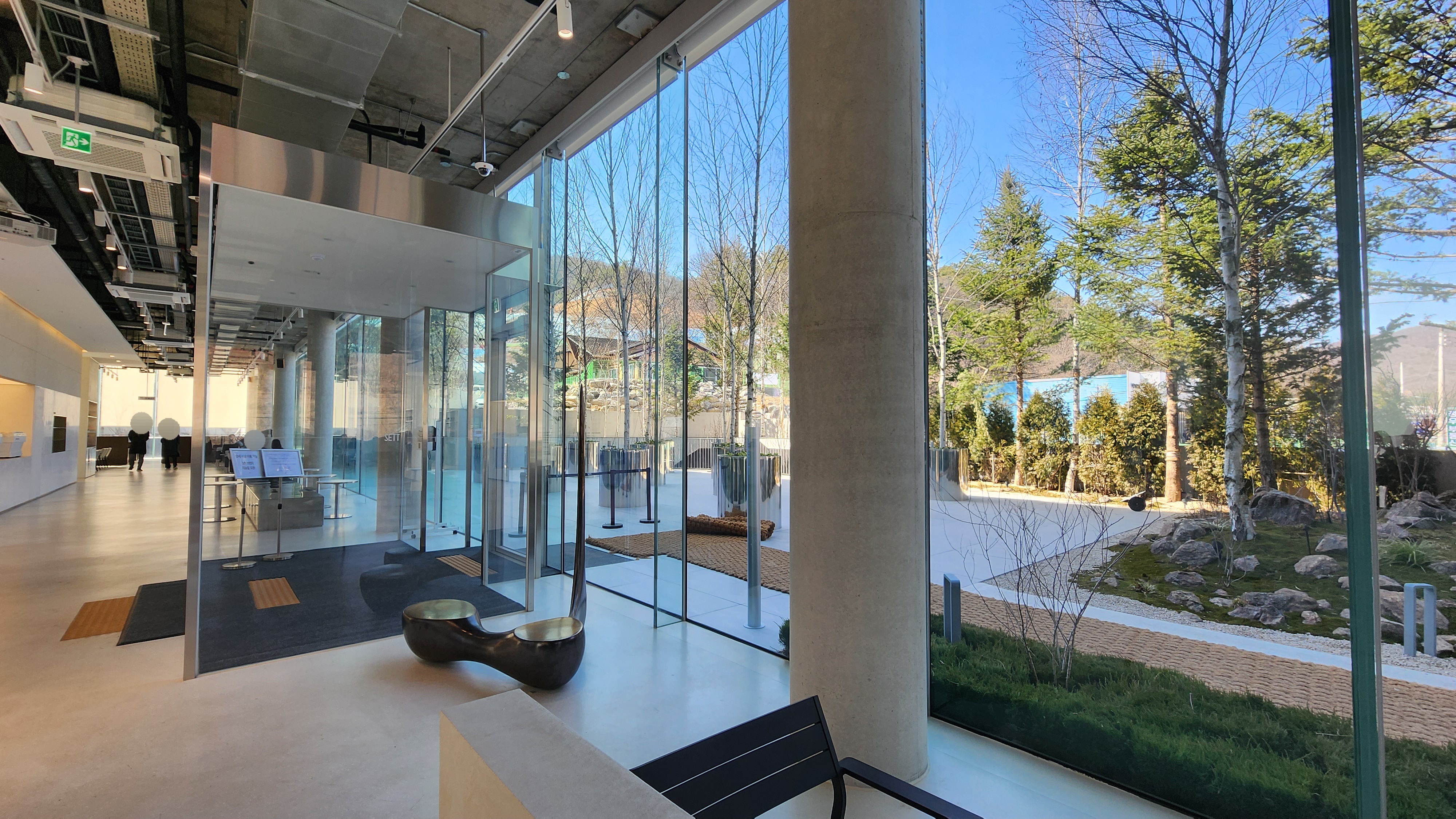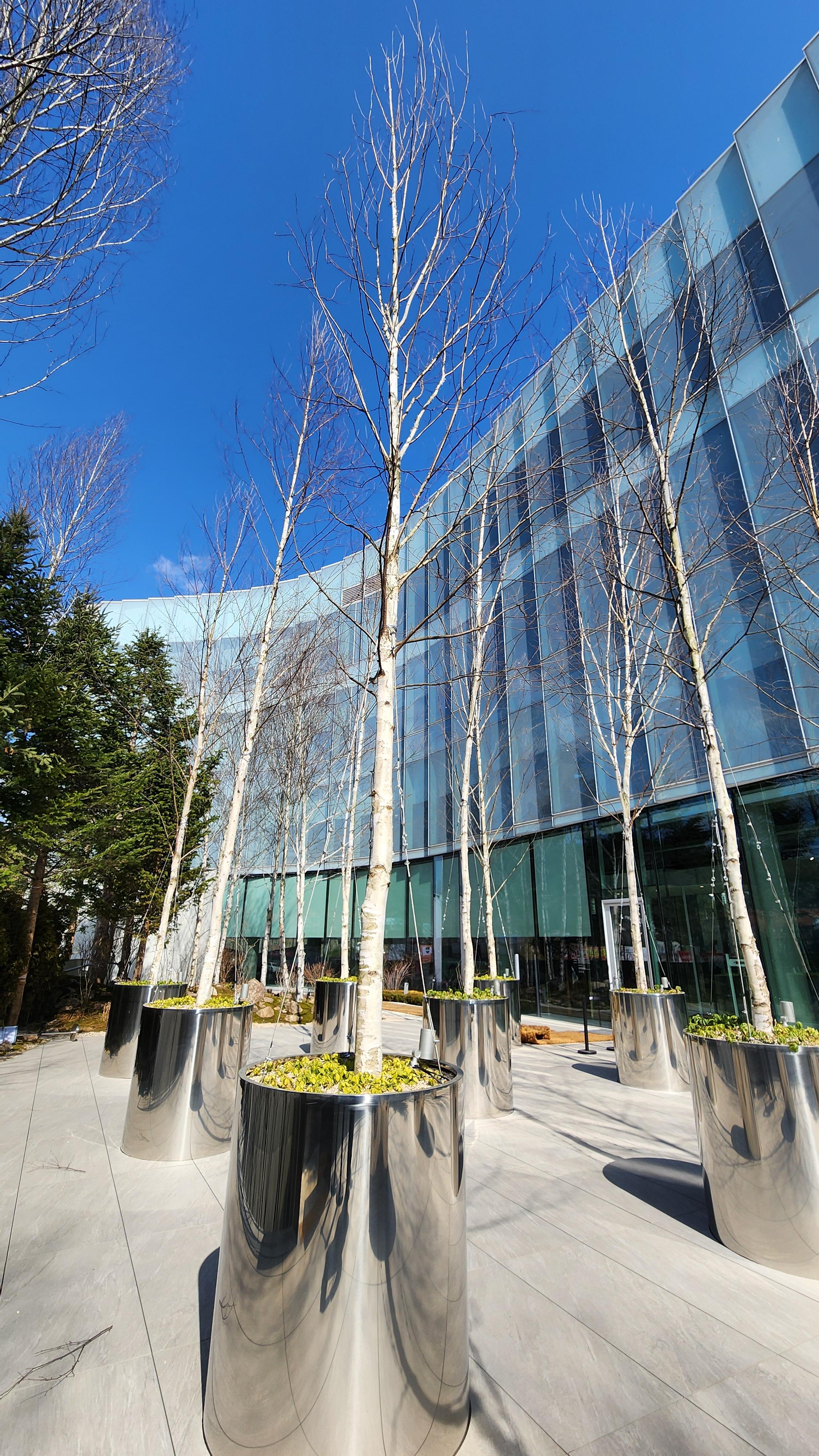 자작나무 조경이 있고 건물이 다 통창이라 카페 안이 훤히 보여요.
