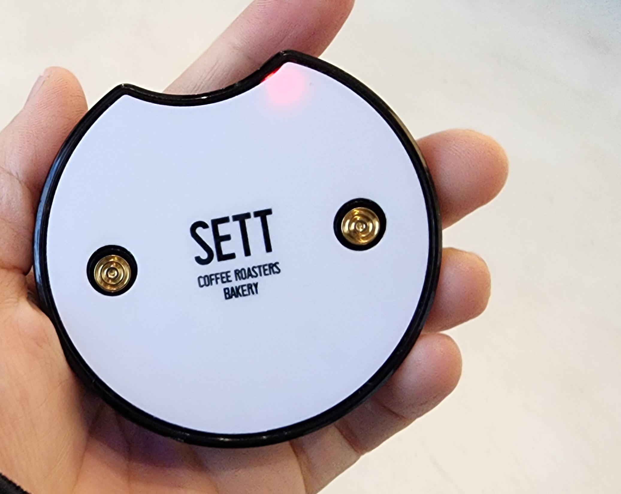 음료 주문 후 진동벨을 받았어요. 벨이 울리면 찾으러 가면 됩니다.