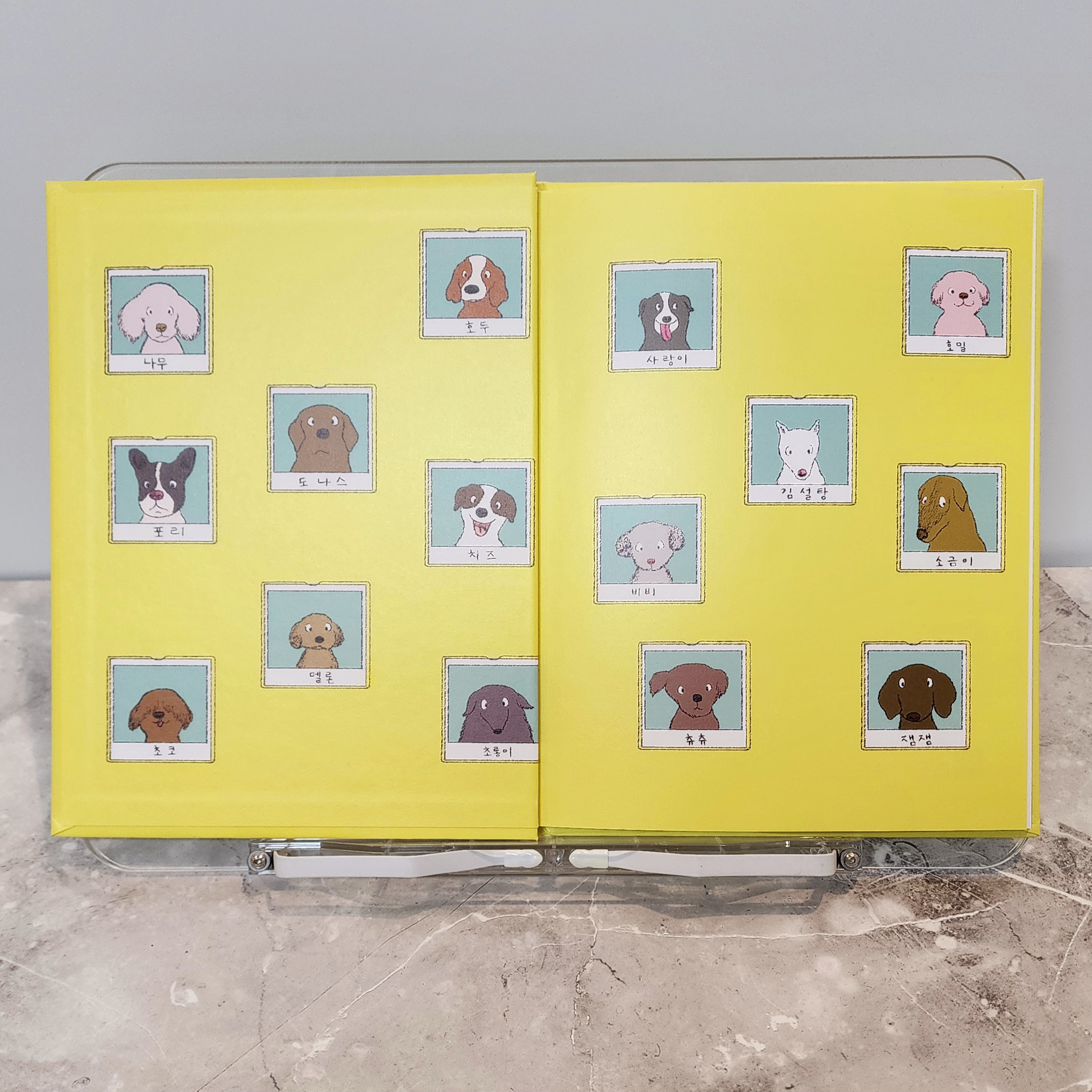 나무, 호두, 포리, 도나스... 등 많은 강아지들의 얼굴 사진이 면지에 나와있어요.