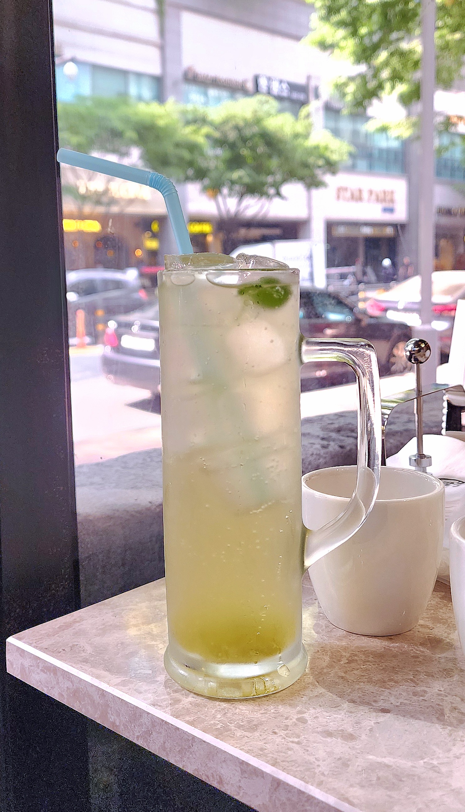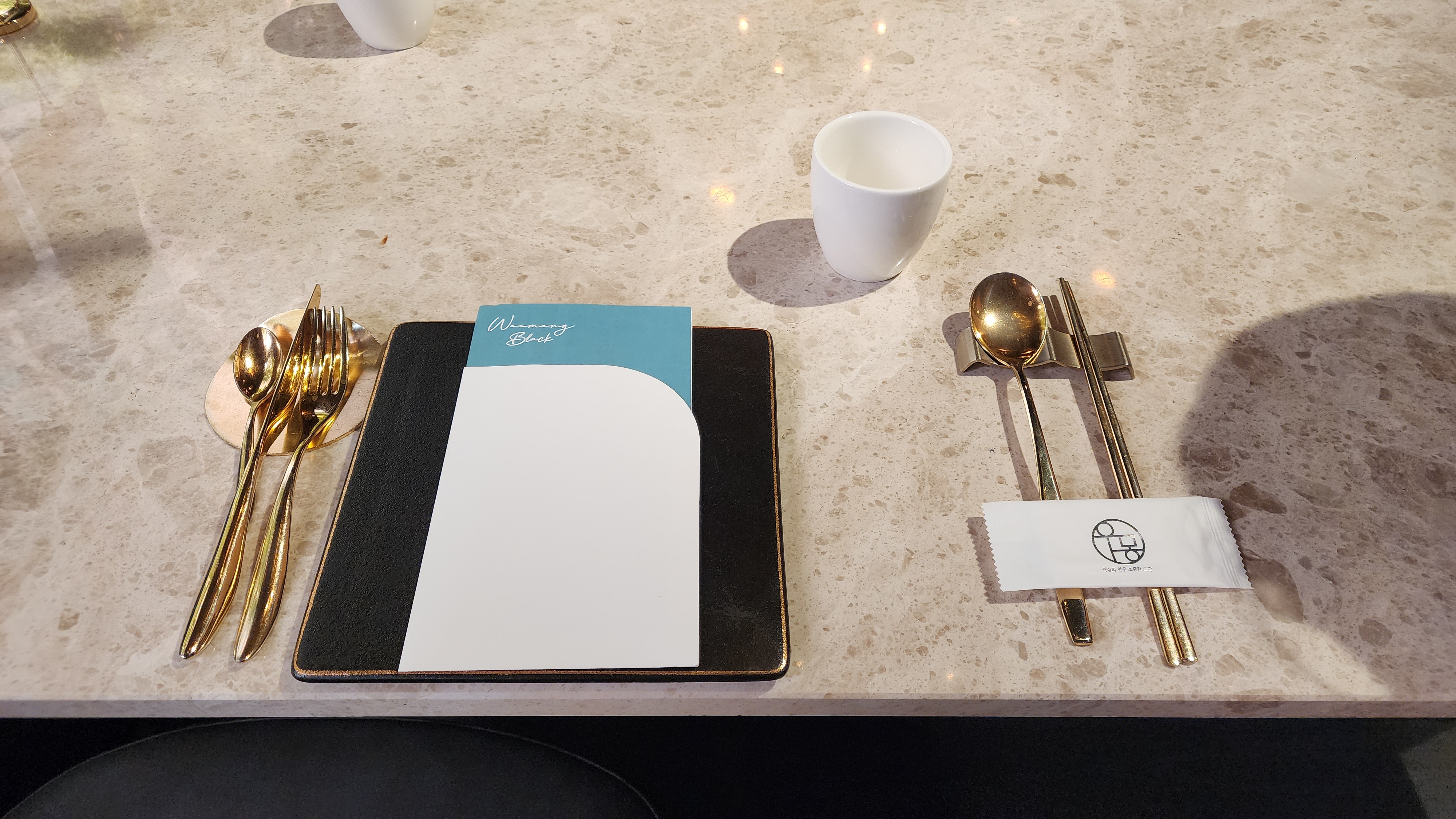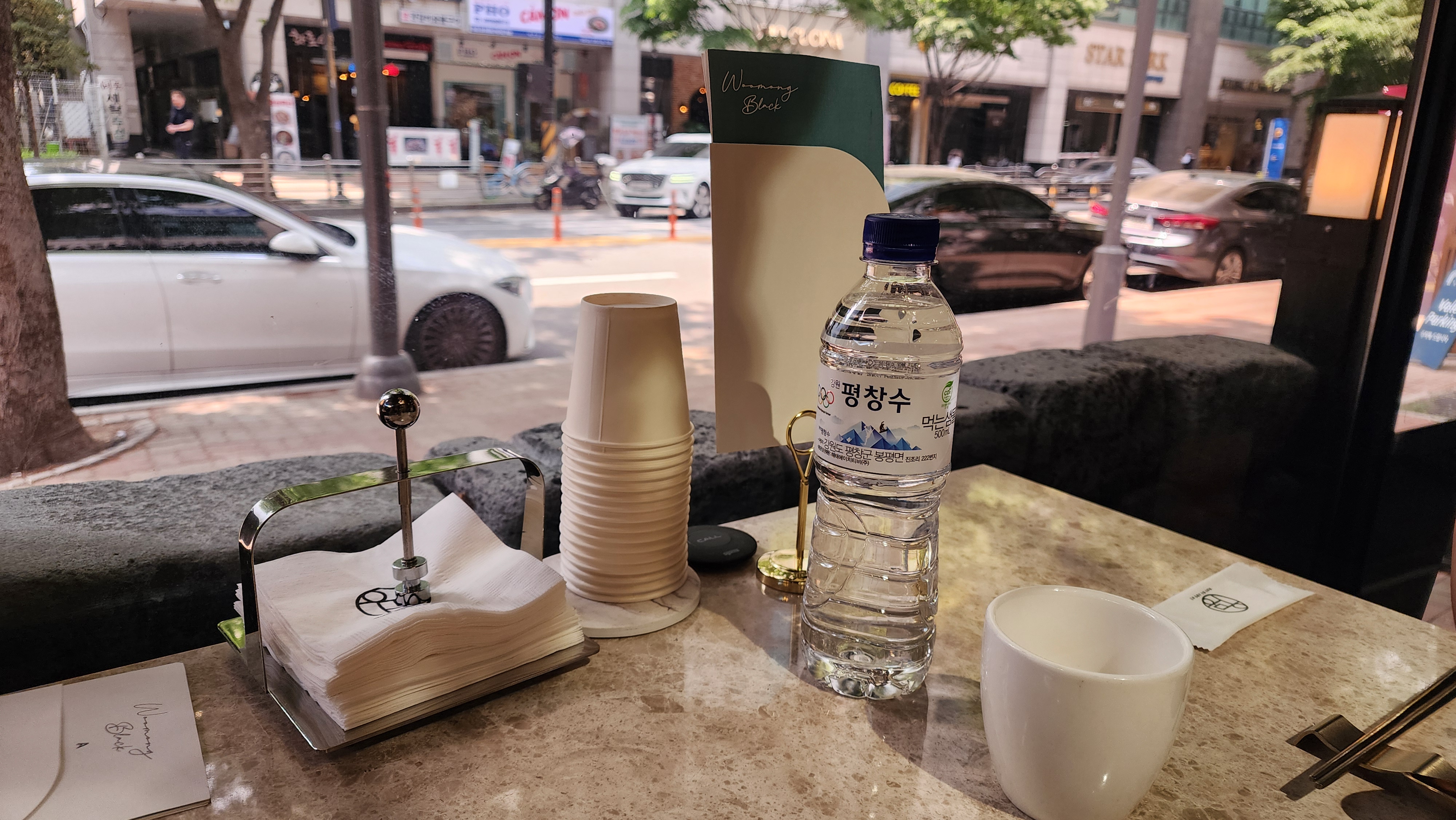테이블에 냅킨, 생수, 컵도 같이 있었어요.