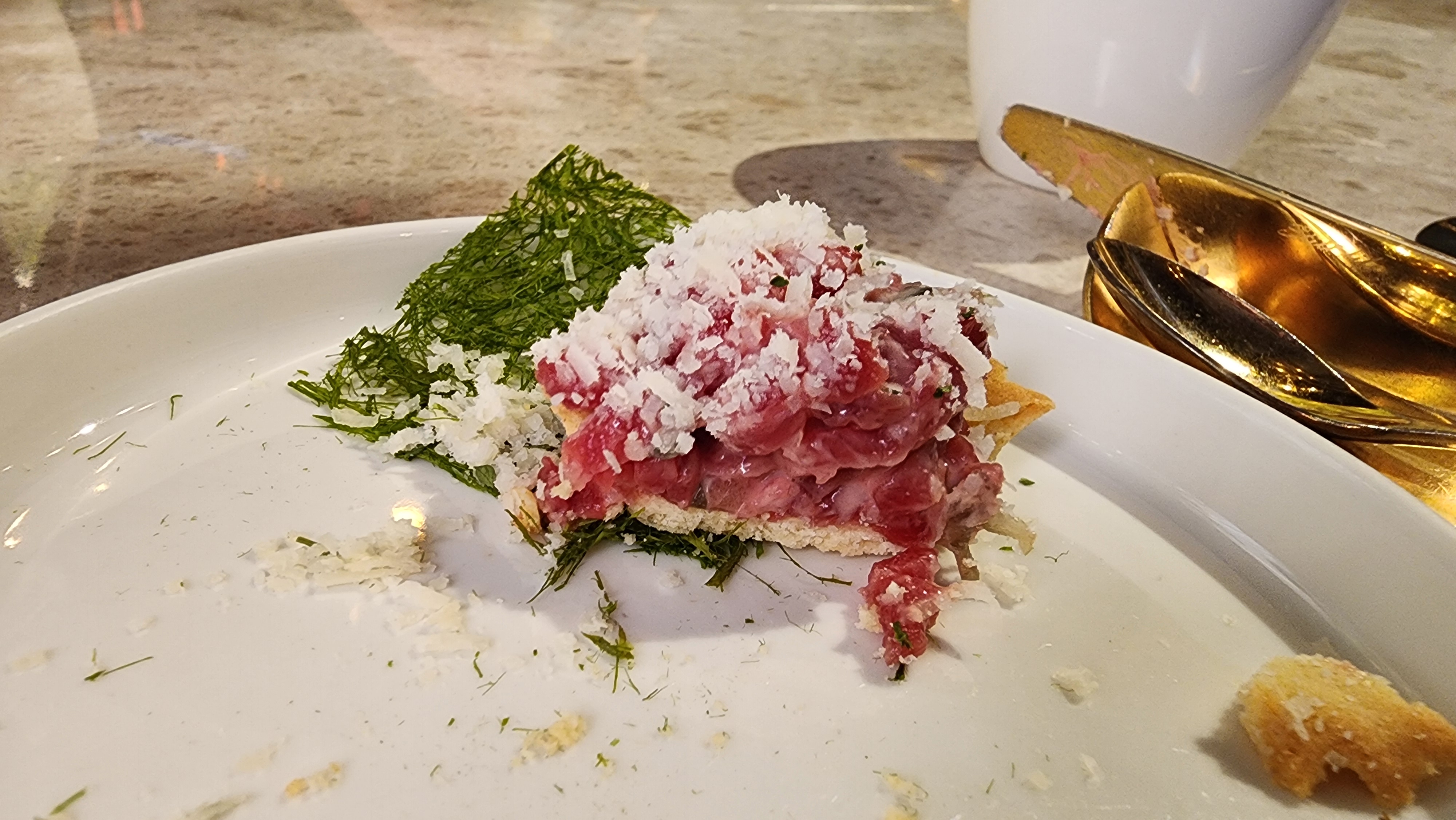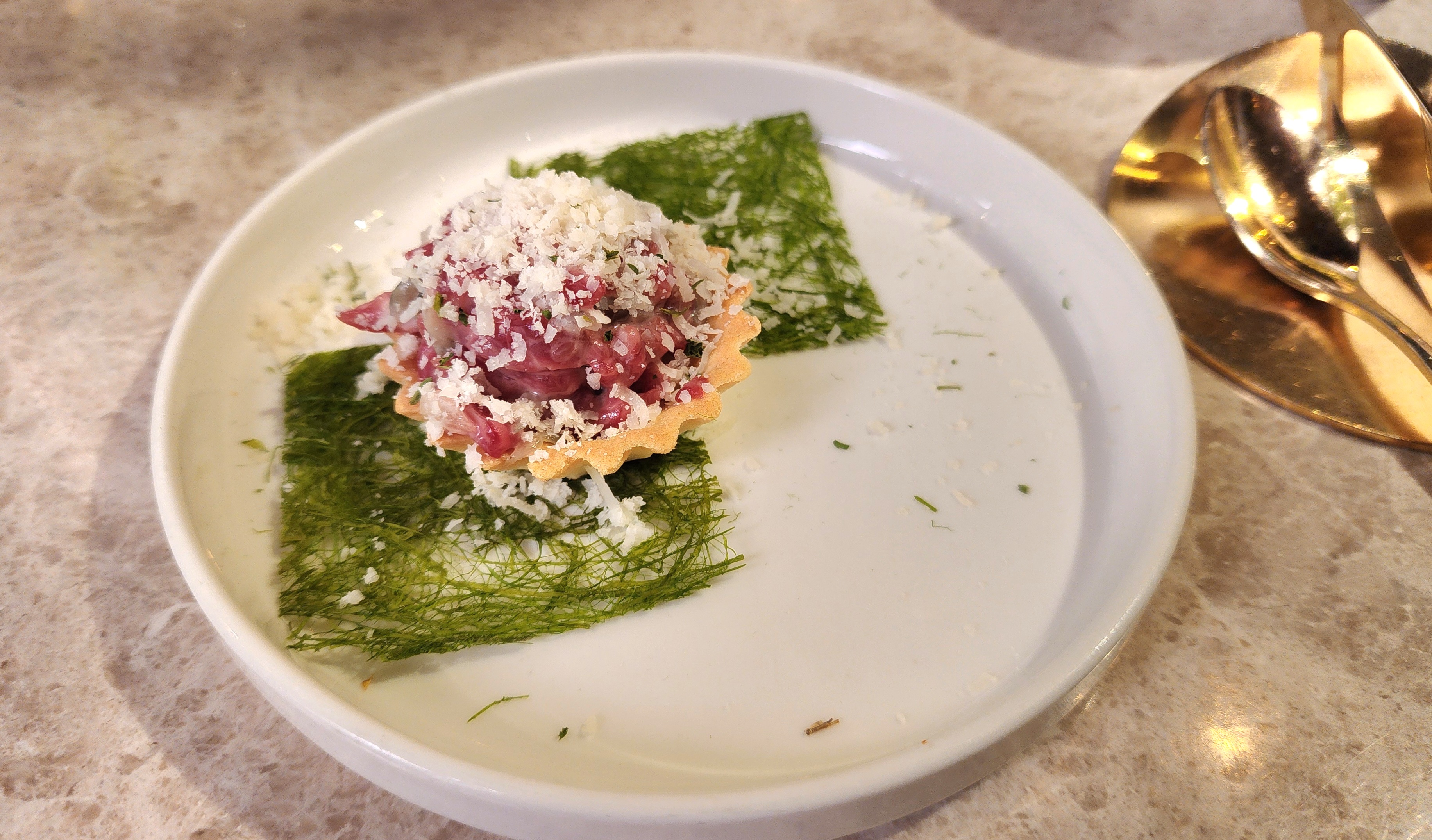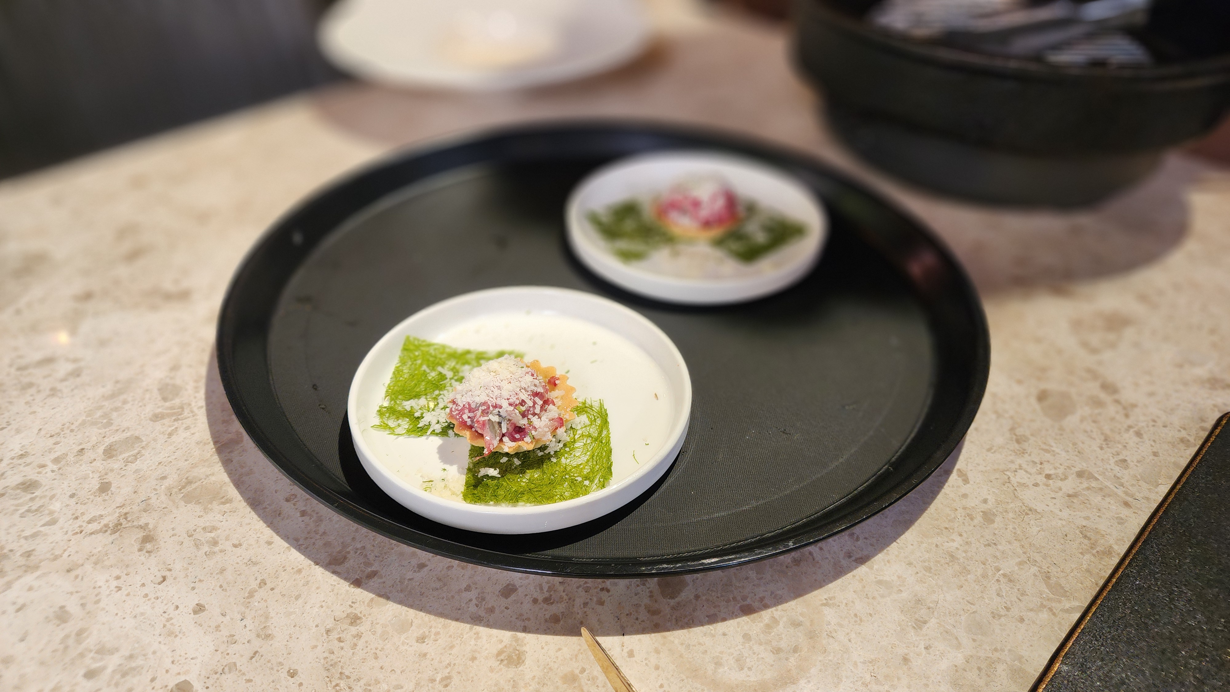 감태와 타르트지 위에 한우 육회가 올라가있었는데 보기에도 예쁘고 다른 곳에서는 먹어본 적 없는 에피타이저라 신기했어요.