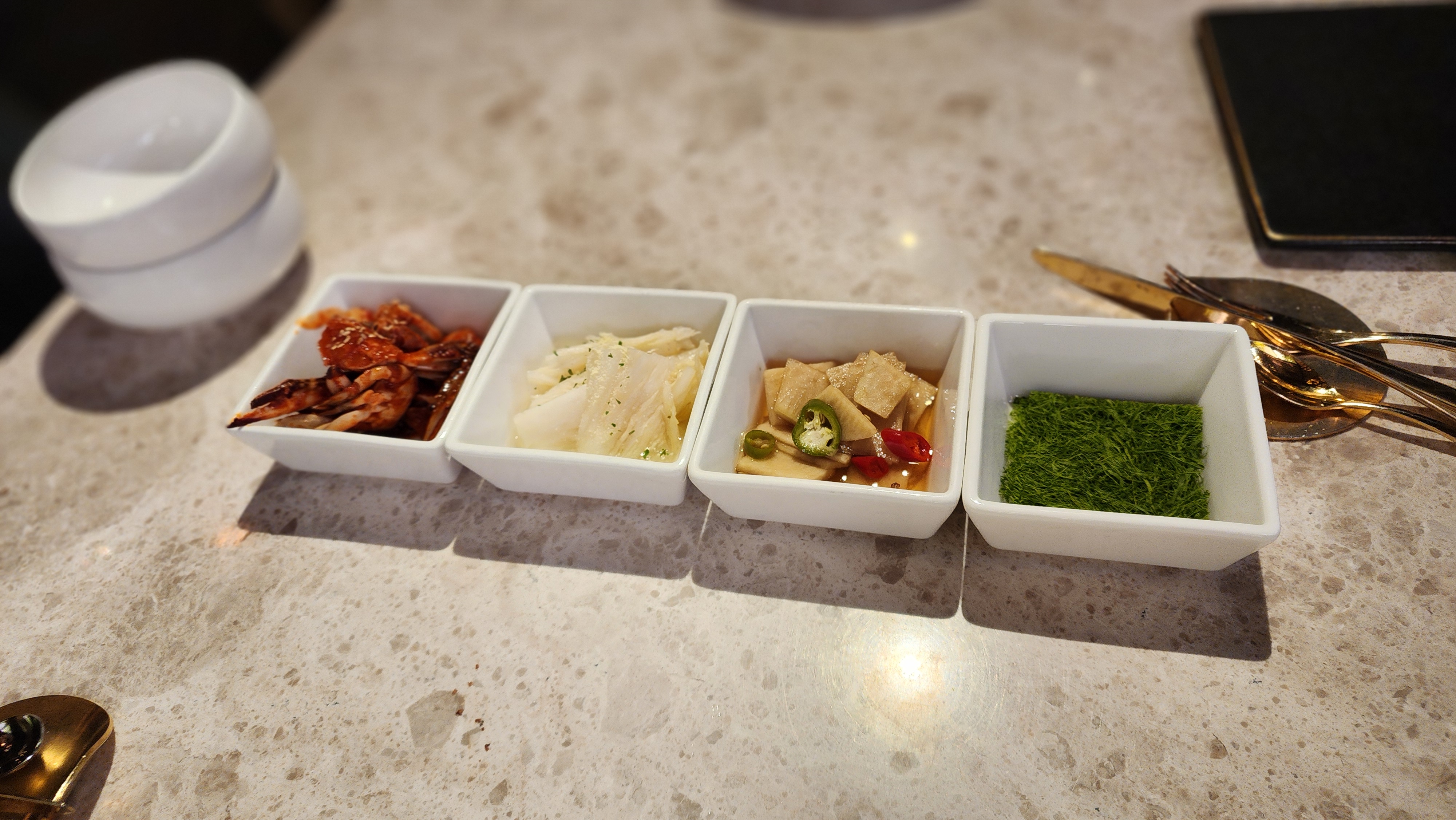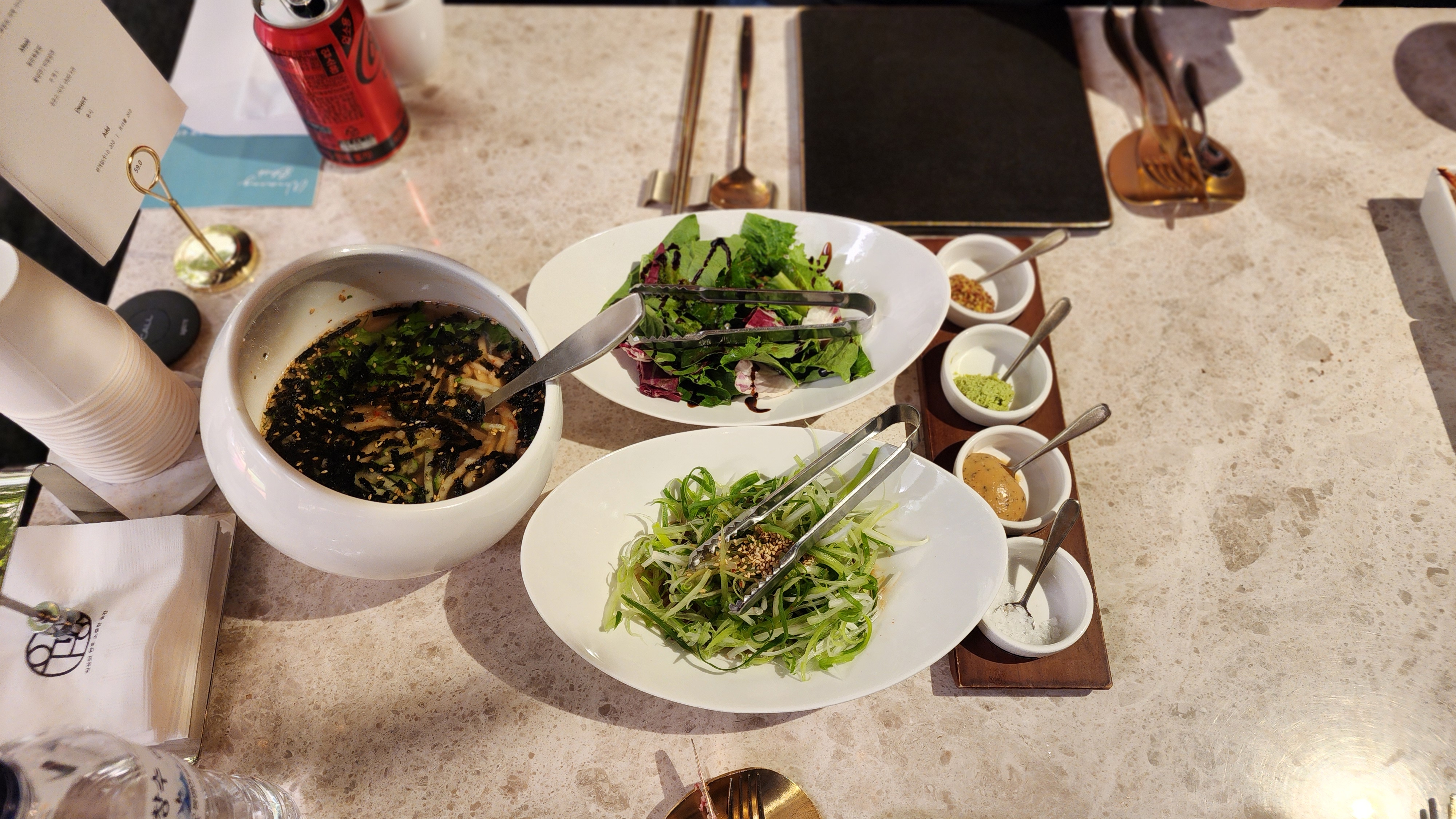 고기에 곁들일 말돈소금, 와사비, 홀그레인머스터드 와 묵사발, 샐러드, 파절이가 나왔어요.