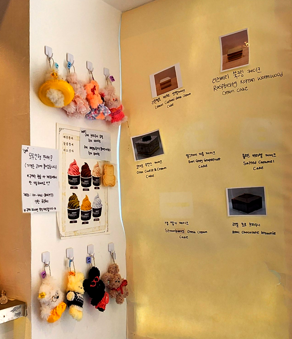 케이크 메뉴도 사진으로 붙어있었고 모루인형도 판매중이었어요.