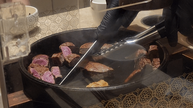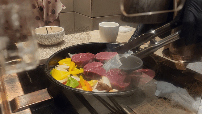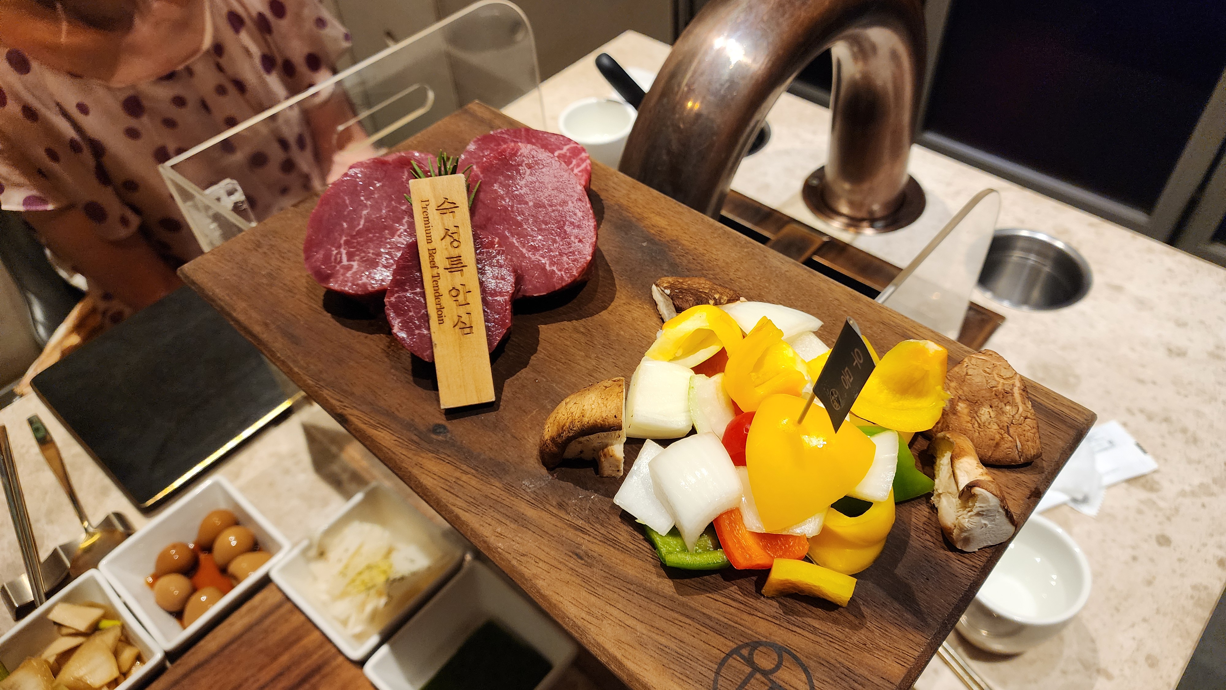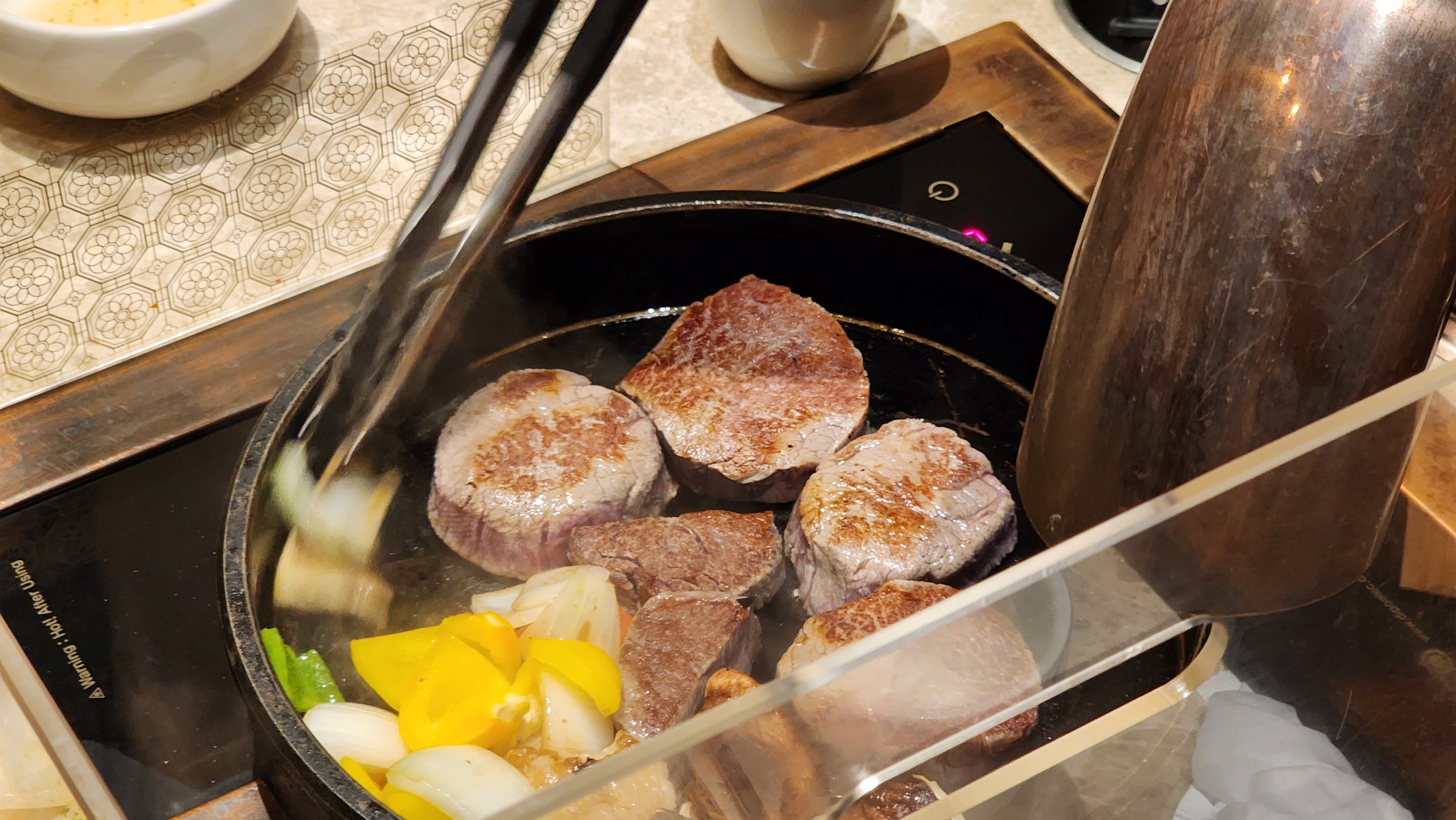 채소와 고기를 함께 굽다가 채소가 먼저 익어서 빼주고 그 후에 고기를 좀 더 구워낸 뒤 잘라 주시더라구요.