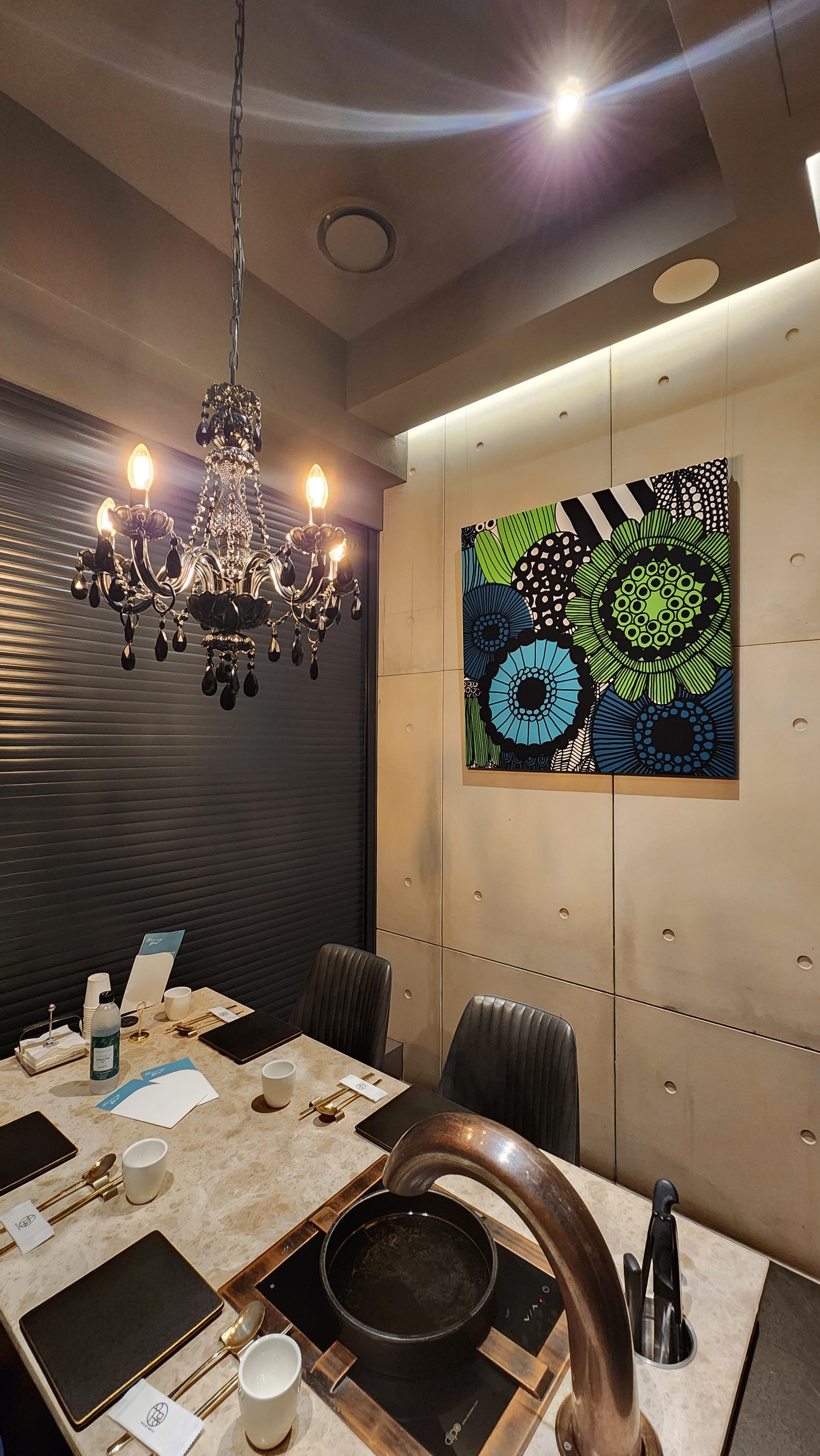 화려한 샹들리에 조명과 벽에 걸린 그림이 인상적이었고, 예약 인원대로 테이블도 셋팅되어있었어요.