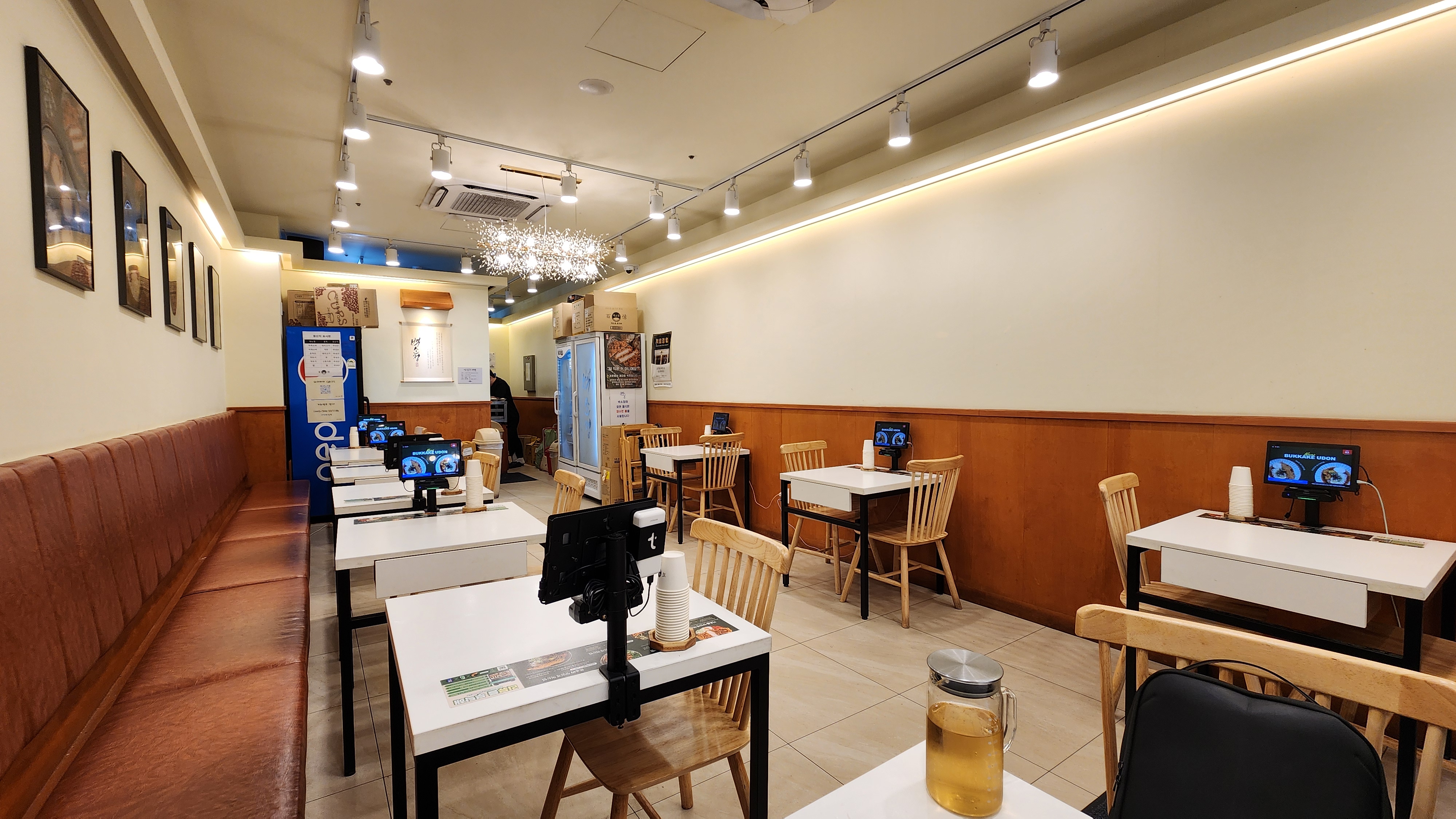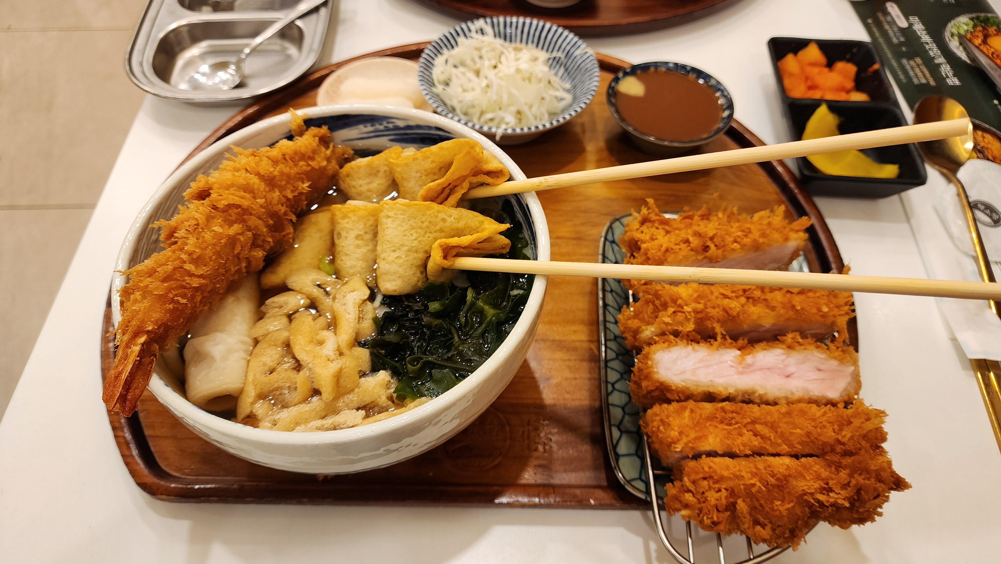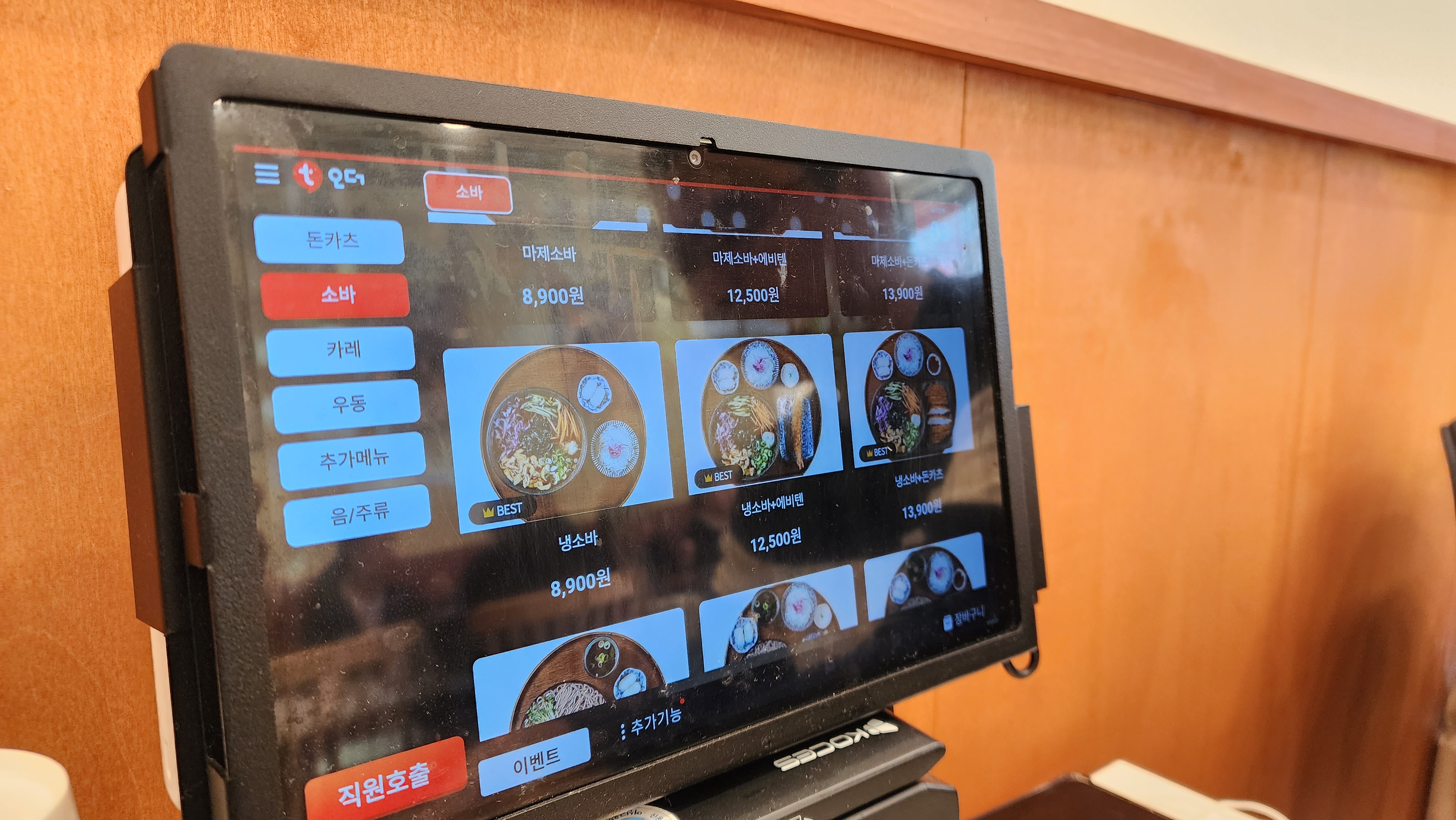 메뉴는 돈카츠, 소바, 카레, 우동 등이 있고 키오스크로 주문하면 되어요.