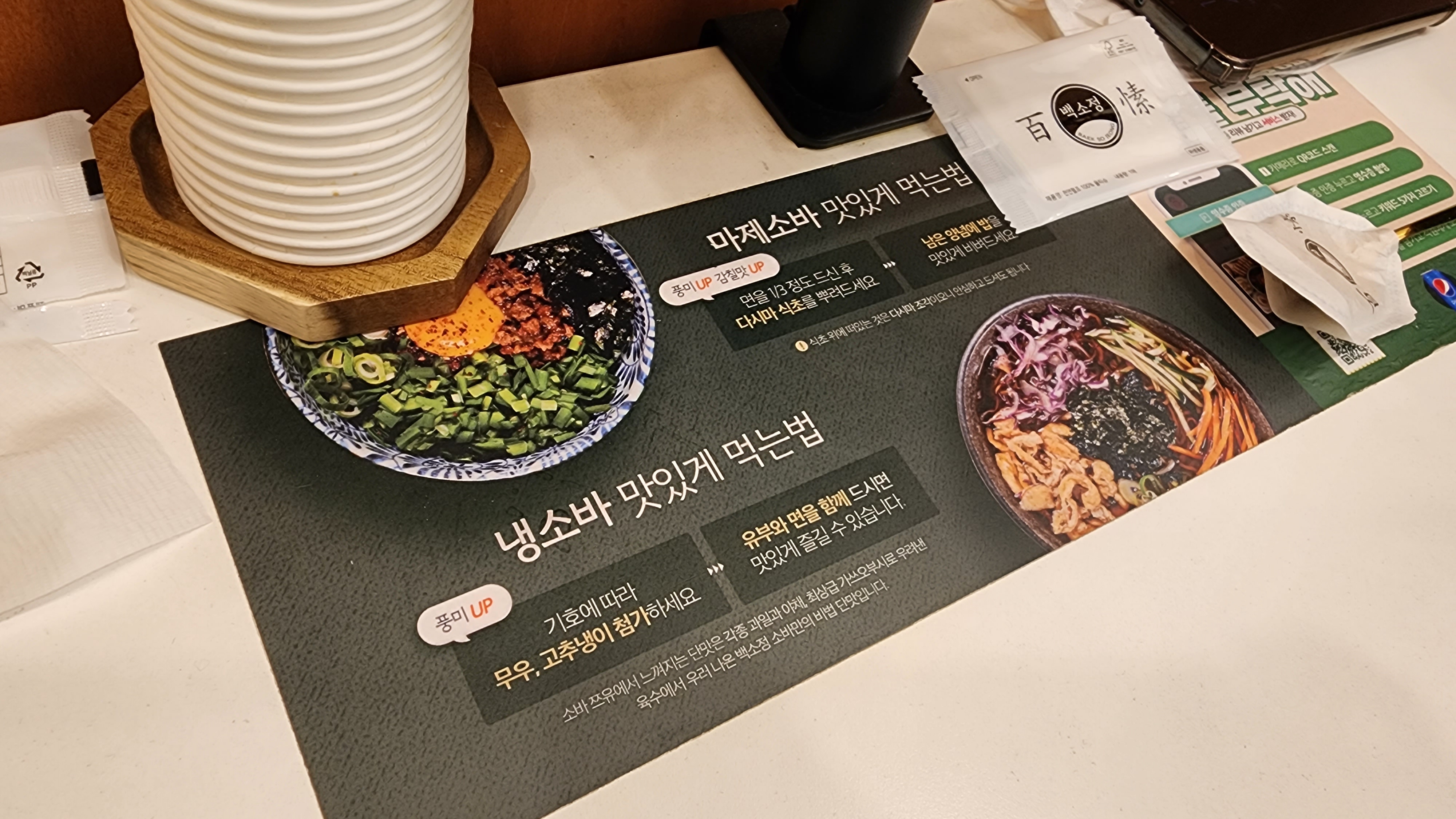 냉소바는 기호에 따라 무우와 고추냉이를 첨가해서 먹고 유부와 면을 함께 먹으면 맛있게 먹을 수 있다고 적혀있더군요.