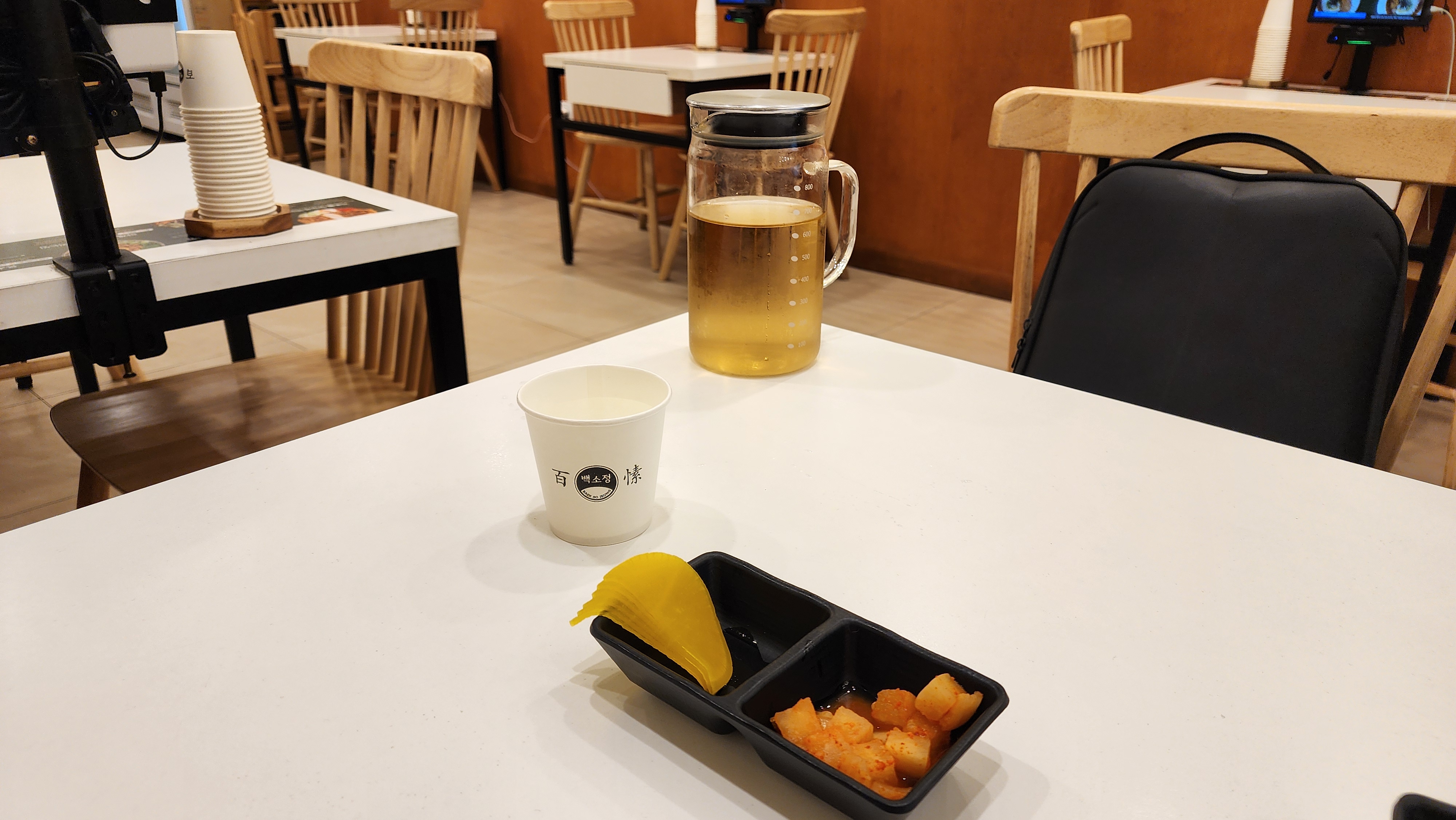 종이컵이 비치되어 있었고 보리차와 단무지, 깍두기를 가져다 주시더군요.