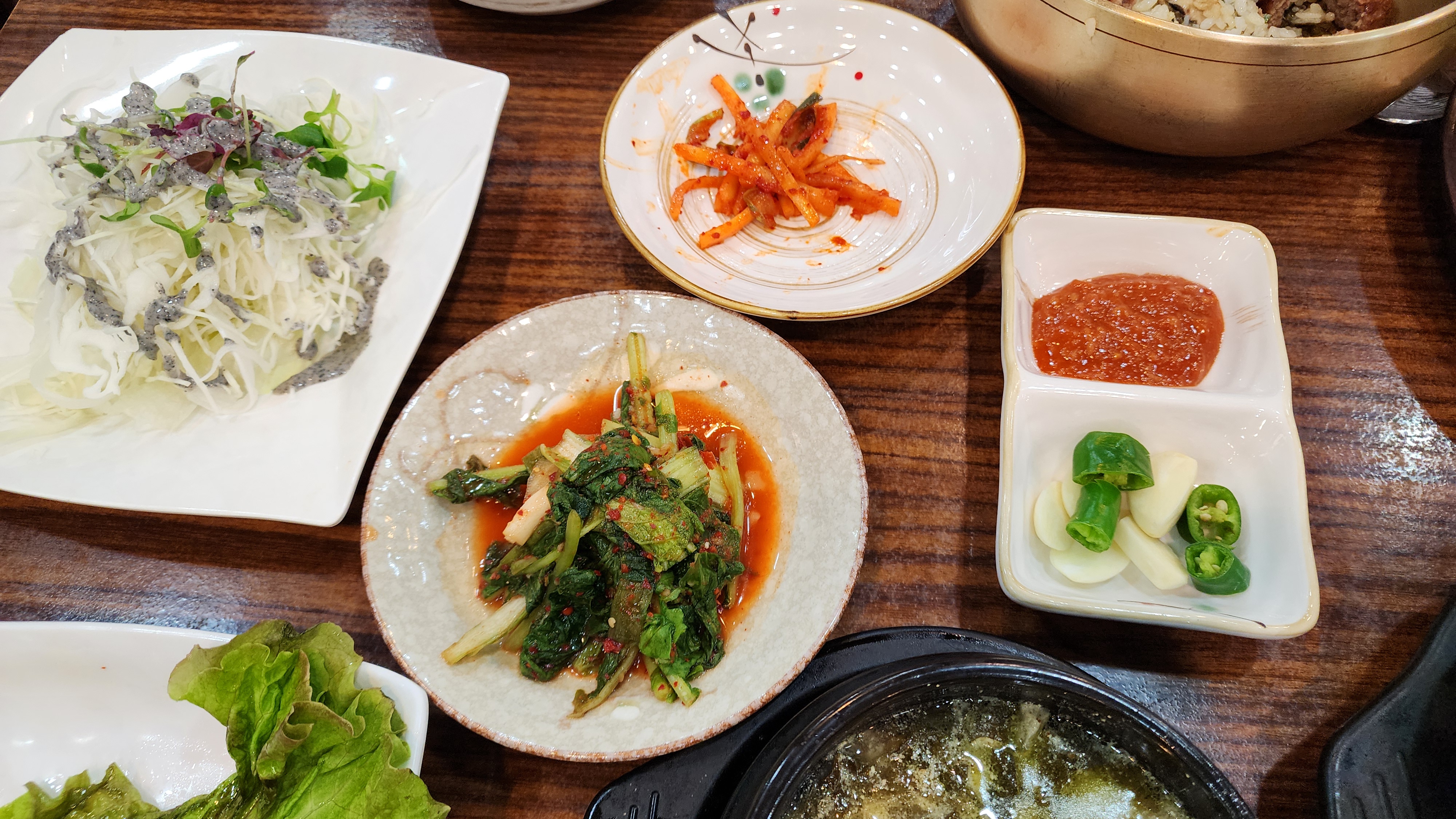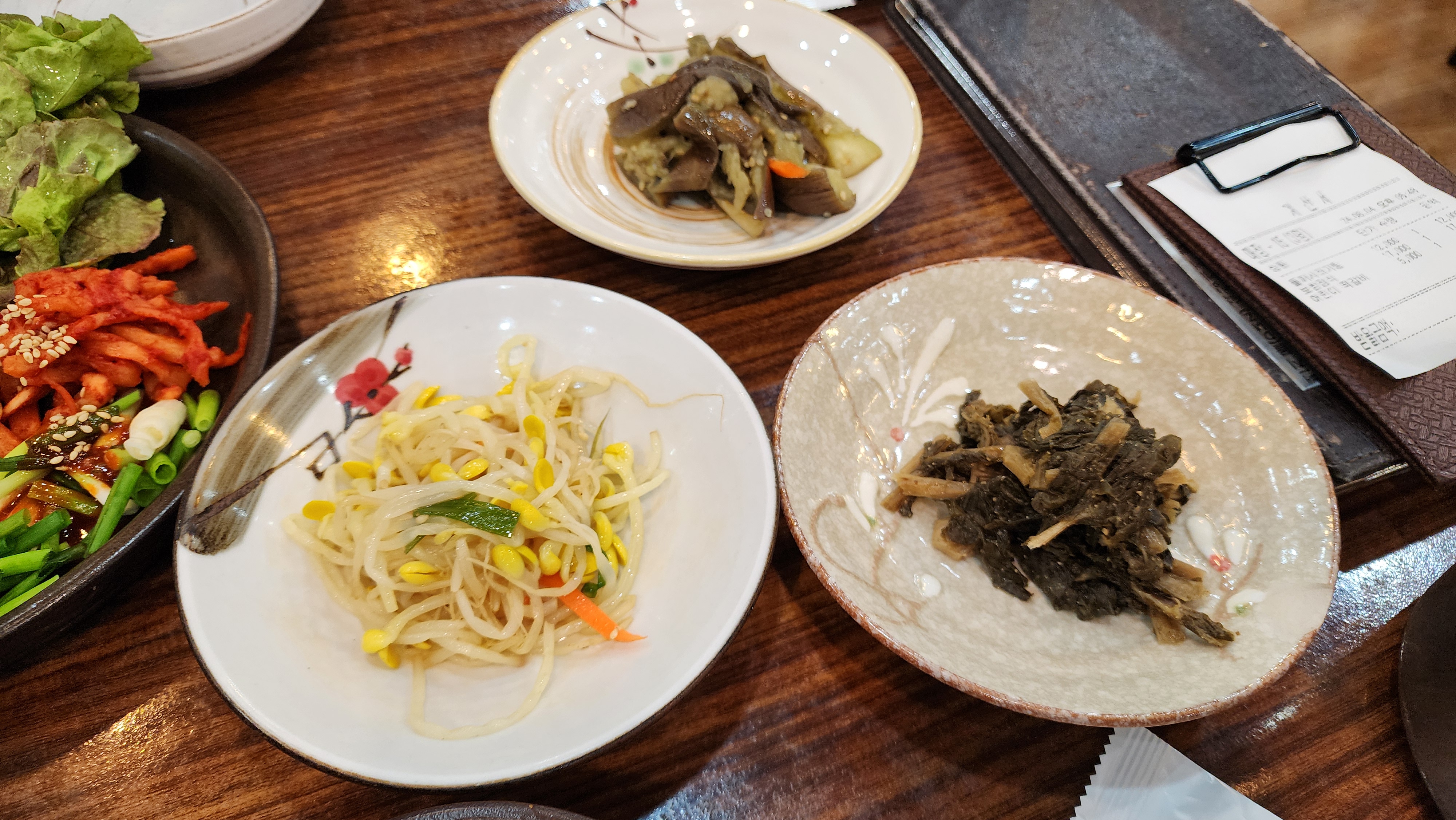 나물류, 샐러드 등이 나왔고, 보쌈정식에 쌈장이랑 편마늘, 고추가 같이 나왔어요.