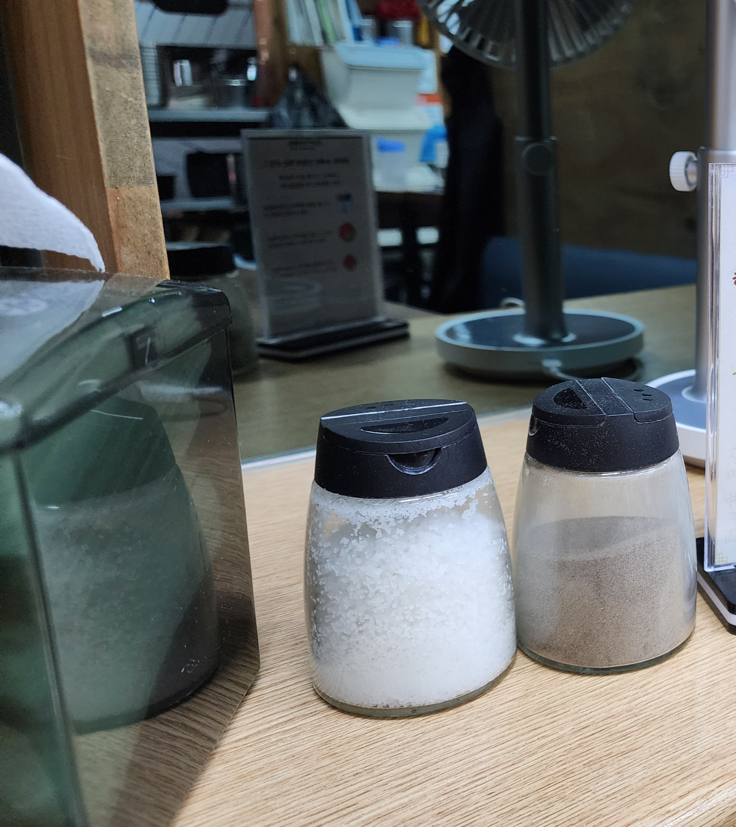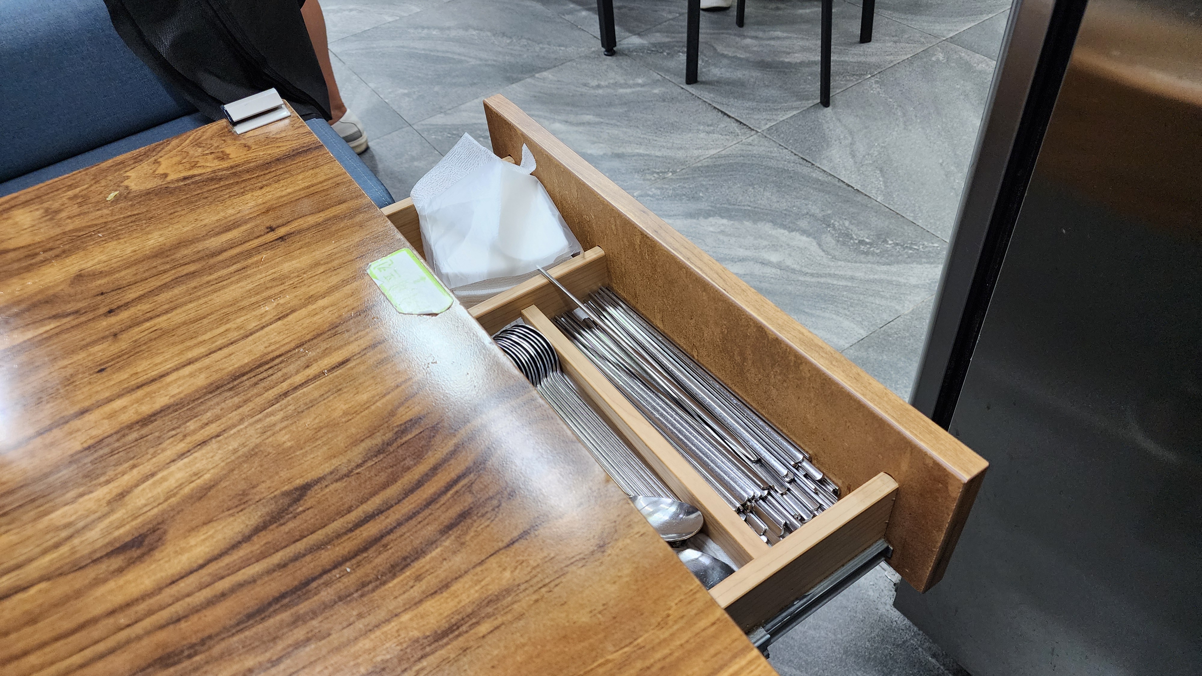 서랍을 열면 식기와 냅킨이 들어있고, 소금과 후추, 1회용 앞치마가 있었어요.