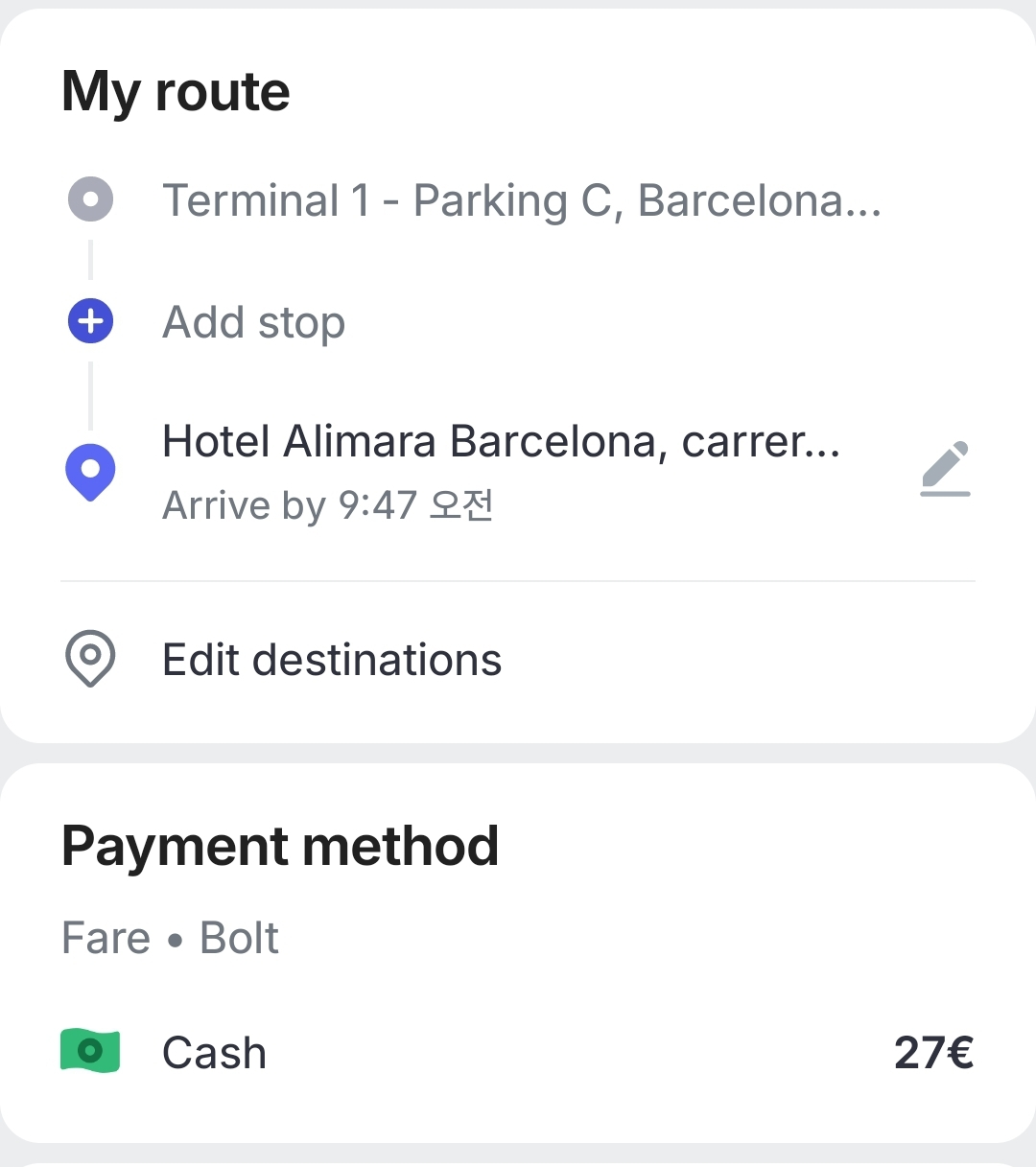 바르셀로나 엘프라트 공항에서 호텔까지는 차로 20분 정도 거리였고 볼트를 이용했는데요, 시간대나 차 기종에 따라서 가격은 달라질거라 참고하시라고 볼트 캡쳐해놓았던것도 올려보아요.