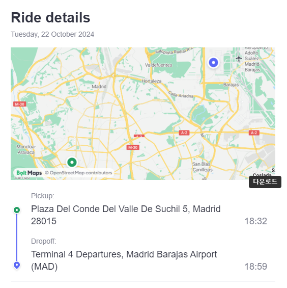 마드리드 공항까지는 택시로 30분가량 걸리더라구요.