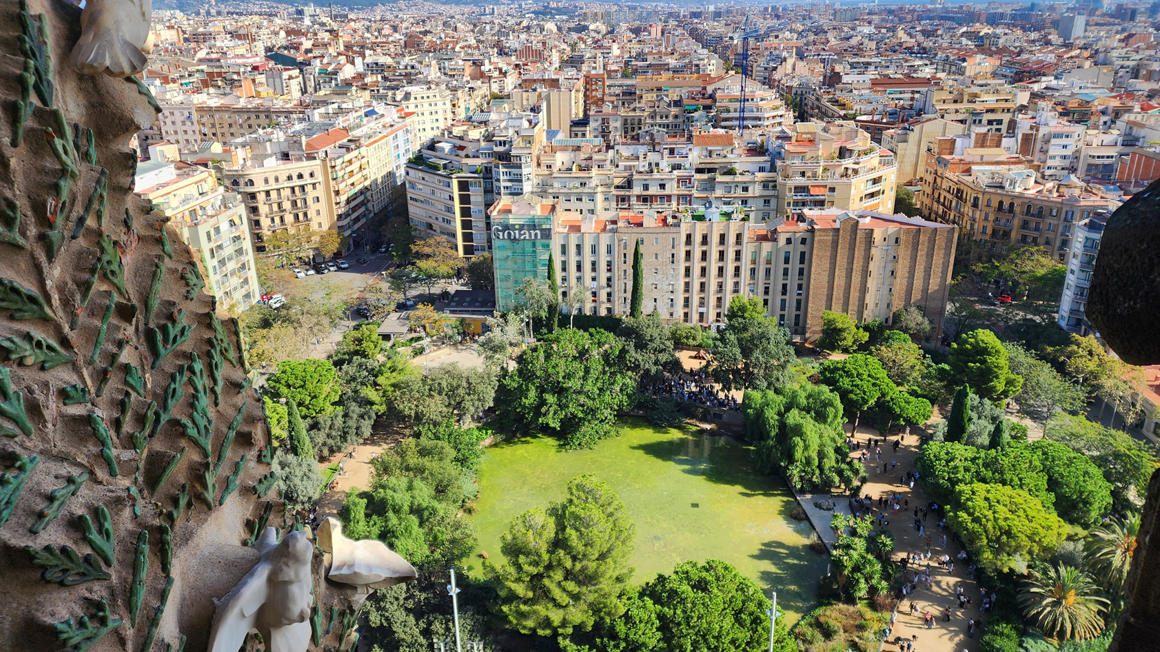 타워에서는 사그라다 파밀리아를 예쁘게 볼 수 있는 호수가 있는 공원을 내려다 볼 수 있어요.