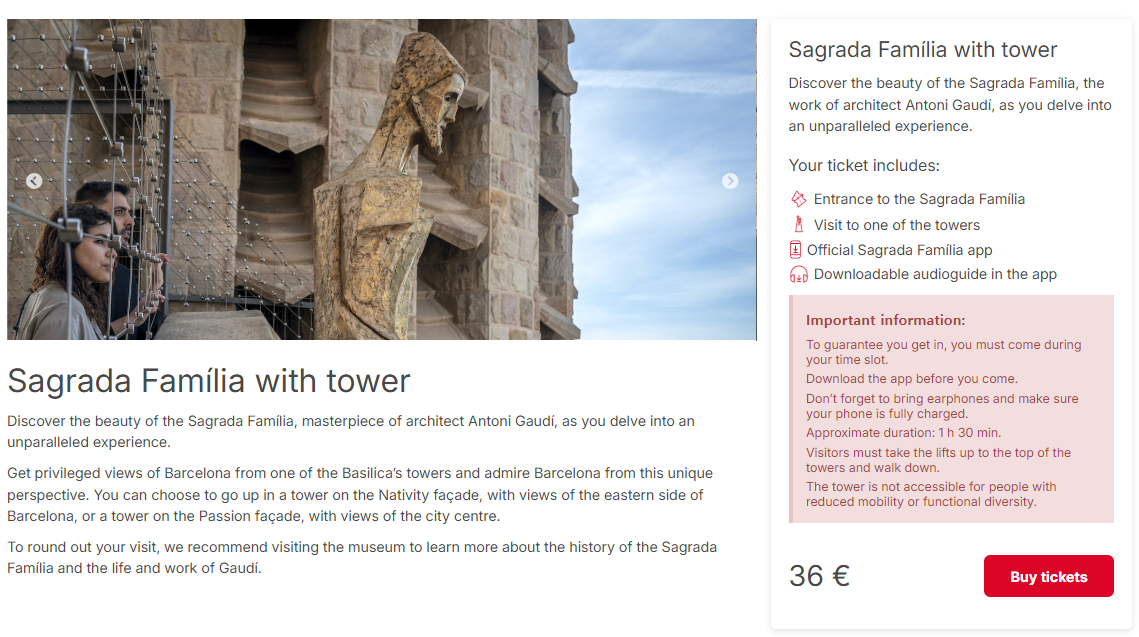 저는 36유로짜리 사그라다 파밀리아 와 타워 티켓을 구매했어요.