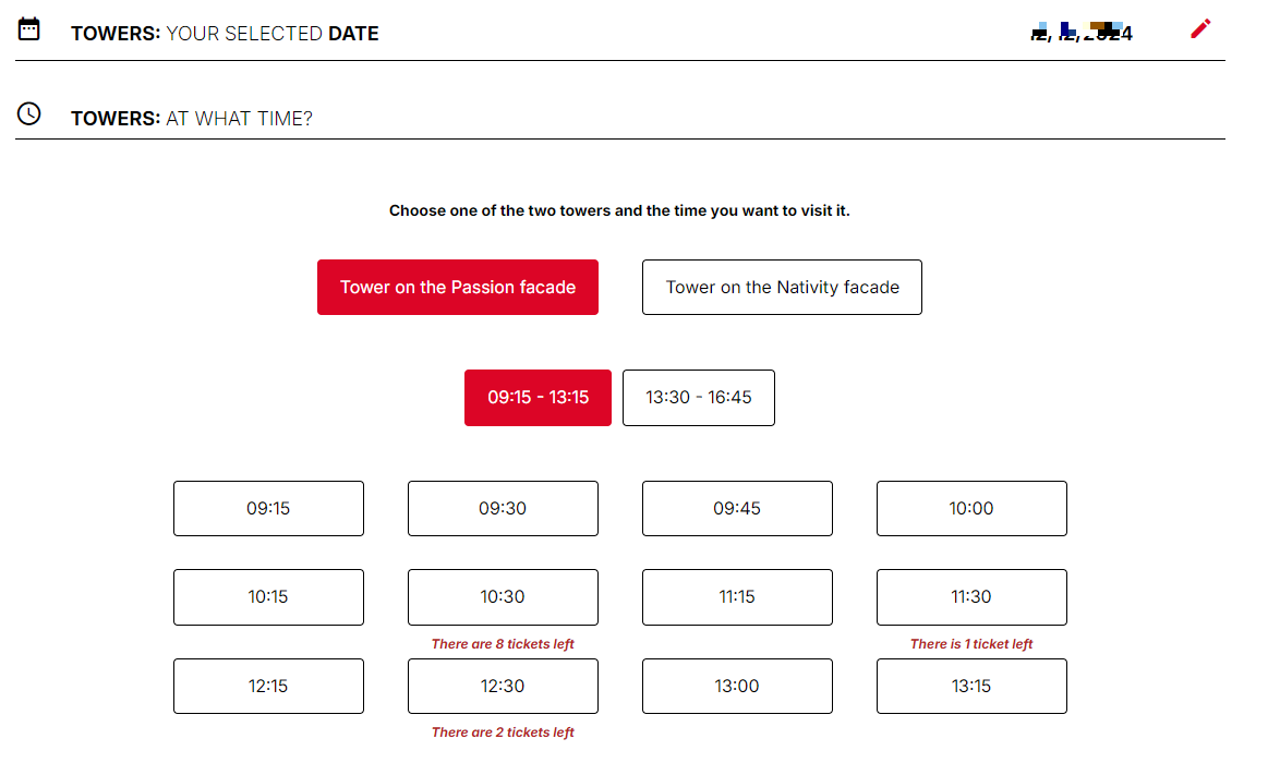 타워는 탄생의파사드쪽에 하나 수난의 파사드 쪽에 또 하나 이렇게 두개의 타워가 있는데요 관람을 원하시는 날짜와 시간을 고르면 타워 관람 시간대를 선택할 수 있어요.