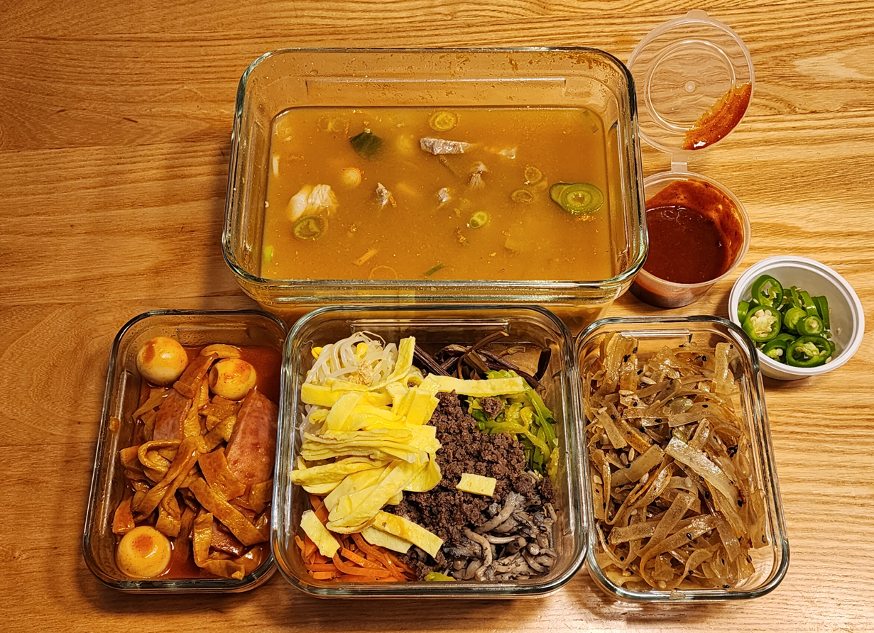이번에 왔던 반찬은 비빔밥용 오색나물에 고추장이 더 곁들여 왔고, 고깃집 된장찌개에 넣어먹으라고 고추도 따로 보내주셨더라구요.
