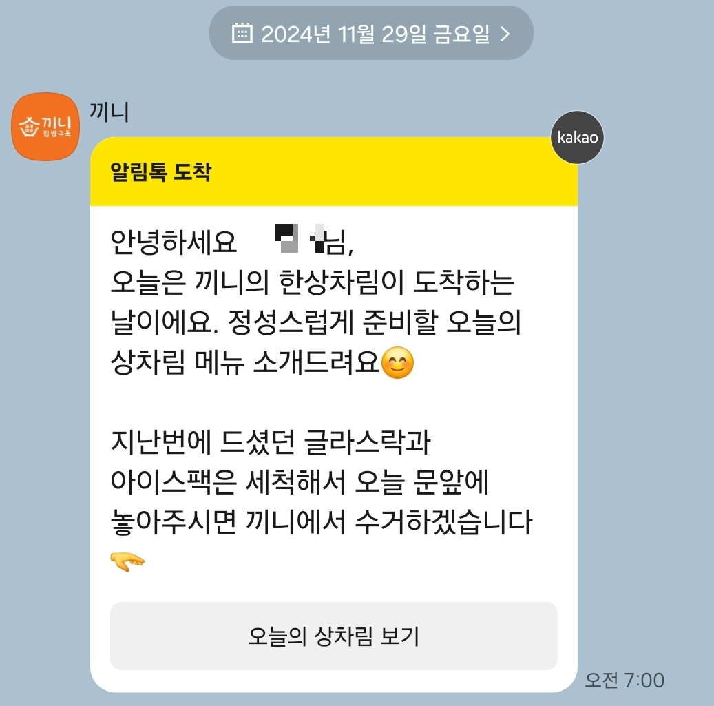 맘카페에 올렸더니 집단 지성이 동원되어 다양한 반찬가게나 반찬 배달 등을 추천해 주셨는데요, 그중에서 선택하게 된 곳이 '집밥구독 끼니' 예요.