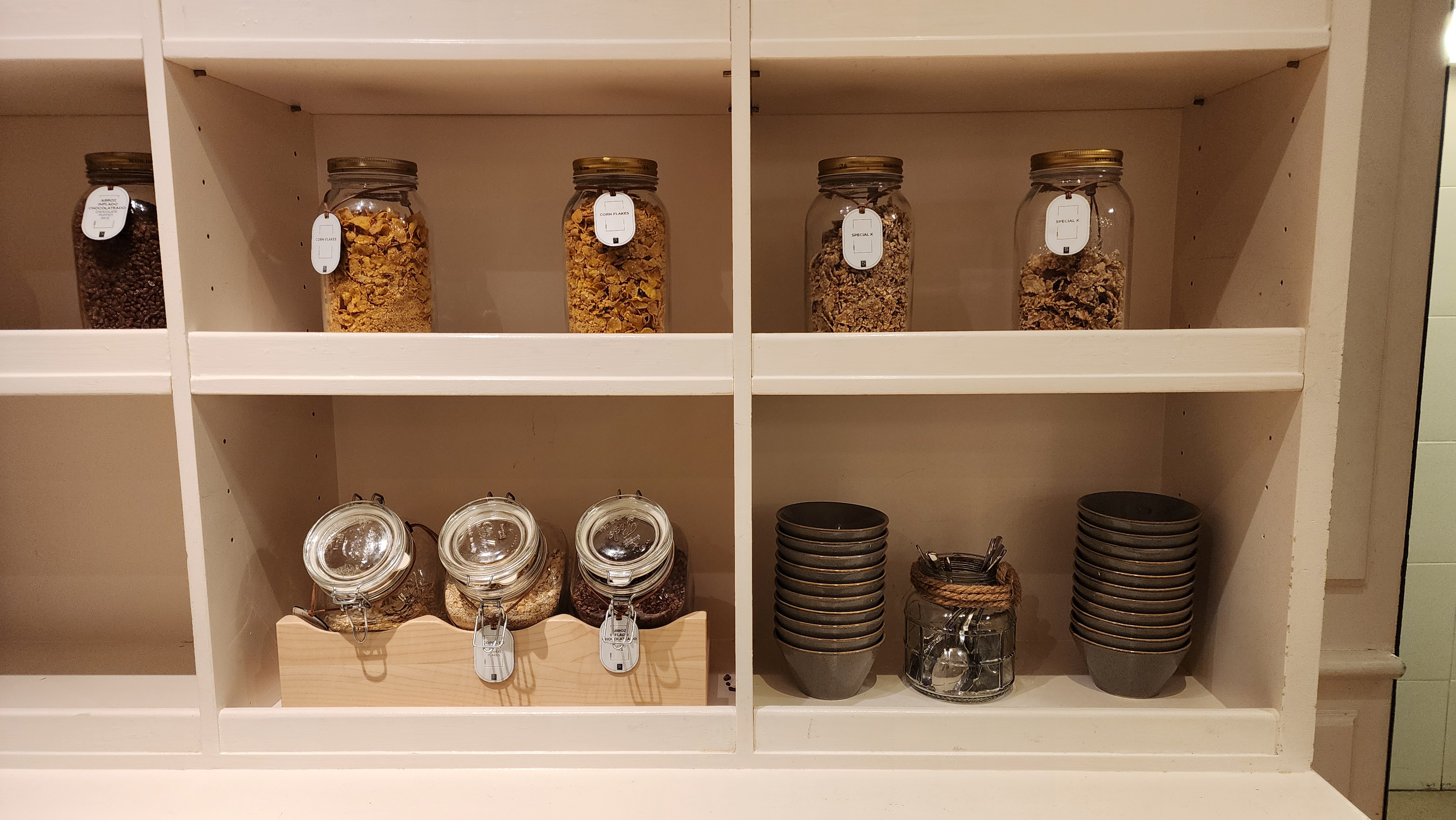 병에 담긴 씨리얼들은 디스플레이용 같았고 개폐 뚜껑있는 병에 담긴 씨리얼을 이용할 수 있었어요.