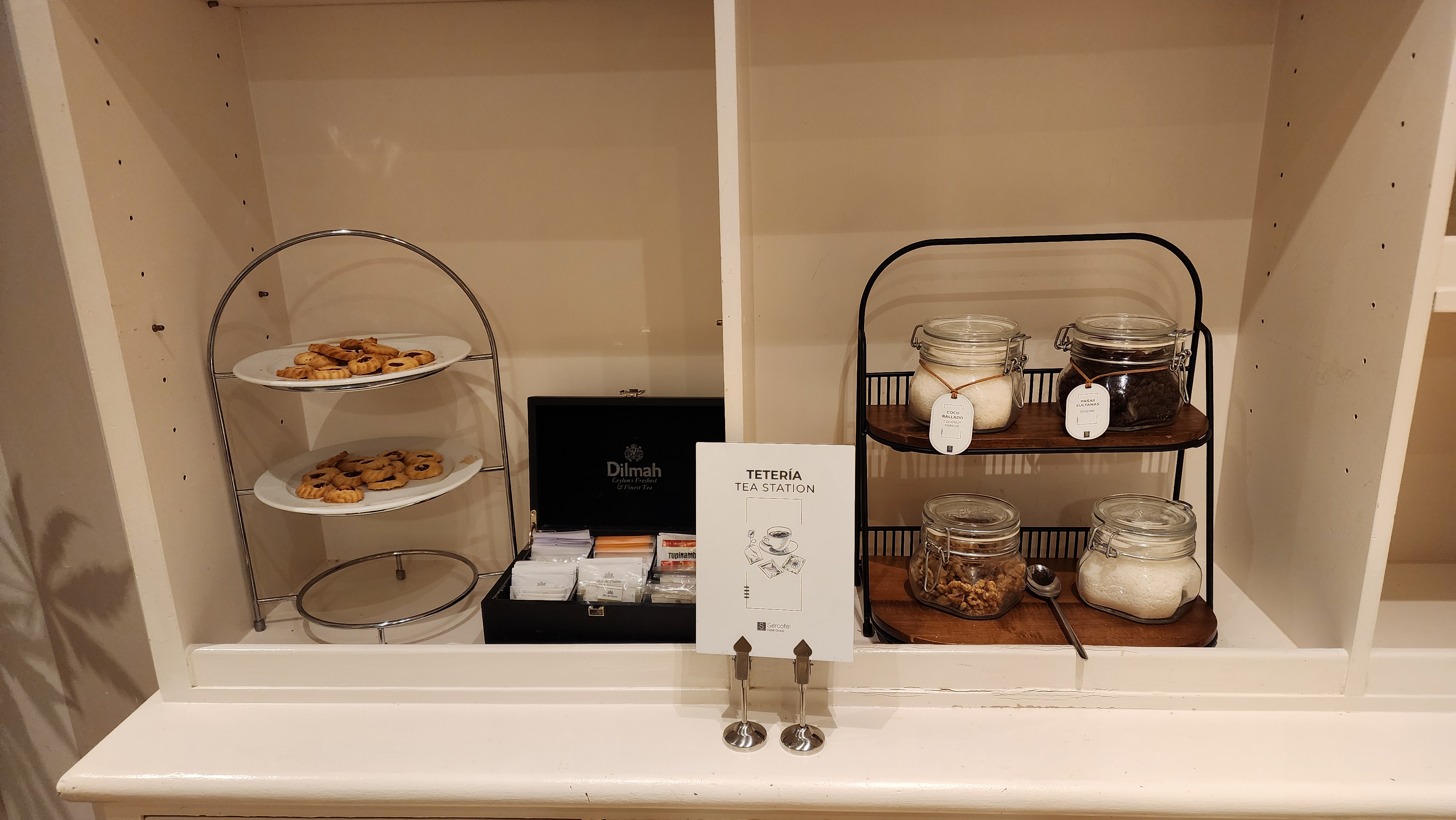차 마시면서 간단하게 먹는 쿠키 등도 놓여있었고요 따뜻한 물은 커피머신으로 이용하면 되더군요.