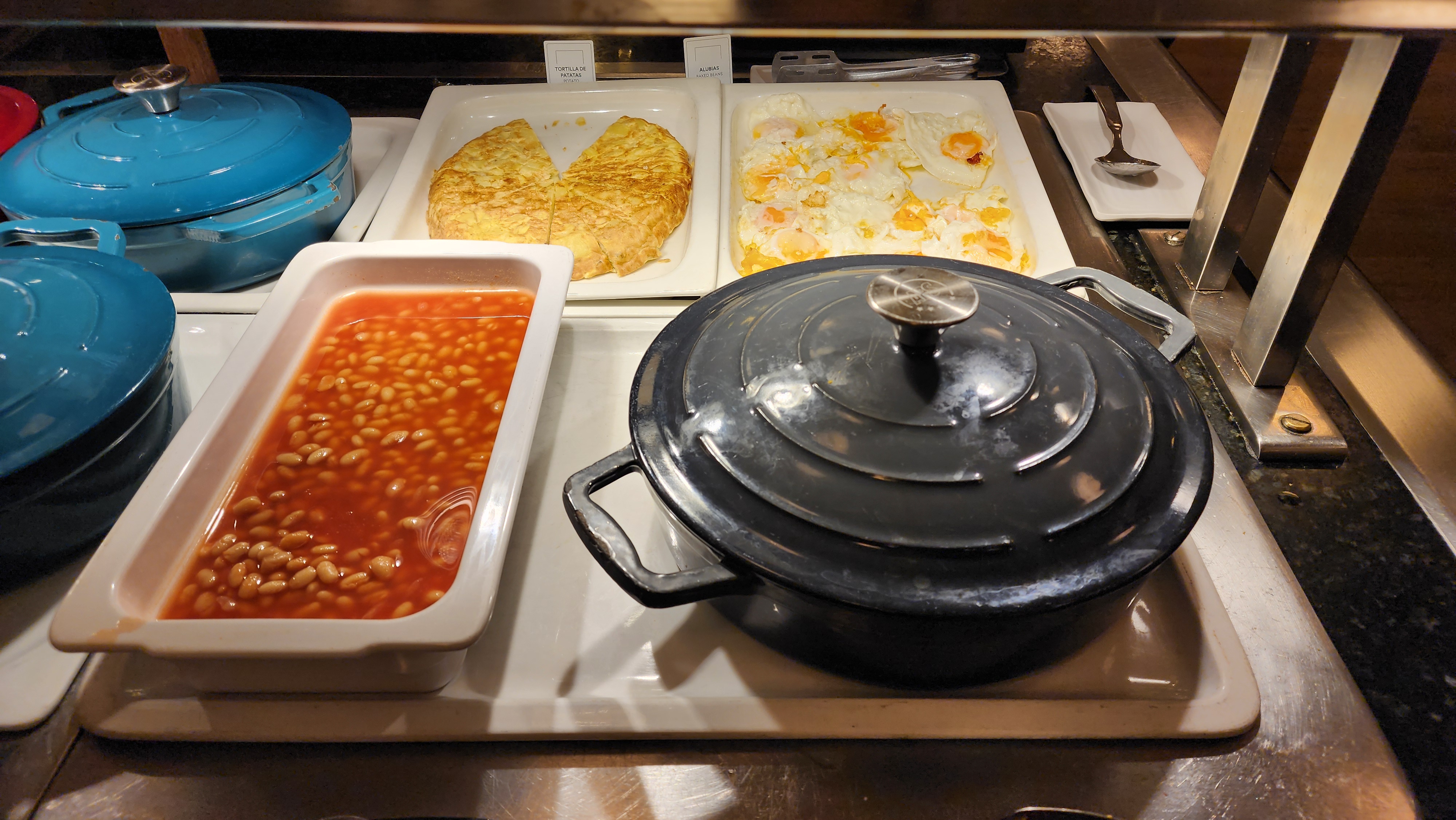 계란후라이는 이미 조리되어 나왔고 스페인식 감자 또띠아(감자케이크 느낌) 음식과 베이크드빈이 있었어요.