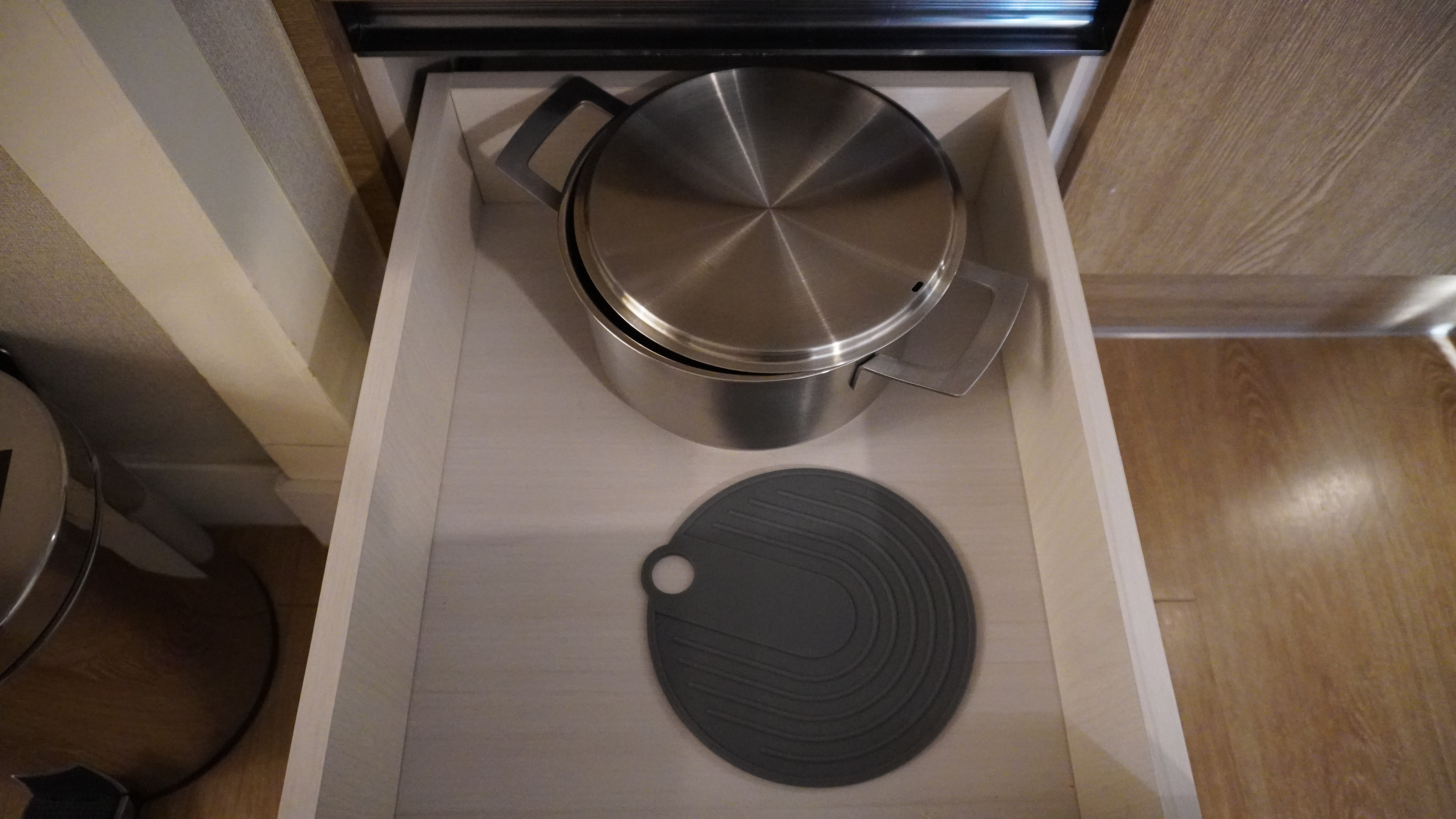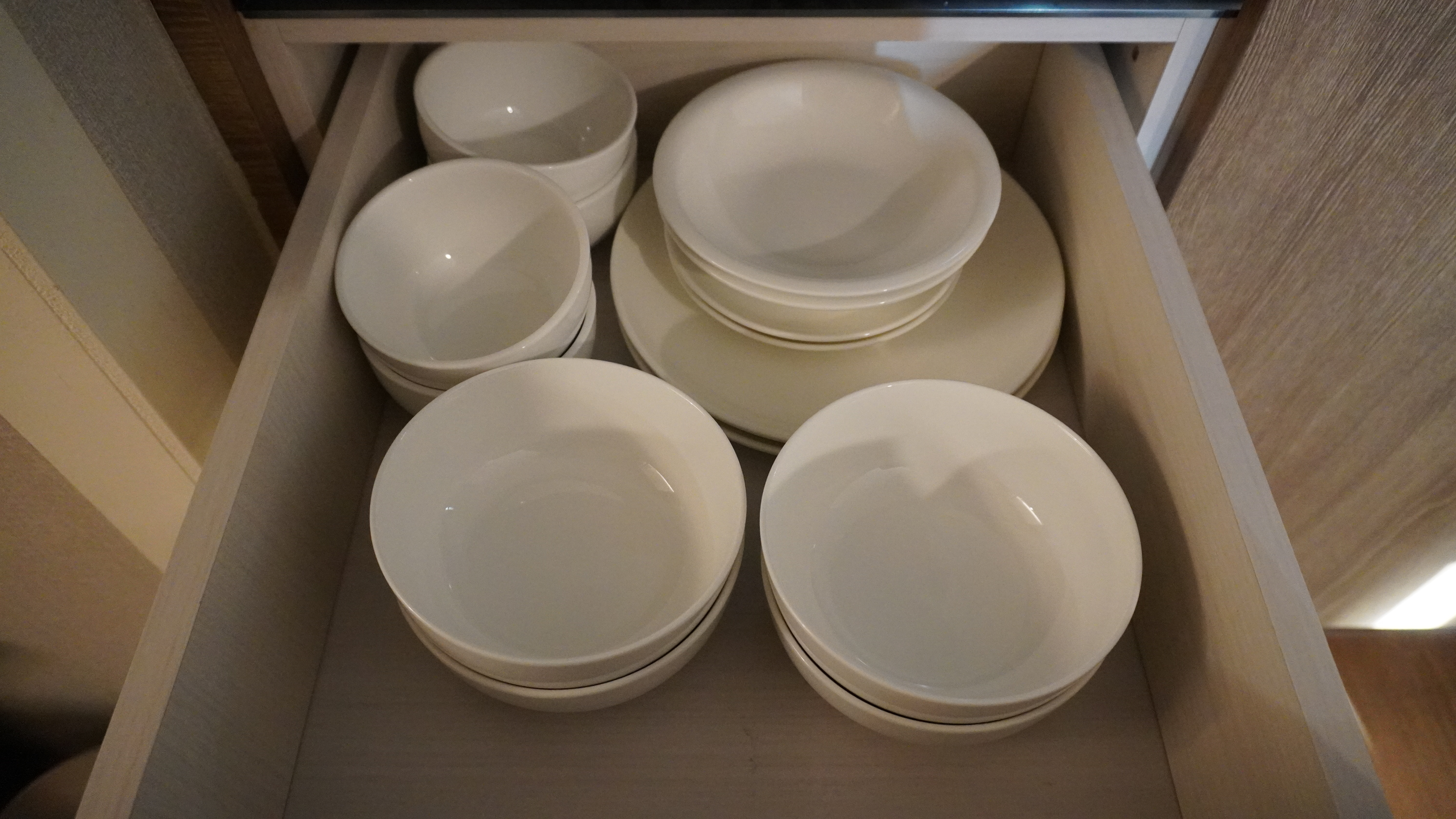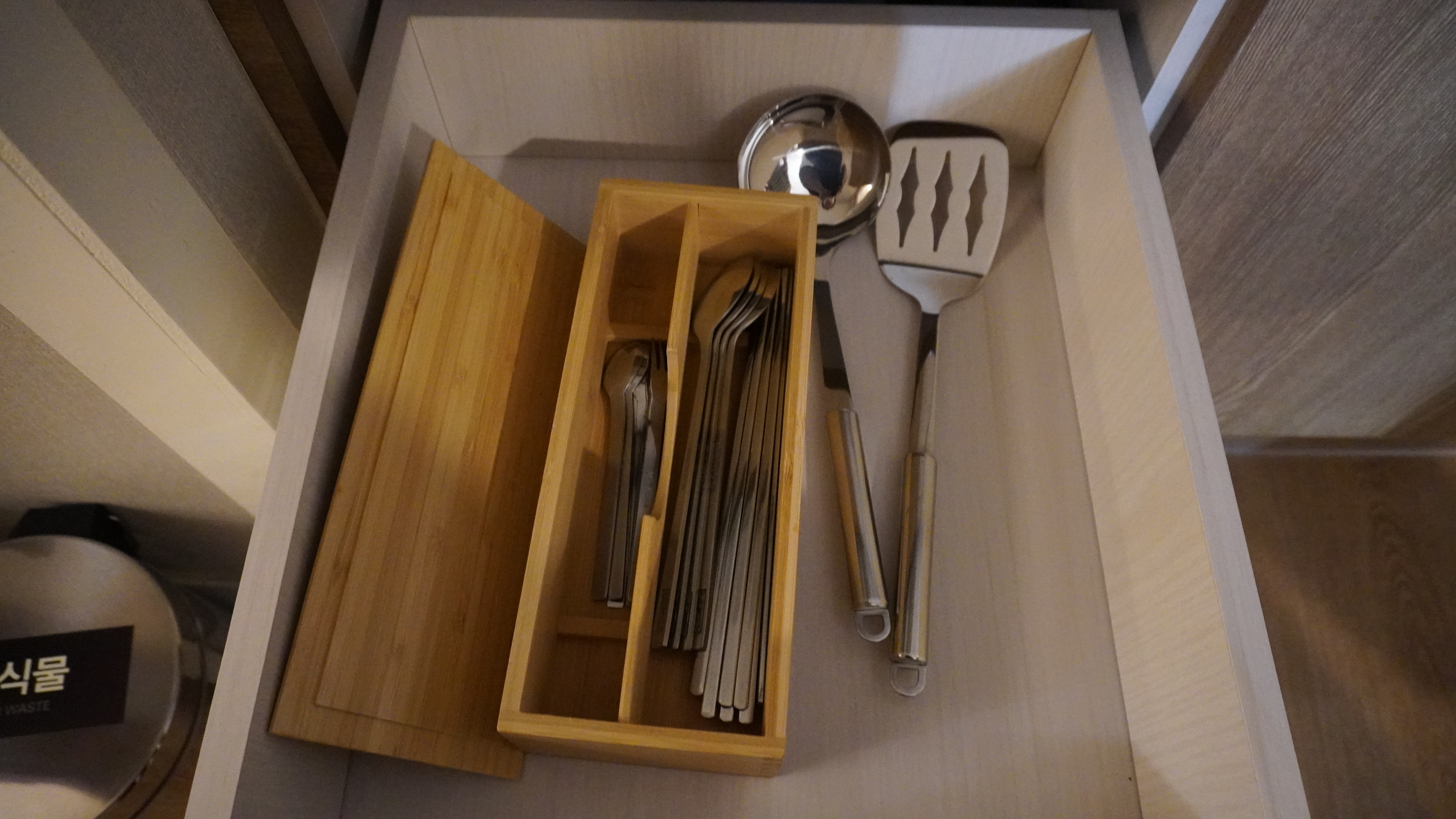 주방 서랍을 열면 식기, 수저, 젓가락, 냄비 등이 있었어요.