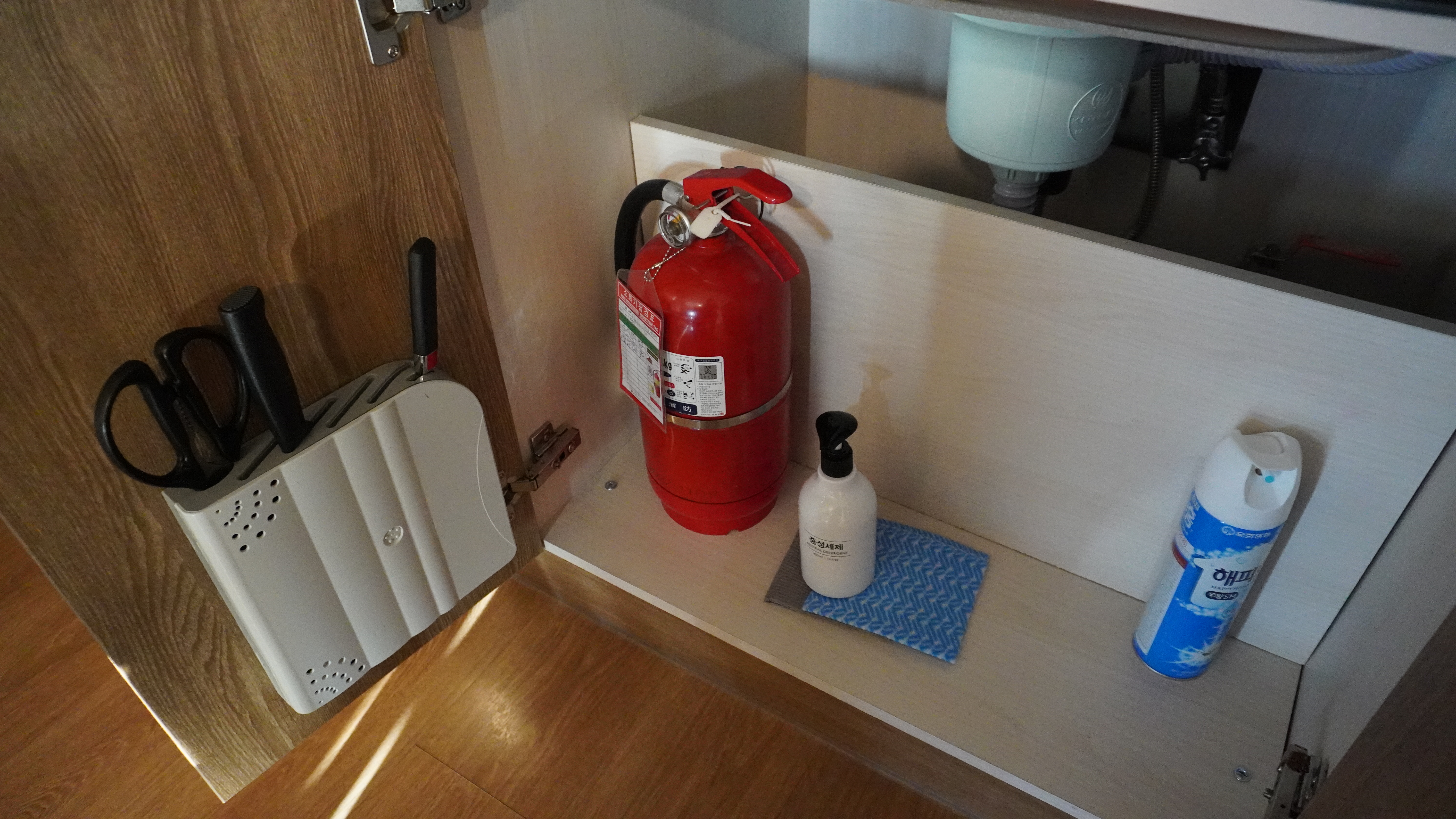세제, 수세미, 행주, 가위, 칼, 소화기, 살충제가 있었어요.