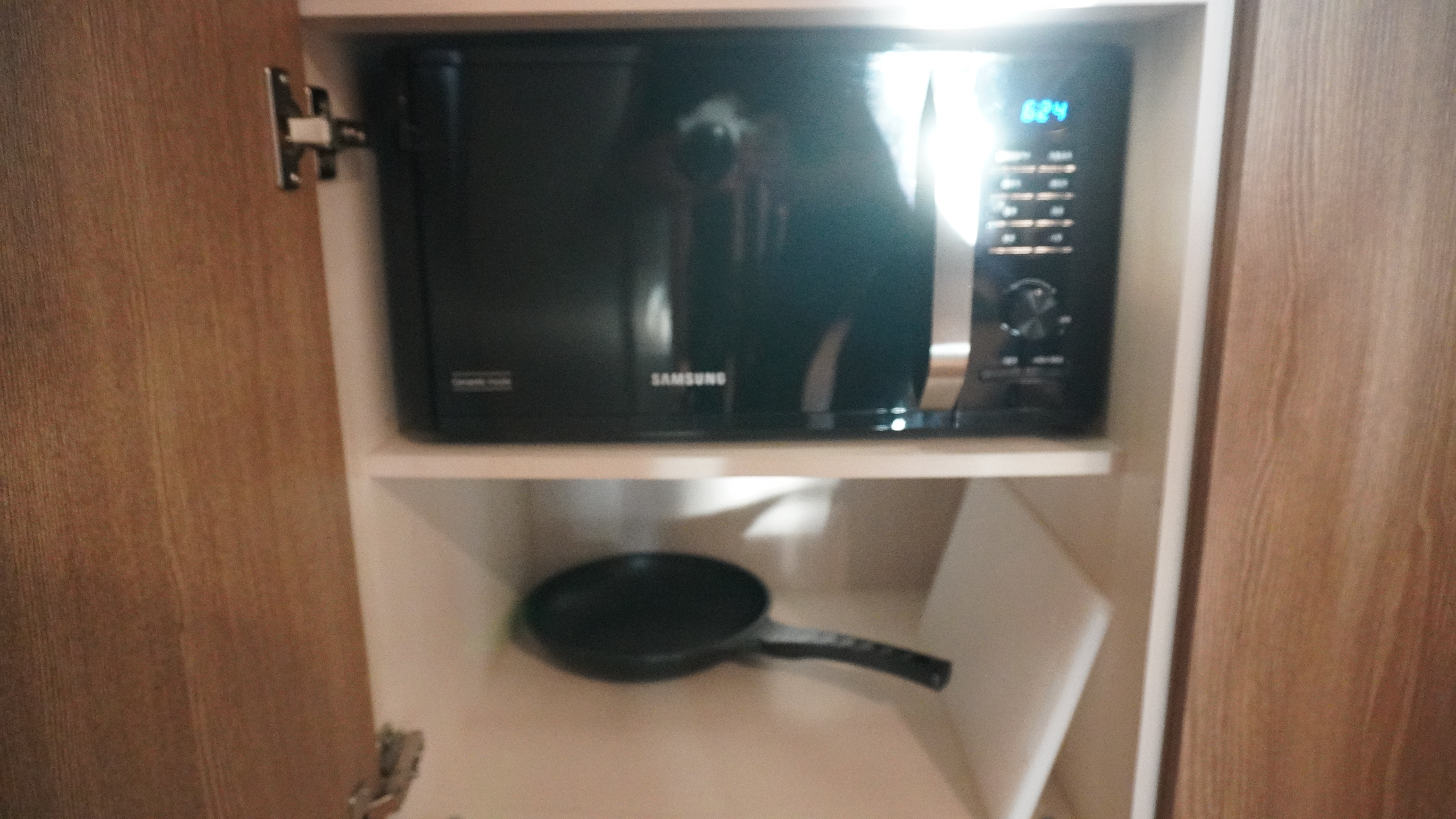 그 아래에는 후라이팬과 도마가 있었는데요 전자렌지 있어서 간단한 음식 데워먹기 좋았어요.